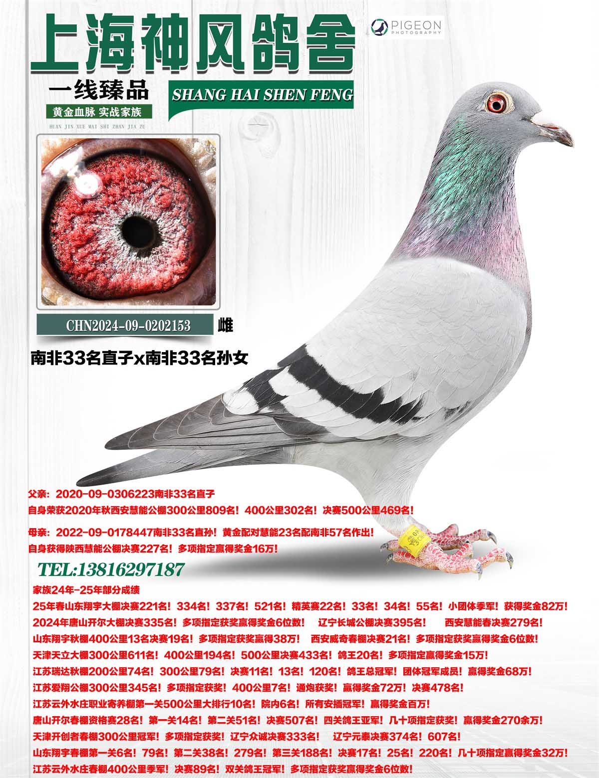 祖母:AU2017-T-33本舍胡本头号中鸽“鸽王缔造者”直女!本身和全平辈后代西安威力。宁夏黄河。安徽万佛。江苏爱翔。浙江先锋。上海君冠。等等众多公棚都有高位获奖!