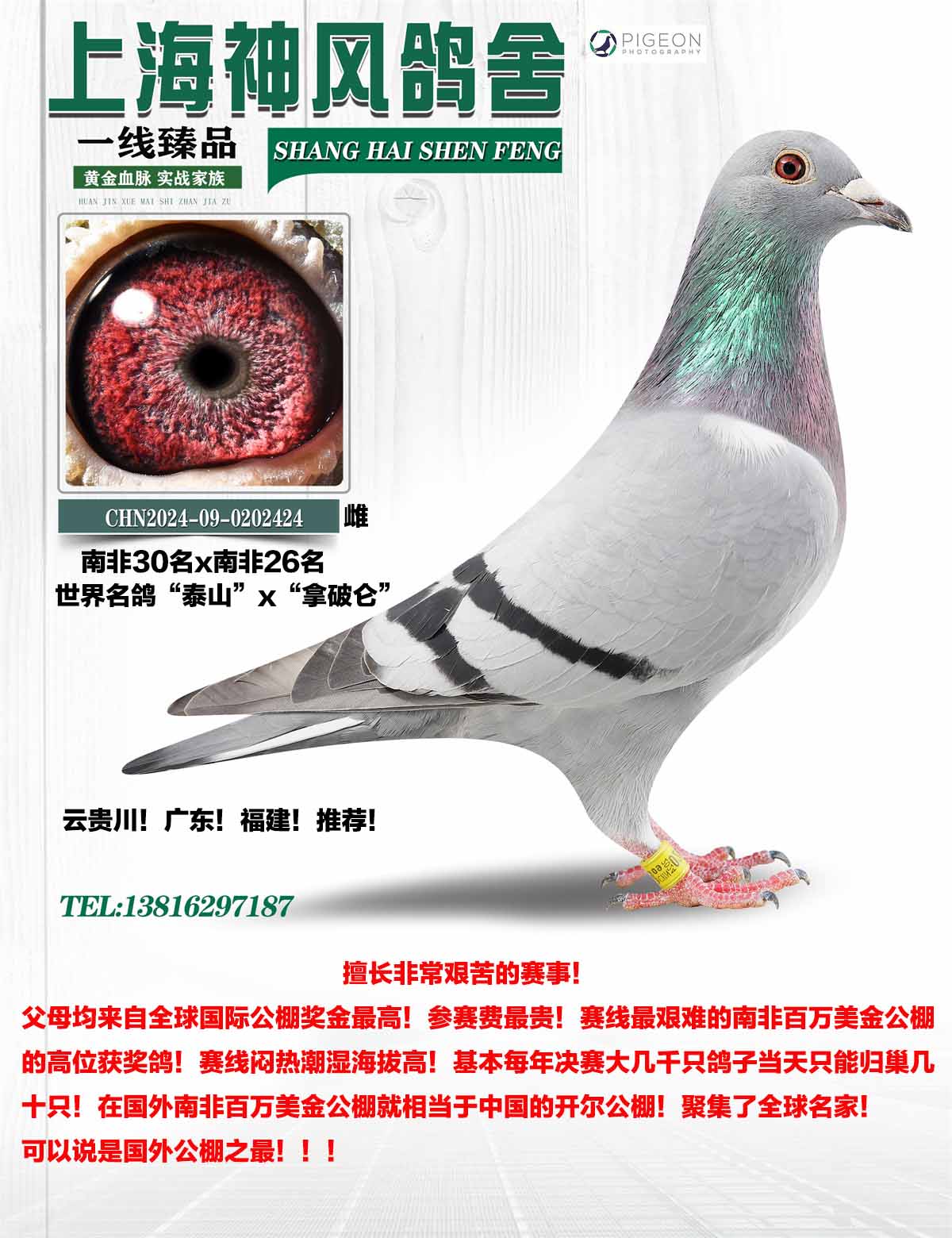 父母均来自全球国际公棚奖金最高!参赛费最贵!赛线最艰难的南非百万美金公棚的高位获奖鸽!赛线闷热潮湿海拔高!基本每年决赛大几千只鸽子当天只能归巢几十只!在国外南非百万美金公棚就相当于中国的开尔公棚!聚集了全球名家!可以说是国外公棚之最!!!