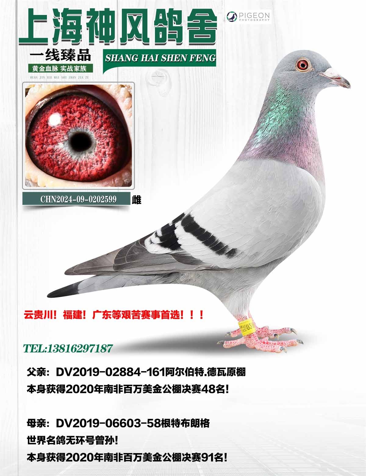 父母均来自国际公棚最高舞台!南非百万美金公棚高位!南非公棚赛线海拔高!闷热潮湿!也是公棚里最艰苦的一条赛线!喜欢打艰难公棚的鸽友可以重点考虑!几年来南非公棚鸽的后代在唐山大开尔!西安慧能!!贵州红枫!东川豪庭!天南铜都!广东海翔!陕西博博等顶级公棚均有高位发挥!