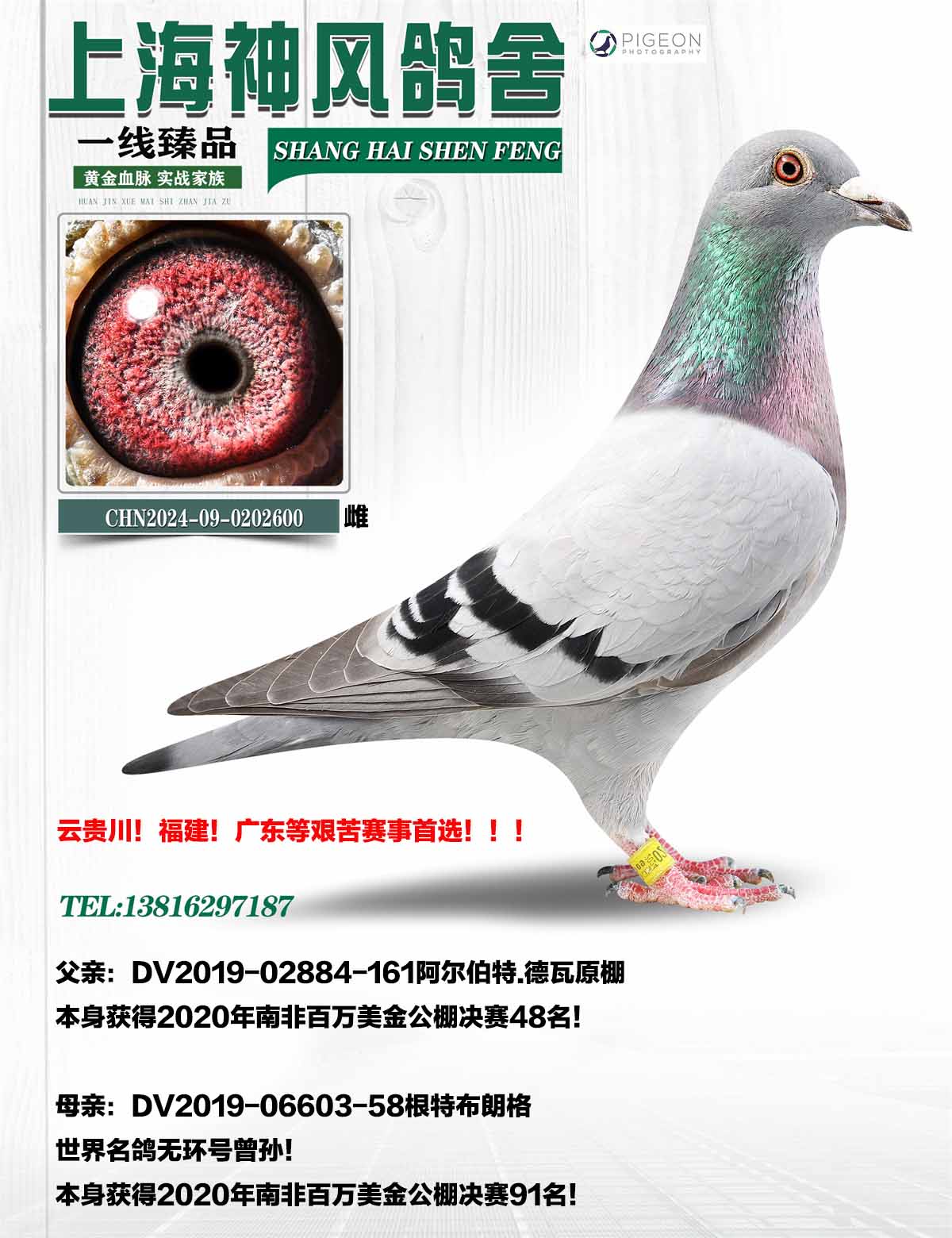 父母均来自国际公棚最高舞台!南非百万美金公棚高位!南非公棚赛线海拔高!闷热潮湿!也是公棚里最艰苦的一条赛线!喜欢打艰难公棚的鸽友可以重点考虑!几年来南非公棚鸽的后代在唐山大开尔!西安慧能!!贵州红枫!东川豪庭!天南铜都!广东海翔!陕西博博等顶级公棚均有高位发挥!