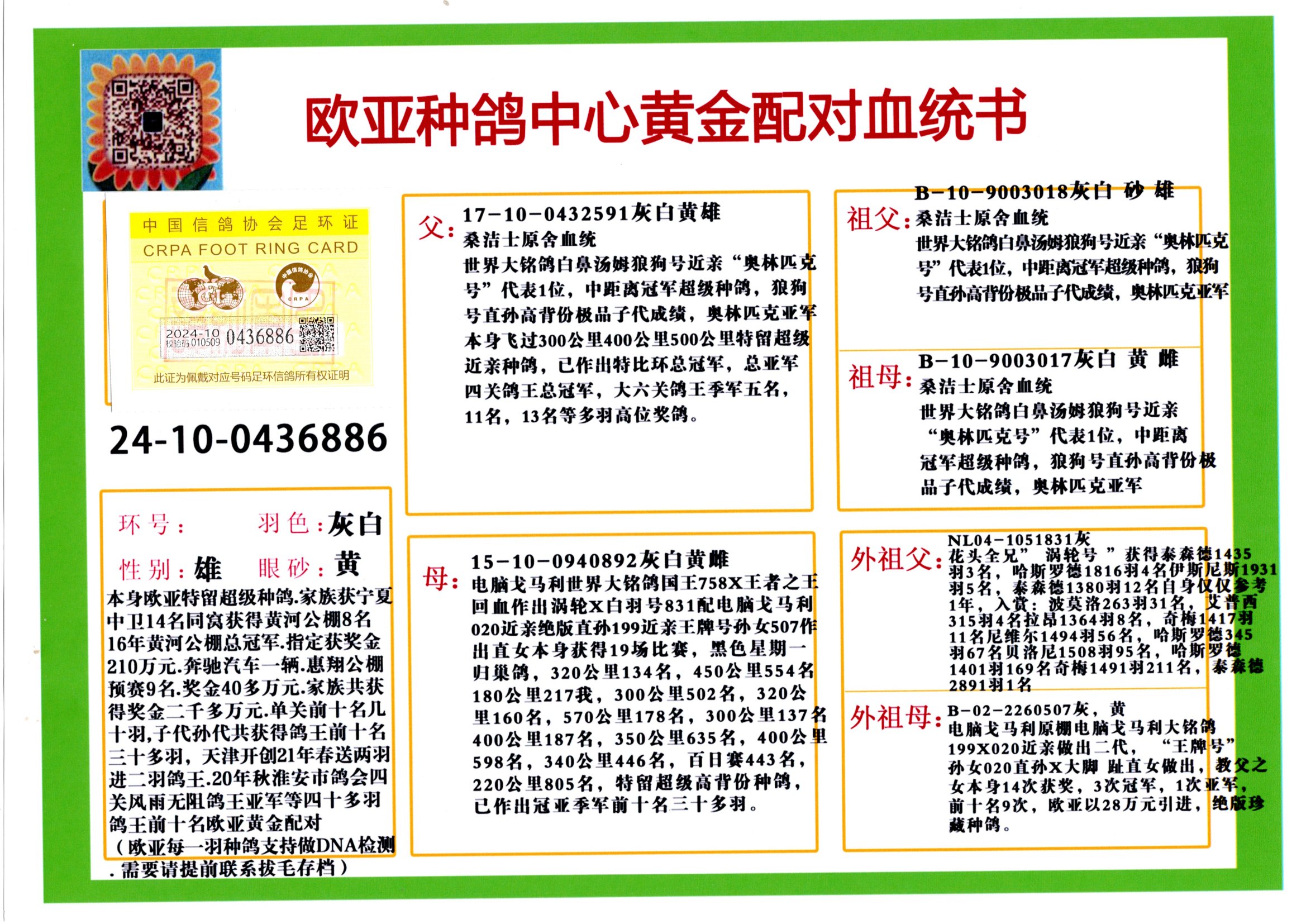 24年秋南京特比环欧亚荣获大团体冠军.小团体冠军551公里大特比13名.14名.16名.19名.20名.21名.24名.26名.27名.28名.42名.52名.54名.57名.65名.66名.68名.70名.71名.72名.74名.76名.80名.82名.83名.84名.85名.86名.90名.92名.110名.116名.121名.122名.128名.131名.158名.161名.164名.165名.166名.172名.174名.177名.182名.195名.196名.201名.205名.208名.210名.216名.253名.269名.275名.276名.294名.296名.299名,,24年秋云南天南铜都公棚决赛415名.天南铜都小棚决赛409名.云南玉活公棚决赛102名.490名.团体32名上笼二羽进二羽,天南铜都大棚506公里决赛445名。热烈祝贺河北省巨鹿县李兰生老师用欧亚泰山号血系连续十一年夺冠军,河北省国家赛冠军.全国季军等多次前十名高位,扬州王军王总用欧亚利奥24年春季获山东翔宇公棚决赛33名盖比53名。南京刘正龙刘总用欧亚盖比获得24年秋山东潍坊国际公棚决赛42名.精英赛30名.三关鸽王71名.决赛86名.加站赛16名.南京市特比环A组鸽王9名.B组鸽王5名.6名.C组鸽王5名.精英赛冠军4名.技能赛A组冠军4名.5名.秦淮区特比环荣获15名.46名.48名.87名。四川西昌徐亮徐总用欧亚利奥获得凉山州聚友决赛177名.第二关亚军双关鸽王19名.三关鸽王105名.云南豪庭公棚决赛603名。热烈祝贺24年四川重庆翔园鸽舍用欧亚泰山号荣获春季400公里冠军.秋季500公里冠军,河北王总用詹森X利奥获得千羽千翔公棚400公里冠军,广东蔡楷焕荣获24年秋爱好者 赛鸽俱乐部三关鸽王季军.一关420公里99名.二关450公里11名.三关520公里32名.单关季军.7名.12名,江西李卫兴荣获贵州红枫公棚8名.共翔俱乐部寄养棚四关综合鸽王30名.一关400公里78名.二关500公里55名.三关520公里37名.四关500公里57名.同父母获公棚18名.雷鸣获得武汉黄浦育翔中心冠军,四川陈文获得四川明鸿俱乐部300公里梦幻2名.3名.4名.9名.10名.13名.14名.15名.31名.34名.40名.41名.42名.43名.69名.71名.72名.73名.74名.94名.95名.97名.98名.99名.419公里决赛荣获总冠军7名.总共归巢9羽,四川徐亮获豪庭决赛603名,山西郑勇获得山西泰鑫公棚决赛255名詹森红狐,热烈祝贺马总获得开尔(飞跃队)决赛9名获奖金1310000万元.第一关52名,天津津福资赛180公里96名.获奖金429543万元,欧亚支持全国鸽友24年秋多人报喜 祝大家取得更好成绩,给欧亚报喜鸽友欧亚决定给每人赠送一羽超级种鸽。欧亚俱乐部特比环多关鸽王成绩:15年秋淮安特比环黑色星期一全会上笼9700多羽,当天无鸽归巢,第二天全会归巢357羽,本舍归巢158羽.前十名八羽.前一百名归巢57羽,16年春季获五关鸽王总冠军,总亚军四名.六名.七名.九名.十名.晶艺俱乐部520公里冠亚季军5名.6名.7名.9名.11名等,火车头冠军.季军6名.8名.9名.10名,16年秋晶艺俱乐部特比环520公里亚军.季军4名.6名.7名.9名,15年春南京白下特比环冠军.亚军.季军6名.7名.8名.9名.10名.指定鸽A B组获得冠军.亚军.季军4名.5名.,17年淮安特比环亚军.4名.5名.7名.8名.10名.六关鸽王总冠军.4名.6名.9名.10名,寄养棚宿迁刘总20羽特比环获冠军.季军.4名.7名.8名.9名等。18年荣获万羽特比环六关鸽王总冠军.总亚军.总季军.6名.8名.十名.单关四羽冠军.二羽亚军.四羽季军.前十名27羽。19年秋万羽特比环六关鸽王总亚军.总季军.5名.8名等,单关二羽冠军.三羽亚军.一羽季军前十名31羽。20年秋淮安市鸽会四关特比环大赛风雨无阻鸽王亚军.鸽王六名,金品俱乐部万羽特比环六关鸽王总冠军,总亚军.四名.五名.六名.七名.八名.十名.前二百名鸽王35羽,单关冠亚季军前十名四十多羽,火车头五关鸽王季军.六名.八名.前二百名鸽王十七羽。20年春荣获淮安五区一市四关鸽王总冠军.亚军.四名.八名.九名。21年秋荣获金品万羽特比环大赛六关鸽王总亚军.总季军.四名.七名.九名.十名.单关冠亚军季军前十名三十多羽。火车头协会鸽王六名.七名.十名.单关前十名十七羽。22年秋荣获鸽王总冠军.总亚军.5名.7名.8名.9名.11名.单关冠亚季军前十名三十多羽,第一关单关前二百名四十多羽,第二关前二百名三十多羽,第三关前二百名四十多羽,第四关前二百名四十多羽,第五关前一百名53羽。23年秋荣获鸽王季军.五名.八名.十名.13名.17名.20名.27名等多羽鸽王.单关前十名二十多羽。公棚.寄养棚部分成绩:16年秋宁夏黄河公棚总冠军电脑戈马力指定通炮冠军,17年送八羽参赛获得鸽王八名进奖四名,支持韩总荣获八名。支持鸽友荣获宁夏中卫公棚决赛总冠军.精英赛冠军,支持18年宁夏黄河公棚决赛冠军詹森X泰山。安徽鼎博寄养棚院内外四关鸽王总冠军.鸽王十七名.三十七名同窝,鸽王39名.42名.58名.67名。18年山东公棚预赛冠军.决赛65名.送八羽进奖五羽.指定获奔驰汽车一辆。支持鸽友获得云南蓝云公棚冠军.盖比X佛卡门。支持鸽友荣获云南银集公棚决赛冠军 詹森427X520血系 速度赛6700羽冠军。17年荣获金马俱乐部寄养棚四关鸽王总冠军.季军.六名.八名.第一关冠军.亚军.季军四名.七名.十一名.金牌教练奖。支持鸽友18年北京费翔公棚预赛九名电脑X桑杰士,支持鸽友荣获陕西威力公棚决赛11名.内蒙古临河寄养棚四关鸽王六名.詹森配泰山,支持河北王总用欧亚詹森427配胡本喜获20年秋开尔青年棚季军。云南东荣公棚16年预赛冠军.决赛77名.17年决赛12名.詹森红狐X泰山,17年平安公棚决赛4名 詹森427。欧亚获得21年金母寄养棚第一关四名.第二关5名.第三关5名.6名.7名.10名.三关鸽王总冠军,四关鸽王14名.十羽鸽王。支持河