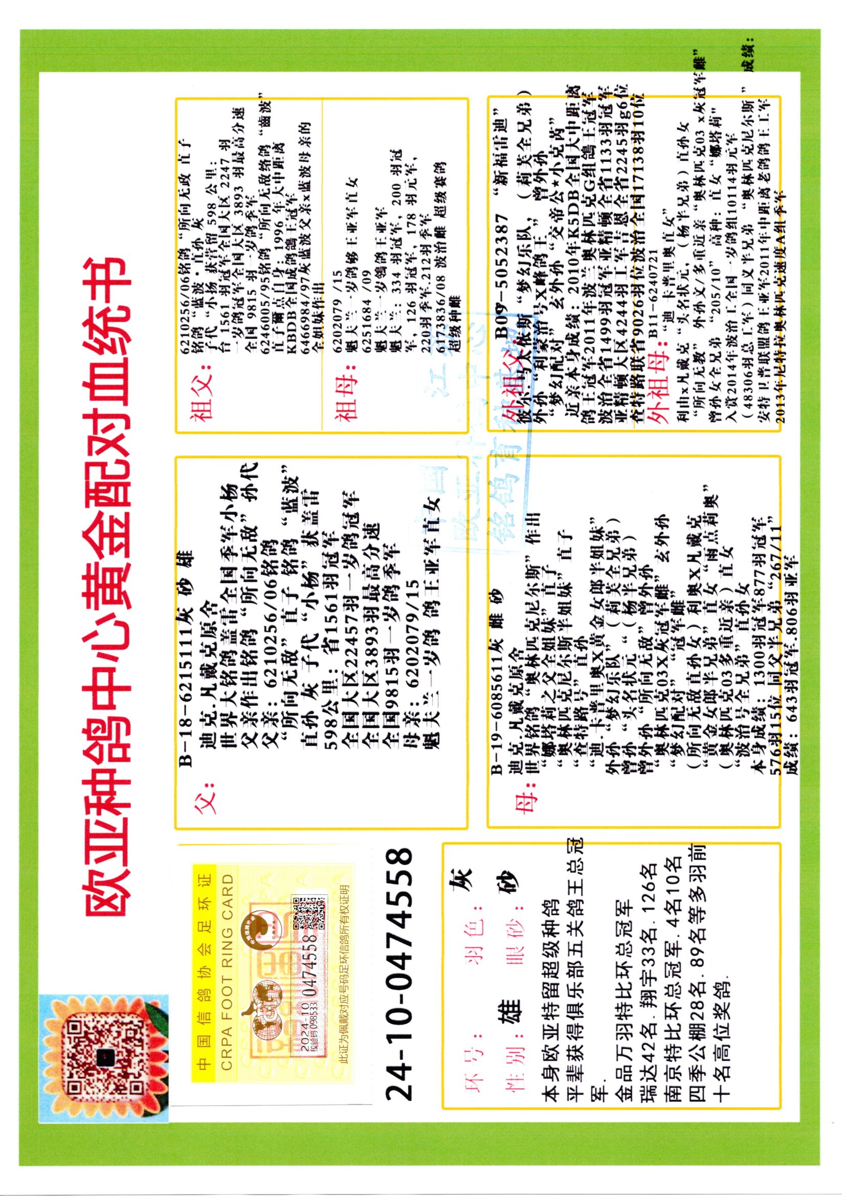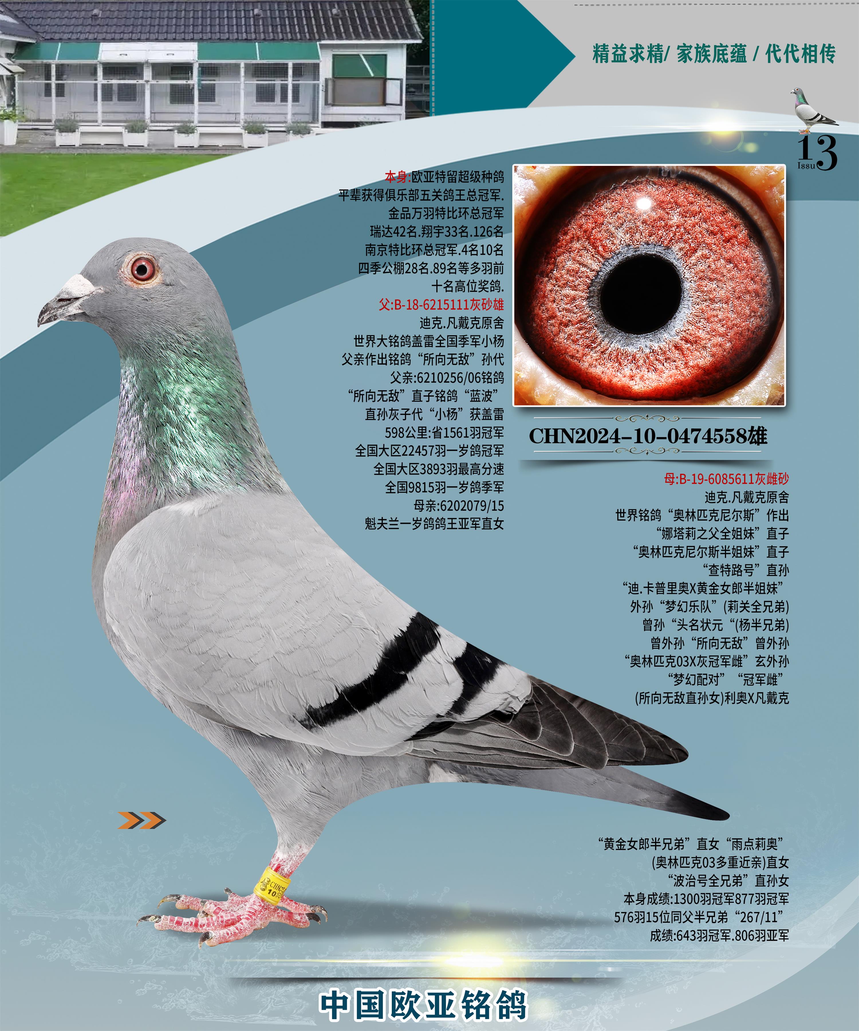 24年秋南京特比环欧亚荣获大团体冠军.小团体冠军551公里大特比13名.14名.16名.19名.20名.21名.24名.26名.27名.28名.42名.52名.54名.57名.65名.66名.68名.70名.71名.72名.74名.76名.80名.82名.83名.84名.85名.86名.90名.92名.110名.116名.121名.122名.128名.131名.158名.161名.164名.165名.166名.172名.174名.177名.182名.195名.196名.201名.205名.208名.210名.216名.253名.269名.275名.276名.294名.296名.299名,,24年秋云南天南铜都公棚决赛415名.天南铜都小棚决赛409名.云南玉活公棚决赛102名.490名.团体32名上笼二羽进二羽,天南铜都大棚506公里决赛445名。热烈祝贺河北省巨鹿县李兰生老师用欧亚泰山号血系连续十一年夺冠军,河北省国家赛冠军.全国季军等多次前十名高位,扬州王军王总用欧亚利奥24年春季获山东翔宇公棚决赛33名盖比53名。南京刘正龙刘总用欧亚盖比获得24年秋山东潍坊国际公棚决赛42名.精英赛30名.三关鸽王71名.决赛86名.加站赛16名.南京市特比环A组鸽王9名.B组鸽王5名.6名.C组鸽王5名.精英赛冠军4名.技能赛A组冠军4名.5名.秦淮区特比环荣获15名.46名.48名.87名。四川西昌徐亮徐总用欧亚利奥获得凉山州聚友决赛177名.第二关亚军双关鸽王19名.三关鸽王105名.云南豪庭公棚决赛603名。热烈祝贺24年四川重庆翔园鸽舍用欧亚泰山号荣获春季400公里冠军.秋季500公里冠军,河北王总用詹森X利奥获得千羽千翔公棚400公里冠军,广东蔡楷焕荣获24年秋爱好者 赛鸽俱乐部三关鸽王季军.一关420公里99名.二关450公里11名.三关520公里32名.单关季军.7名.12名,江西李卫兴荣获贵州红枫公棚8名.共翔俱乐部寄养棚四关综合鸽王30名.一关400公里78名.二关500公里55名.三关520公里37名.四关500公里57名.同父母获公棚18名.雷鸣获得武汉黄浦育翔中心冠军,四川陈文获得四川明鸿俱乐部300公里梦幻2名.3名.4名.9名.10名.13名.14名.15名.31名.34名.40名.41名.42名.43名.69名.71名.72名.73名.74名.94名.95名.97名.98名.99名.419公里决赛荣获总冠军7名.总共归巢9羽,四川徐亮获豪庭决赛603名,山西郑勇获得山西泰鑫公棚决赛255名詹森红狐,热烈祝贺马总获得开尔(飞跃队)决赛9名获奖金1310000万元.第一关52名,天津津福资赛180公里96名.获奖金429543万元,欧亚支持全国鸽友24年秋多人报喜 祝大家取得更好成绩,给欧亚报喜鸽友欧亚决定给每人赠送一羽超级种鸽。欧亚俱乐部特比环多关鸽王成绩:15年秋淮安特比环黑色星期一全会上笼9700多羽,当天无鸽归巢,第二天全会归巢357羽,本舍归巢158羽.前十名八羽.前一百名归巢57羽,16年春季获五关鸽王总冠军,总亚军四名.六名.七名.九名.十名.晶艺俱乐部520公里冠亚季军5名.6名.7名.9名.11名等,火车头冠军.季军6名.8名.9名.10名,16年秋晶艺俱乐部特比环520公里亚军.季军4名.6名.7名.9名,15年春南京白下特比环冠军.亚军.季军6名.7名.8名.9名.10名.指定鸽A B组获得冠军.亚军.季军4名.5名.,17年淮安特比环亚军.4名.5名.7名.8名.10名.六关鸽王总冠军.4名.6名.9名.10名,寄养棚宿迁刘总20羽特比环获冠军.季军.4名.7名.8名.9名等。18年荣获万羽特比环六关鸽王总冠军.总亚军.总季军.6名.8名.十名.单关四羽冠军.二羽亚军.四羽季军.前十名27羽。19年秋万羽特比环六关鸽王总亚军.总季军.5名.8名等,单关二羽冠军.三羽亚军.一羽季军前十名31羽。20年秋淮安市鸽会四关特比环大赛风雨无阻鸽王亚军.鸽王六名,金品俱乐部万羽特比环六关鸽王总冠军,总亚军.四名.五名.六名.七名.八名.十名.前二百名鸽王35羽,单关冠亚季军前十名四十多羽,火车头五关鸽王季军.六名.八名.前二百名鸽王十七羽。20年春荣获淮安五区一市四关鸽王总冠军.亚军.四名.八名.九名。21年秋荣获金品万羽特比环大赛六关鸽王总亚军.总季军.四名.七名.九名.十名.单关冠亚军季军前十名三十多羽。火车头协会鸽王六名.七名.十名.单关前十名十七羽。22年秋荣获鸽王总冠军.总亚军.5名.7名.8名.9名.11名.单关冠亚季军前十名三十多羽,第一关单关前二百名四十多羽,第二关前二百名三十多羽,第三关前二百名四十多羽,第四关前二百名四十多羽,第五关前一百名53羽。23年秋荣获鸽王季军.五名.八名.十名.13名.17名.20名.27名等多羽鸽王.单关前十名二十多羽。公棚.寄养棚部分成绩:16年秋宁夏黄河公棚总冠军电脑戈马力指定通炮冠军,17年送八羽参赛获得鸽王八名进奖四名,支持韩总荣获八名。支持鸽友荣获宁夏中卫公棚决赛总冠军.精英赛冠军,支持18年宁夏黄河公棚决赛冠军詹森X泰山。安徽鼎博寄养棚院内外四关鸽王总冠军.鸽王十七名.三十七名同窝,鸽王39名.42名.58名.67名。18年山东公棚预赛冠军.决赛65名.送八羽进奖五羽.指定获奔驰汽车一辆。支持鸽友获得云南蓝云公棚冠军.盖比X佛卡门。支持鸽友荣获云南银集公棚决赛冠军 詹森427X520血系 速度赛6700羽冠军。17年荣获金马俱乐部寄养棚四关鸽王总冠军.季军.六名.八名.第一关冠军.亚军.季军四名.七名.十一名.金牌教练奖。支持鸽友18年北京费翔公棚预赛九名电脑X桑杰士,支持鸽友荣获陕西威力公棚决赛11名.内蒙古临河寄养棚四关鸽王六名.詹森配泰山,支持河北王总用欧亚詹森427配胡本喜获20年秋开尔青年棚季军。云南东荣公棚16年预赛冠军.决赛77名.17年决赛12名.詹森红狐X泰山,17年平安公棚决赛4名 詹森427。欧亚获得21年金母寄养棚第一关四名.第二关5名.第三关5名.6名.7名.10名.三关鸽王总冠军,四关鸽王14名.十羽鸽王。支持河