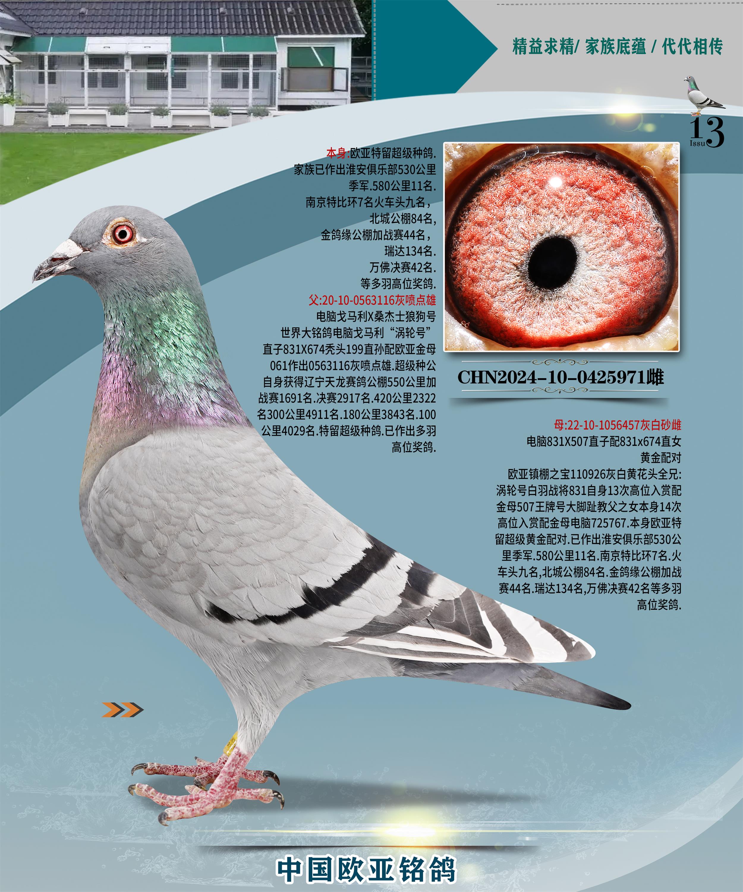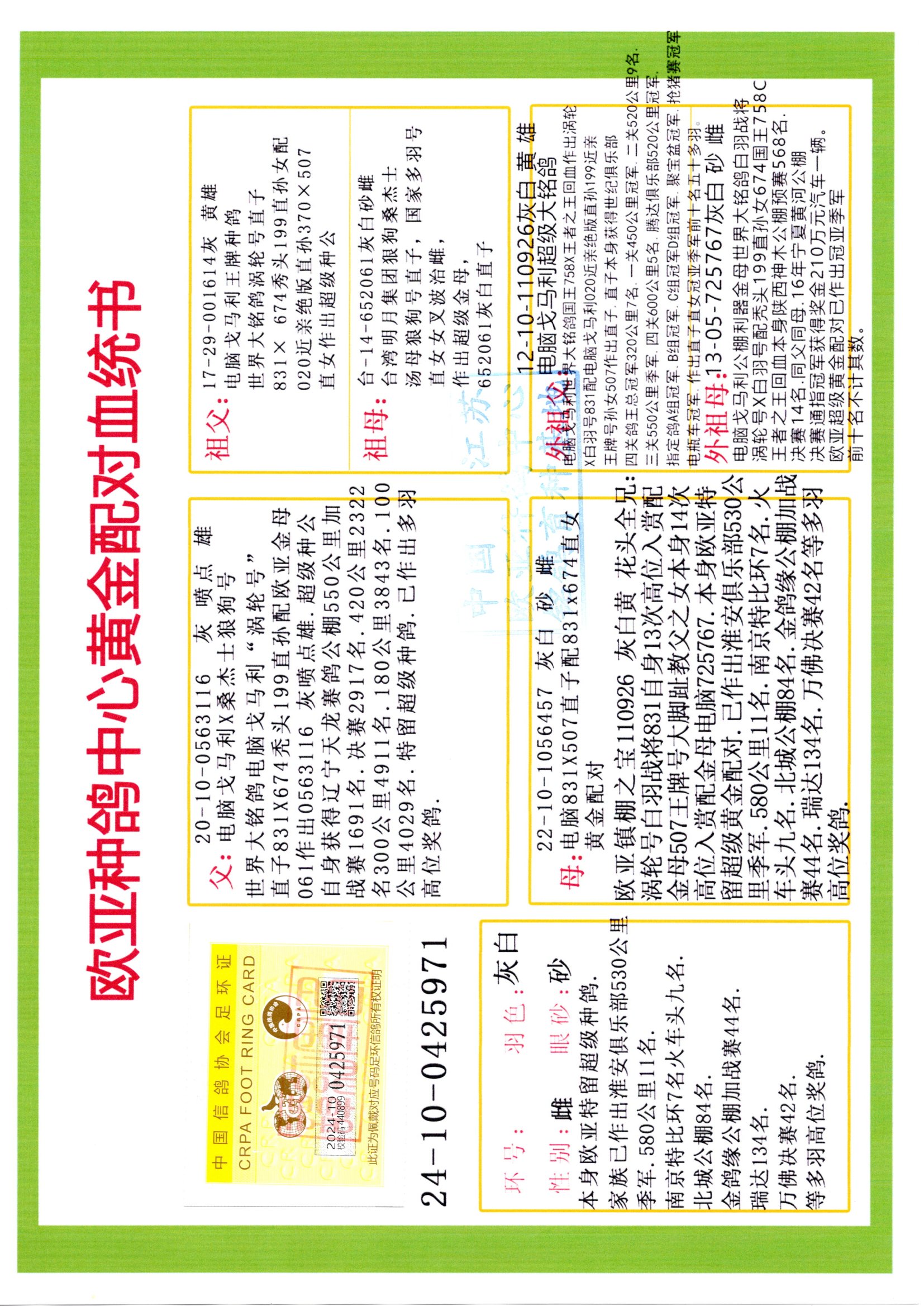 24年秋南京特比环欧亚荣获大团体冠军.小团体冠军551公里大特比13名.14名.16名.19名.20名.21名.24名.26名.27名.28名.42名.52名.54名.57名.65名.66名.68名.70名.71名.72名.74名.76名.80名.82名.83名.84名.85名.86名.90名.92名.110名.116名.121名.122名.128名.131名.158名.161名.164名.165名.166名.172名.174名.177名.182名.195名.196名.201名.205名.208名.210名.216名.253名.269名.275名.276名.294名.296名.299名,,24年秋云南天南铜都公棚决赛415名.天南铜都小棚决赛409名.云南玉活公棚决赛102名.490名.团体32名上笼二羽进二羽,天南铜都大棚506公里决赛445名。热烈祝贺河北省巨鹿县李兰生老师用欧亚泰山号血系连续十一年夺冠军,河北省国家赛冠军.全国季军等多次前十名高位,扬州王军王总用欧亚利奥24年春季获山东翔宇公棚决赛33名盖比53名。南京刘正龙刘总用欧亚盖比获得24年秋山东潍坊国际公棚决赛42名.精英赛30名.三关鸽王71名.决赛86名.加站赛16名.南京市特比环A组鸽王9名.B组鸽王5名.6名.C组鸽王5名.精英赛冠军4名.技能赛A组冠军4名.5名.秦淮区特比环荣获15名.46名.48名.87名。四川西昌徐亮徐总用欧亚利奥获得凉山州聚友决赛177名.第二关亚军双关鸽王19名.三关鸽王105名.云南豪庭公棚决赛603名。热烈祝贺24年四川重庆翔园鸽舍用欧亚泰山号荣获春季400公里冠军.秋季500公里冠军,河北王总用詹森X利奥获得千羽千翔公棚400公里冠军,广东蔡楷焕荣获24年秋爱好者 赛鸽俱乐部三关鸽王季军.一关420公里99名.二关450公里11名.三关520公里32名.单关季军.7名.12名,江西李卫兴荣获贵州红枫公棚8名.共翔俱乐部寄养棚四关综合鸽王30名.一关400公里78名.二关500公里55名.三关520公里37名.四关500公里57名.同父母获公棚18名.雷鸣获得武汉黄浦育翔中心冠军,四川陈文获得四川明鸿俱乐部300公里梦幻2名.3名.4名.9名.10名.13名.14名.15名.31名.34名.40名.41名.42名.43名.69名.71名.72名.73名.74名.94名.95名.97名.98名.99名.419公里决赛荣获总冠军7名.总共归巢9羽,四川徐亮获豪庭决赛603名,山西郑勇获得山西泰鑫公棚决赛255名詹森红狐,热烈祝贺马总获得开尔(飞跃队)决赛9名获奖金1310000万元.第一关52名,天津津福资赛180公里96名.获奖金429543万元,欧亚支持全国鸽友24年秋多人报喜 祝大家取得更好成绩,给欧亚报喜鸽友欧亚决定给每人赠送一羽超级种鸽。欧亚俱乐部特比环多关鸽王成绩:15年秋淮安特比环黑色星期一全会上笼9700多羽,当天无鸽归巢,第二天全会归巢357羽,本舍归巢158羽.前十名八羽.前一百名归巢57羽,16年春季获五关鸽王总冠军,总亚军四名.六名.七名.九名.十名.晶艺俱乐部520公里冠亚季军5名.6名.7名.9名.11名等,火车头冠军.季军6名.8名.9名.10名,16年秋晶艺俱乐部特比环520公里亚军.季军4名.6名.7名.9名,15年春南京白下特比环冠军.亚军.季军6名.7名.8名.9名.10名.指定鸽A B组获得冠军.亚军.季军4名.5名.,17年淮安特比环亚军.4名.5名.7名.8名.10名.六关鸽王总冠军.4名.6名.9名.10名,寄养棚宿迁刘总20羽特比环获冠军.季军.4名.7名.8名.9名等。18年荣获万羽特比环六关鸽王总冠军.总亚军.总季军.6名.8名.十名.单关四羽冠军.二羽亚军.四羽季军.前十名27羽。19年秋万羽特比环六关鸽王总亚军.总季军.5名.8名等,单关二羽冠军.三羽亚军.一羽季军前十名31羽。20年秋淮安市鸽会四关特比环大赛风雨无阻鸽王亚军.鸽王六名,金品俱乐部万羽特比环六关鸽王总冠军,总亚军.四名.五名.六名.七名.八名.十名.前二百名鸽王35羽,单关冠亚季军前十名四十多羽,火车头五关鸽王季军.六名.八名.前二百名鸽王十七羽。20年春荣获淮安五区一市四关鸽王总冠军.亚军.四名.八名.九名。21年秋荣获金品万羽特比环大赛六关鸽王总亚军.总季军.四名.七名.九名.十名.单关冠亚军季军前十名三十多羽。火车头协会鸽王六名.七名.十名.单关前十名十七羽。22年秋荣获鸽王总冠军.总亚军.5名.7名.8名.9名.11名.单关冠亚季军前十名三十多羽,第一关单关前二百名四十多羽,第二关前二百名三十多羽,第三关前二百名四十多羽,第四关前二百名四十多羽,第五关前一百名53羽。23年秋荣获鸽王季军.五名.八名.十名.13名.17名.20名.27名等多羽鸽王.单关前十名二十多羽。公棚.寄养棚部分成绩:16年秋宁夏黄河公棚总冠军电脑戈马力指定通炮冠军,17年送八羽参赛获得鸽王八名进奖四名,支持韩总荣获八名。支持鸽友荣获宁夏中卫公棚决赛总冠军.精英赛冠军,支持18年宁夏黄河公棚决赛冠军詹森X泰山。安徽鼎博寄养棚院内外四关鸽王总冠军.鸽王十七名.三十七名同窝,鸽王39名.42名.58名.67名。18年山东公棚预赛冠军.决赛65名.送八羽进奖五羽.指定获奔驰汽车一辆。支持鸽友获得云南蓝云公棚冠军.盖比X佛卡门。支持鸽友荣获云南银集公棚决赛冠军 詹森427X520血系 速度赛6700羽冠军。17年荣获金马俱乐部寄养棚四关鸽王总冠军.季军.六名.八名.第一关冠军.亚军.季军四名.七名.十一名.金牌教练奖。支持鸽友18年北京费翔公棚预赛九名电脑X桑杰士,支持鸽友荣获陕西威力公棚决赛11名.内蒙古临河寄养棚四关鸽王六名.詹森配泰山,支持河北王总用欧亚詹森427配胡本喜获20年秋开尔青年棚季军。云南东荣公棚16年预赛冠军.决赛77名.17年决赛12名.詹森红狐X泰山,17年平安公棚决赛4名 詹森427。欧亚获得21年金母寄养棚第一关四名.第二关5名.第三关5名.6名.7名.10名.三关鸽王总冠军,四关鸽王14名.十羽鸽王。支持河