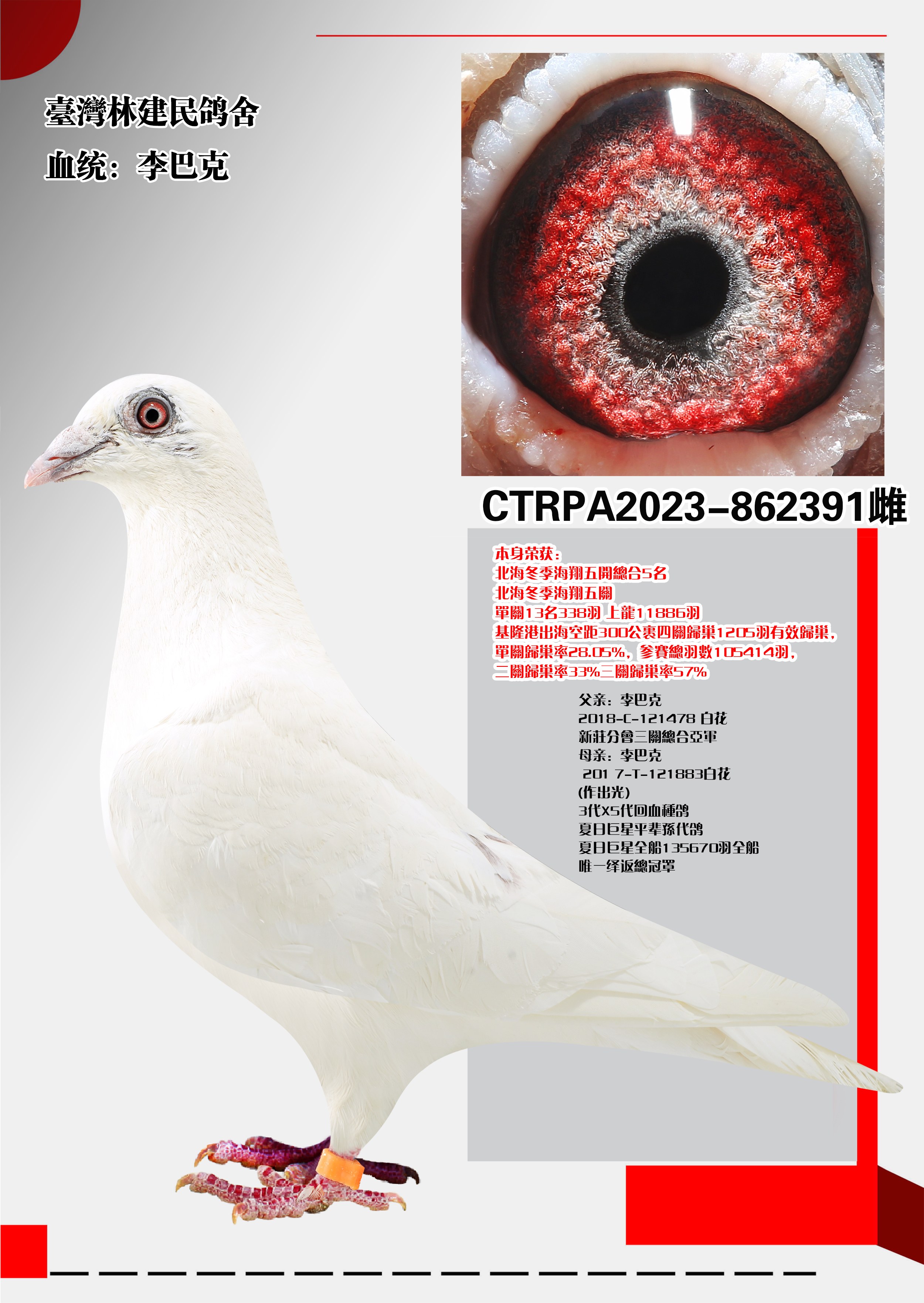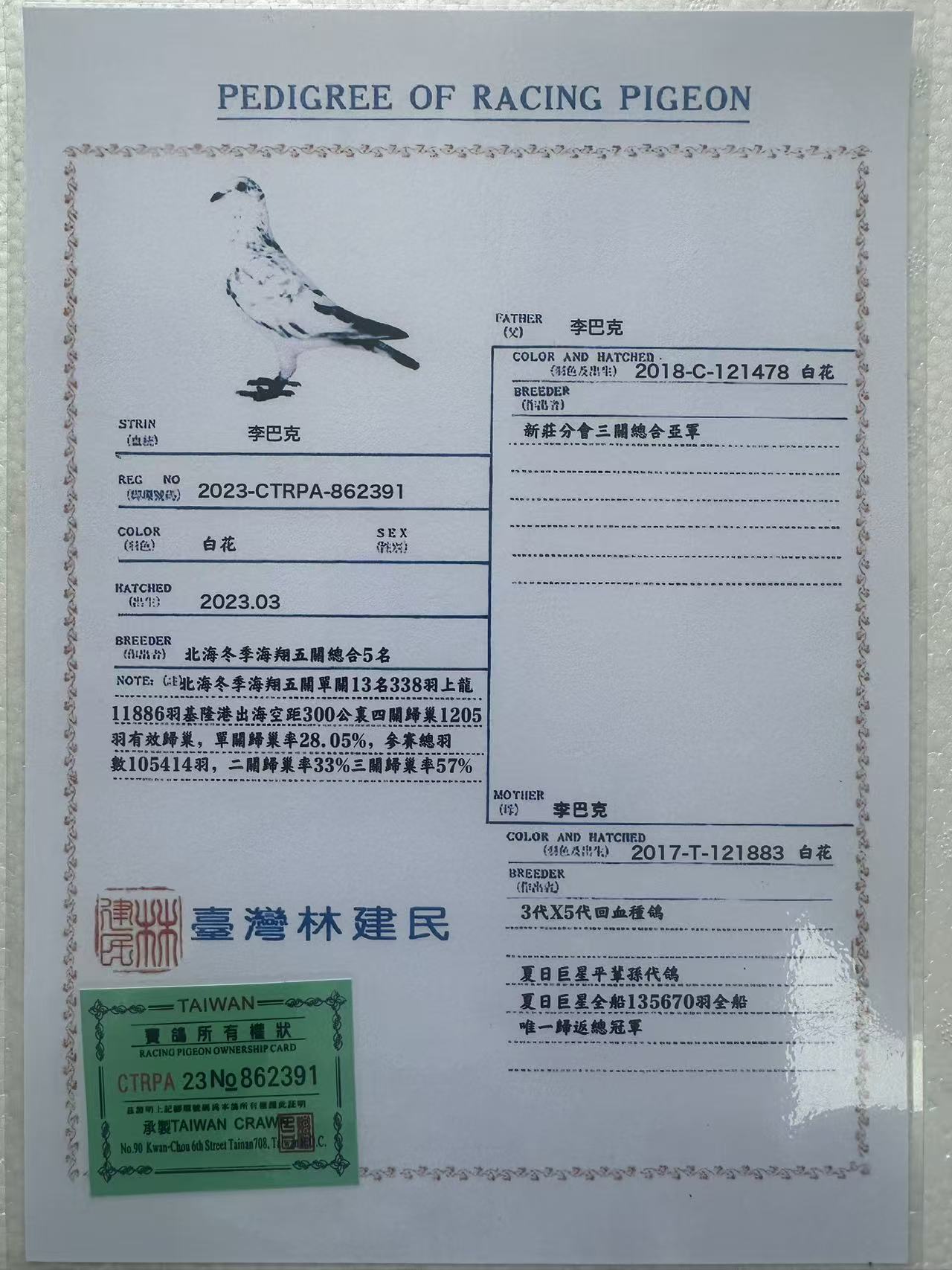 - 当前查看拍卖鸽:台湾林健民鸽舍“李巴克“ 五关综合5名