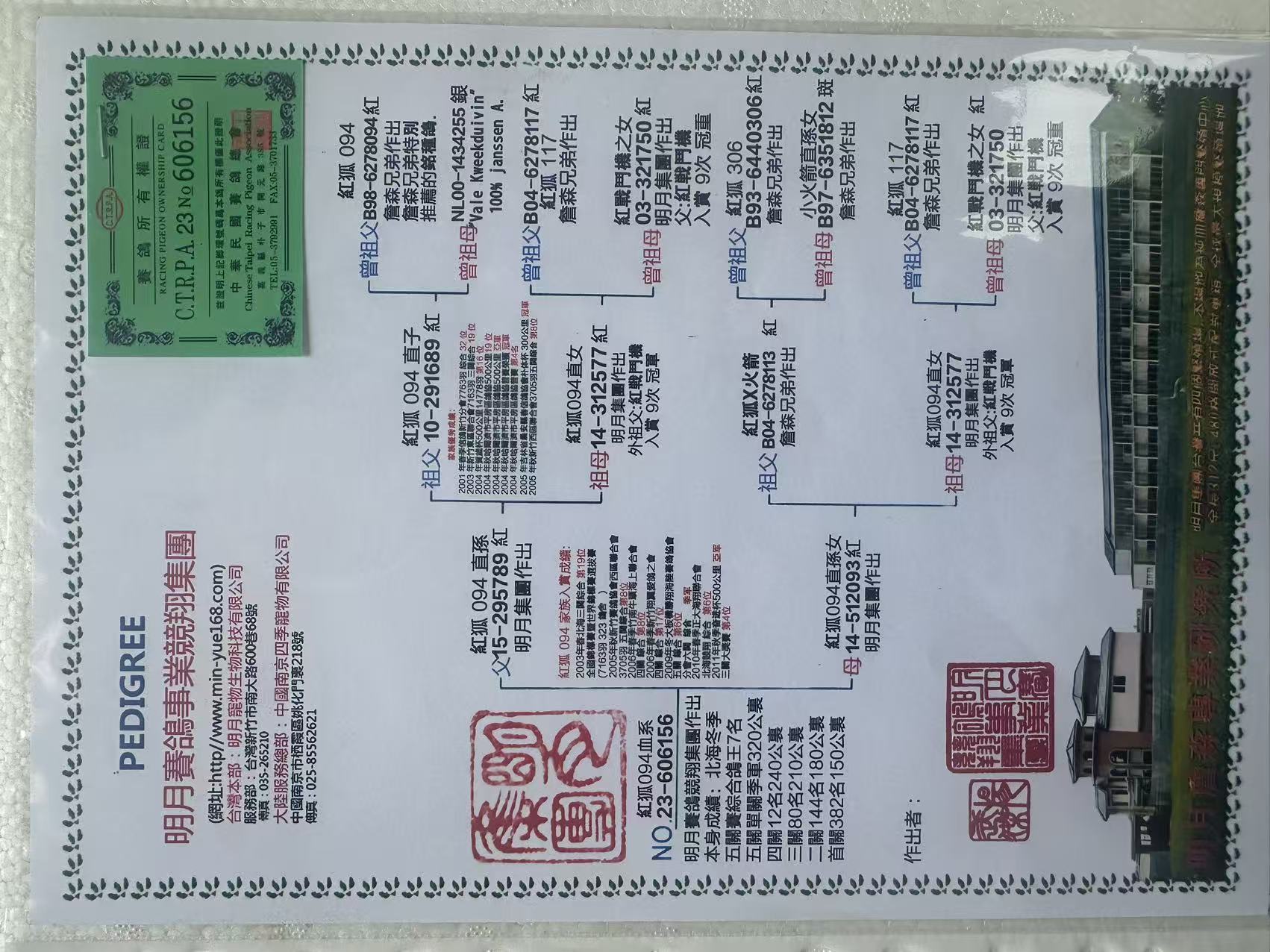 - 当前查看拍卖鸽:台湾明月赛鸽作出“红狐094血系”