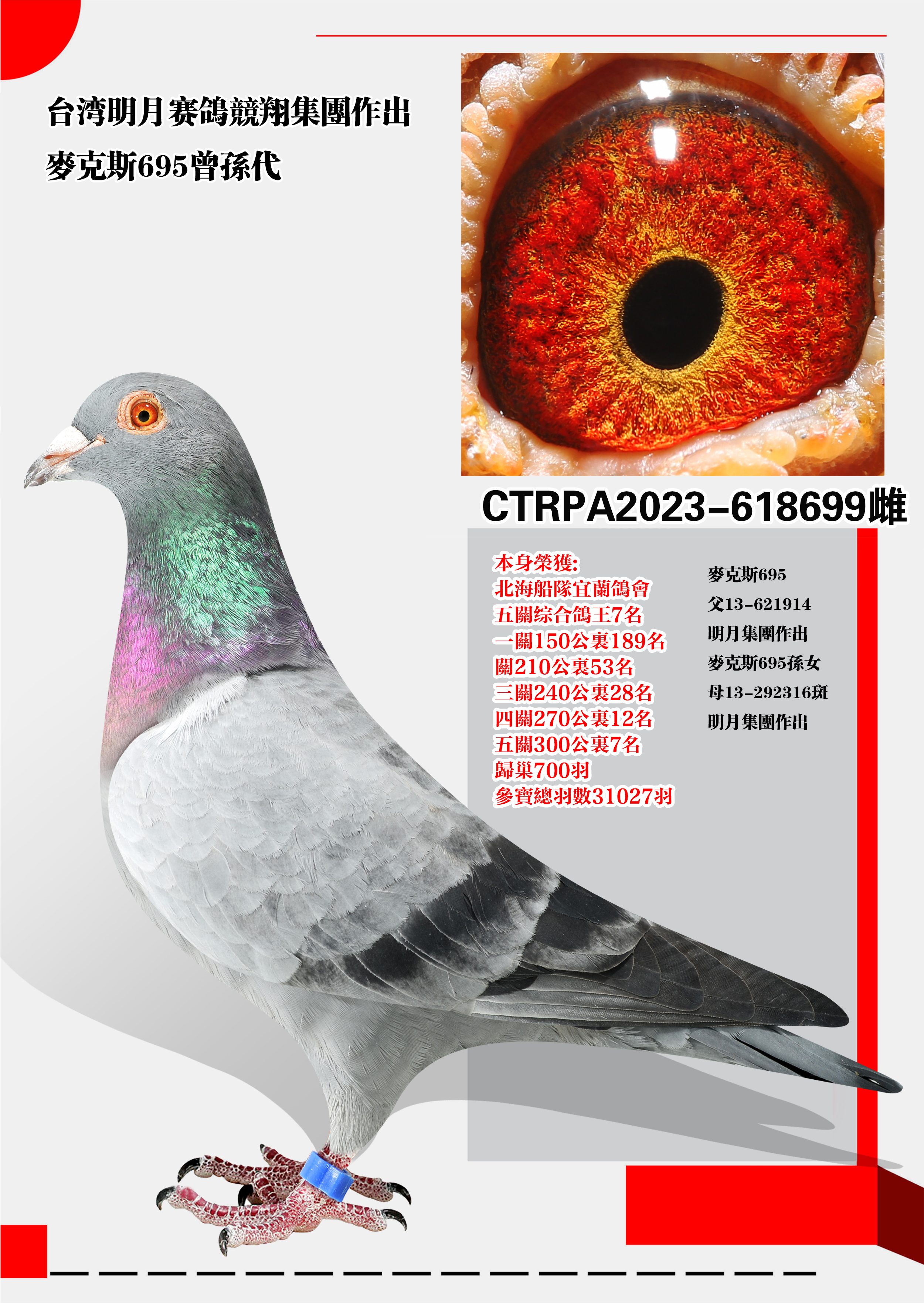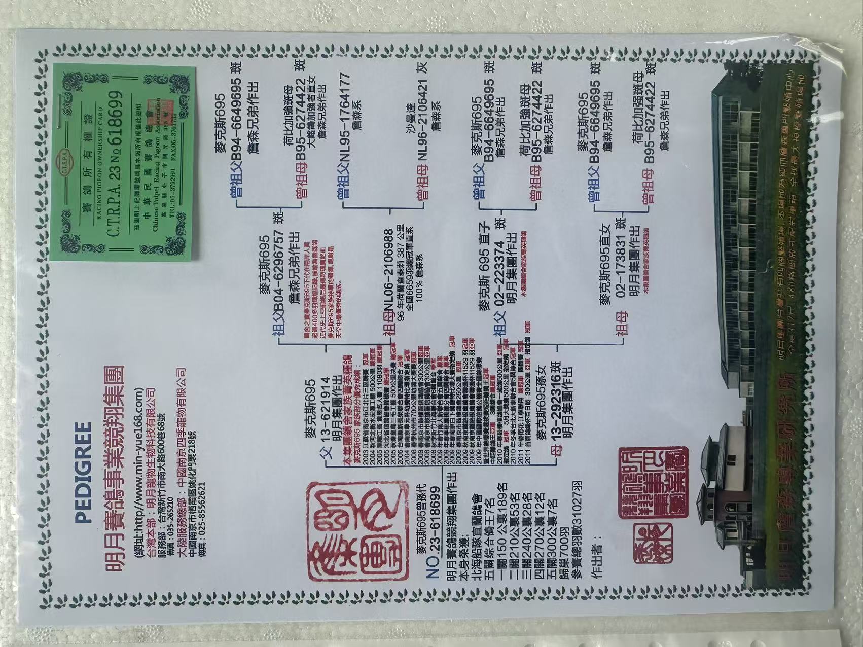 - 当前查看拍卖鸽:台湾明月赛鸽作出“麦克斯695孙代”
