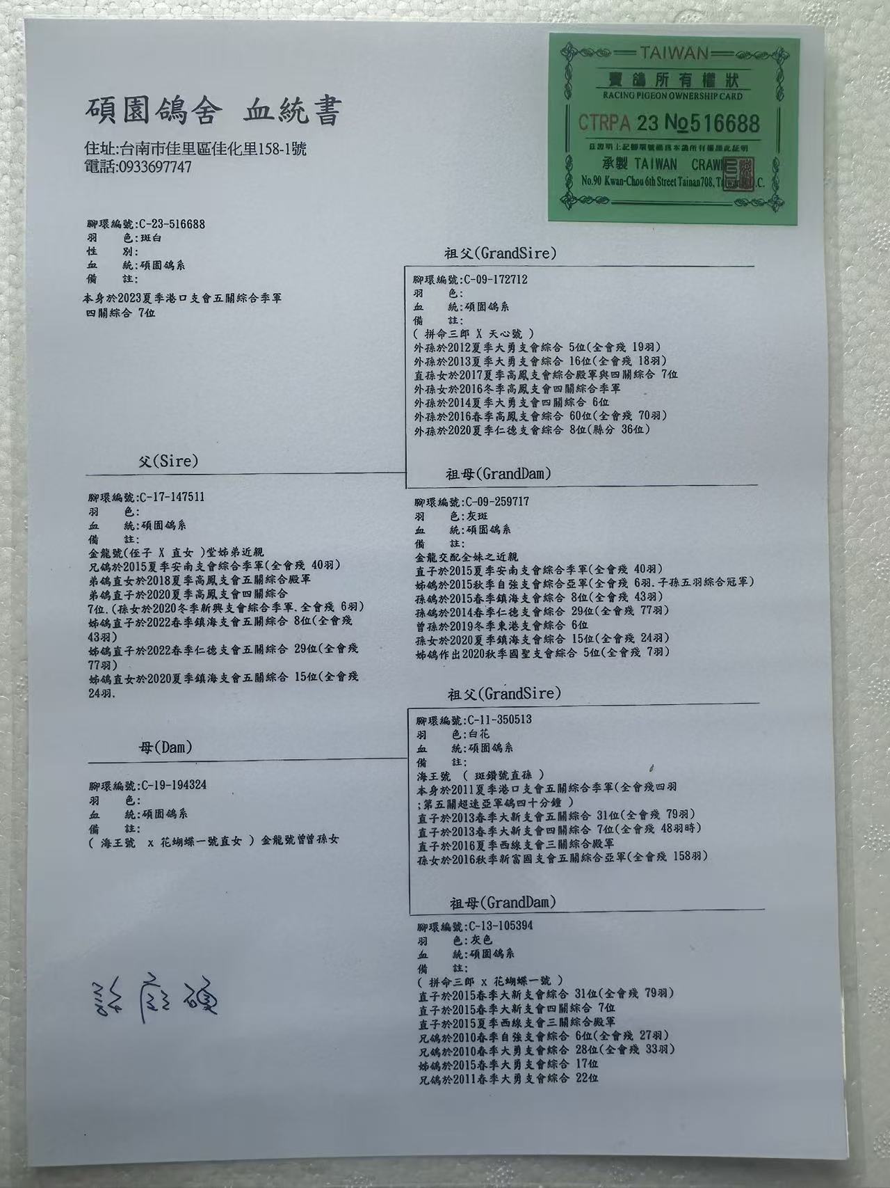- 当前查看拍卖鸽:台湾硕园鸽舍 五关综合季军