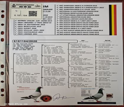 2021年燕青公棚180公里195,300公里81(指定鸽11取一,22取一,大家乐获奖)500公里425名,745名,加站赛6名(指定鸽获奖)。2021年大安信和公棚300公里254,420公里102(11取一,22取一,大家乐获奖)500公里43名(指定鸽获奖4W加手机一部)三关鸽王八位。2022年豪飞公棚双关综合鸽王亚军,大安信和公棚决赛243名,黑龙江伟路公棚457名,恒信院内五关鸽王大奖赛鸽王42位,61位,双关综合鸽王4位(获奖10W)。2023年大安信和公棚决赛194名(三关综合鸽王冠军),获奖金8W,2024年伟路公棚159名,河北唐山春兴公棚101名(3关综合鸽王季军),唐山阳光公棚501名,大安信和公棚加站赛7名,内蒙古金翔赛鸽公棚865名……1996年-2024年本舍地方赛及公棚获奖无数......