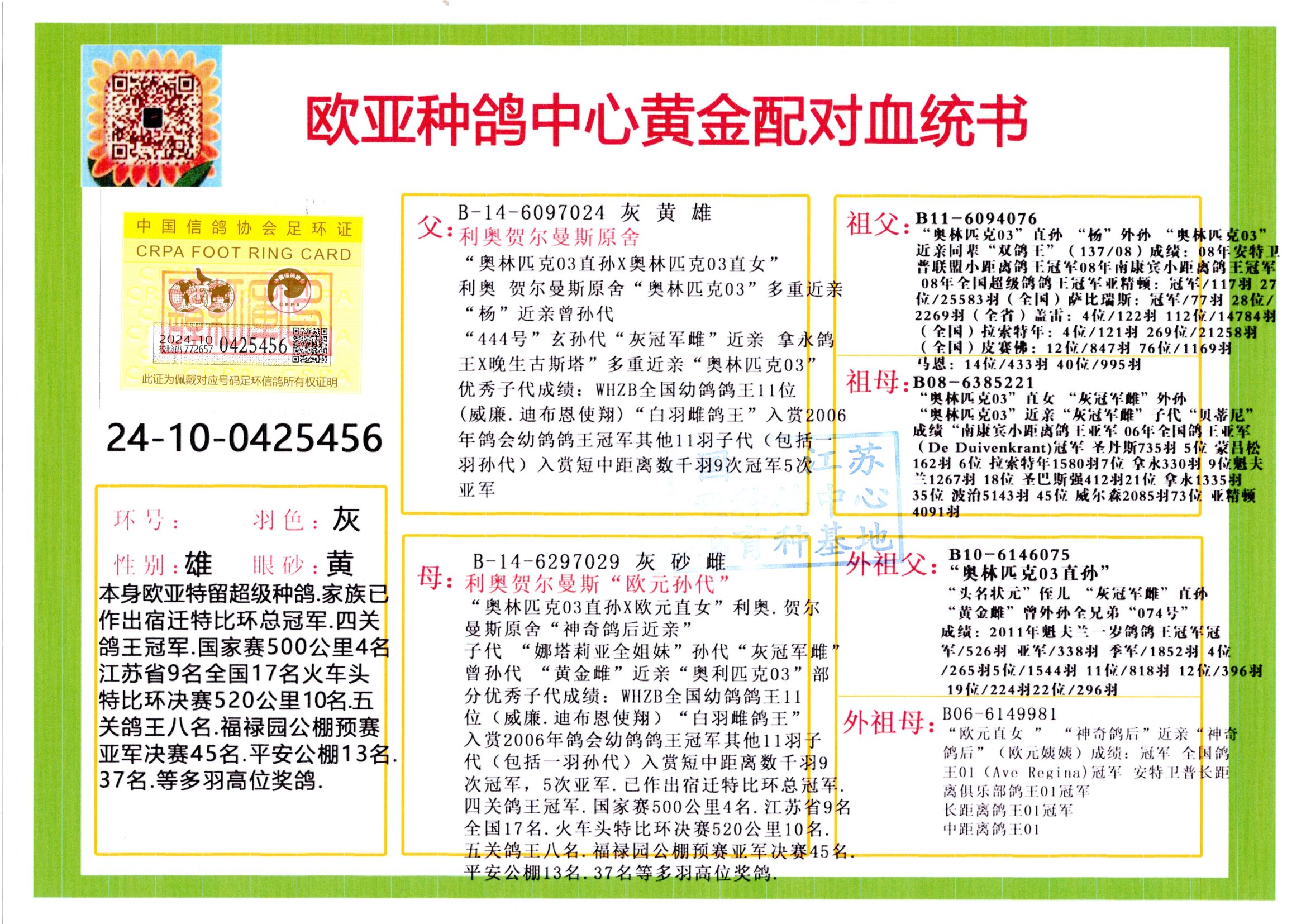 24年秋南京特比环欧亚荣获大团体冠军.小团体冠军551公里大特比13名.14名.16名.19名.20名.21名.24名.26名.27名.28名.42名.52名.54名.57名.65名.66名.68名.70名.71名.72名.74名.76名.80名.82名.83名.84名.85名.86名.90名.92名.110名.116名.121名.122名.128名.131名.158名.161名.164名.165名.166名.172名.174名.177名.182名.195名.196名.201名.205名.208名.210名.216名.253名.269名.275名.276名.294名.296名.299名,,24年秋云南天南铜都公棚决赛415名.天南铜都小棚决赛409名.云南玉活公棚决赛102名.490名.团体32名上笼二羽进二羽,天南铜都大棚506公里决赛445名。热烈祝贺河北省巨鹿县李兰生老师用欧亚泰山号血系连续十一年夺冠军,河北省国家赛冠军.全国季军等多次前十名高位,扬州王军王总用欧亚利奥24年春季获山东翔宇公棚决赛33名盖比53名。南京刘正龙刘总用欧亚盖比获得24年秋山东潍坊国际公棚决赛42名.精英赛30名.三关鸽王71名.决赛86名.加站赛16名.南京市特比环A组鸽王9名.B组鸽王5名.6名.C组鸽王5名.精英赛冠军4名.技能赛A组冠军4名.5名.秦淮区特比环荣获15名.46名.48名.87名。四川西昌徐亮徐总用欧亚利奥获得凉山州聚友决赛177名.第二关亚军双关鸽王19名.三关鸽王105名.云南豪庭公棚决赛603名。热烈祝贺24年四川重庆翔园鸽舍用欧亚泰山号荣获春季400公里冠军.秋季500公里冠军,河北王总用詹森X利奥获得千羽千翔公棚400公里冠军,广东蔡楷焕荣获24年秋爱好者 赛鸽俱乐部三关鸽王季军.一关420公里99名.二关450公里11名.三关520公里32名.单关季军.7名.12名,江西李卫兴荣获贵州红枫公棚8名.共翔俱乐部寄养棚四关综合鸽王30名.一关400公里78名.二关500公里55名.三关520公里37名.四关500公里57名.同父母获公棚18名.雷鸣获得武汉黄浦育翔中心冠军,四川陈文获得四川明鸿俱乐部300公里梦幻2名.3名.4名.9名.10名.13名.14名.15名.31名.34名.40名.41名.42名.43名.69名.71名.72名.73名.74名.94名.95名.97名.98名.99名.419公里决赛荣获总冠军7名.总共归巢9羽,四川徐亮获豪庭决赛603名,山西郑勇获得山西泰鑫公棚决赛255名詹森红狐,热烈祝贺马总获得开尔(飞跃队)决赛9名获奖金1310000万元.第一关52名,天津津福资赛180公里96名.获奖金429543万元,欧亚支持全国鸽友24年秋多人报喜 祝大家取得更好成绩,给欧亚报喜鸽友欧亚决定给每人赠送一羽超级种鸽。欧亚俱乐部特比环多关鸽王成绩:15年秋淮安特比环黑色星期一全会上笼9700多羽,当天无鸽归巢,第二天全会归巢357羽,本舍归巢158羽.前十名八羽.前一百名归巢57羽,16年春季获五关鸽王总冠军,总亚军四名.六名.七名.九名.十名.晶艺俱乐部520公里冠亚季军5名.6名.7名.9名.11名等,火车头冠军.季军6名.8名.9名.10名,16年秋晶艺俱乐部特比环520公里亚军.季军4名.6名.7名.9名,15年春南京白下特比环冠军.亚军.季军6名.7名.8名.9名.10名.指定鸽A B组获得冠军.亚军.季军4名.5名.,17年淮安特比环亚军.4名.5名.7名.8名.10名.六关鸽王总冠军.4名.6名.9名.10名,寄养棚宿迁刘总20羽特比环获冠军.季军.4名.7名.8名.9名等。18年荣获万羽特比环六关鸽王总冠军.总亚军.总季军.6名.8名.十名.单关四羽冠军.二羽亚军.四羽季军.前十名27羽。19年秋万羽特比环六关鸽王总亚军.总季军.5名.8名等,单关二羽冠军.三羽亚军.一羽季军前十名31羽。20年秋淮安市鸽会四关特比环大赛风雨无阻鸽王亚军.鸽王六名,金品俱乐部万羽特比环六关鸽王总冠军,总亚军.四名.五名.六名.七名.八名.十名.前二百名鸽王35羽,单关冠亚季军前十名四十多羽,火车头五关鸽王季军.六名.八名.前二百名鸽王十七羽。20年春荣获淮安五区一市四关鸽王总冠军.亚军.四名.八名.九名。21年秋荣获金品万羽特比环大赛六关鸽王总亚军.总季军.四名.七名.九名.十名.单关冠亚军季军前十名三十多羽。火车头协会鸽王六名.七名.十名.单关前十名十七羽。22年秋荣获鸽王总冠军.总亚军.5名.7名.8名.9名.11名.单关冠亚季军前十名三十多羽,第一关单关前二百名四十多羽,第二关前二百名三十多羽,第三关前二百名四十多羽,第四关前二百名四十多羽,第五关前一百名53羽。23年秋荣获鸽王季军.五名.八名.十名.13名.17名.20名.27名等多羽鸽王.单关前十名二十多羽。公棚.寄养棚部分成绩:16年秋宁夏黄河公棚总冠军电脑戈马力指定通炮冠军,17年送八羽参赛获得鸽王八名进奖四名,支持韩总荣获八名。支持鸽友荣获宁夏中卫公棚决赛总冠军.精英赛冠军,支持18年宁夏黄河公棚决赛冠军詹森X泰山。安徽鼎博寄养棚院内外四关鸽王总冠军.鸽王十七名.三十七名同窝,鸽王39名.42名.58名.67名。18年山东公棚预赛冠军.决赛65名.送八羽进奖五羽.指定获奔驰汽车一辆。支持鸽友获得云南蓝云公棚冠军.盖比X佛卡门。支持鸽友荣获云南银集公棚决赛冠军 詹森427X520血系 速度赛6700羽冠军。17年荣获金马俱乐部寄养棚四关鸽王总冠军.季军.六名.八名.第一关冠军.亚军.季军四名.七名.十一名.金牌教练奖。支持鸽友18年北京费翔公棚预赛九名电脑X桑杰士,支持鸽友荣获陕西威力公棚决赛11名.内蒙古临河寄养棚四关鸽王六名.詹森配泰山,支持河北王总用欧亚詹森427配胡本喜获20年秋开尔青年棚季军。云南东荣公棚16年预赛冠军.决赛77名.17年决赛12名.詹森红狐X泰山,17年平安公棚决赛4名 詹森427。欧亚获得21年金母寄养棚第一关四名.第二关5名.第三关5名.6名.7名.10名.三关鸽王总冠军,四关鸽王14名.十羽鸽王。支持河