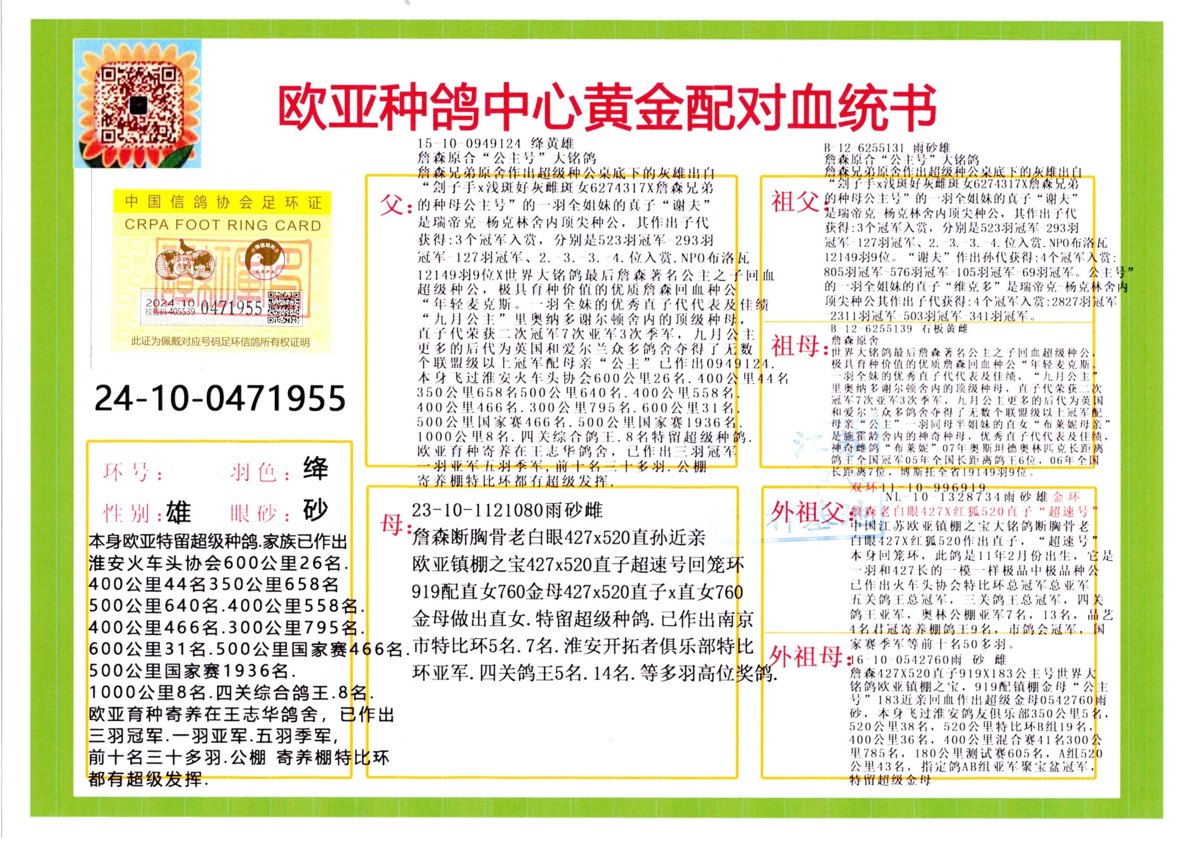 24年秋南京特比环欧亚荣获大团体冠军.小团体冠军551公里大特比13名.14名.16名.19名.20名.21名.24名.26名.27名.28名.42名.52名.54名.57名.65名.66名.68名.70名.71名.72名.74名.76名.80名.82名.83名.84名.85名.86名.90名.92名.110名.116名.121名.122名.128名.131名.158名.161名.164名.165名.166名.172名.174名.177名.182名.195名.196名.201名.205名.208名.210名.216名.253名.269名.275名.276名.294名.296名.299名,,24年秋云南天南铜都公棚决赛415名.天南铜都小棚决赛409名.云南玉活公棚决赛102名.490名.团体32名上笼二羽进二羽,天南铜都大棚506公里决赛445名。热烈祝贺河北省巨鹿县李兰生老师用欧亚泰山号血系连续十一年夺冠军,河北省国家赛冠军.全国季军等多次前十名高位,扬州王军王总用欧亚利奥24年春季获山东翔宇公棚决赛33名盖比53名。南京刘正龙刘总用欧亚盖比获得24年秋山东潍坊国际公棚决赛42名.精英赛30名.三关鸽王71名.决赛86名.加站赛16名.南京市特比环A组鸽王9名.B组鸽王5名.6名.C组鸽王5名.精英赛冠军4名.技能赛A组冠军4名.5名.秦淮区特比环荣获15名.46名.48名.87名。四川西昌徐亮徐总用欧亚利奥获得凉山州聚友决赛177名.第二关亚军双关鸽王19名.三关鸽王105名.云南豪庭公棚决赛603名。热烈祝贺24年四川重庆翔园鸽舍用欧亚泰山号荣获春季400公里冠军.秋季500公里冠军,河北王总用詹森X利奥获得千羽千翔公棚400公里冠军,广东蔡楷焕荣获24年秋爱好者 赛鸽俱乐部三关鸽王季军.一关420公里99名.二关450公里11名.三关520公里32名.单关季军.7名.12名,江西李卫兴荣获贵州红枫公棚8名.共翔俱乐部寄养棚四关综合鸽王30名.一关400公里78名.二关500公里55名.三关520公里37名.四关500公里57名.同父母获公棚18名.雷鸣获得武汉黄浦育翔中心冠军,四川陈文获得四川明鸿俱乐部300公里梦幻2名.3名.4名.9名.10名.13名.14名.15名.31名.34名.40名.41名.42名.43名.69名.71名.72名.73名.74名.94名.95名.97名.98名.99名.419公里决赛荣获总冠军7名.总共归巢9羽,四川徐亮获豪庭决赛603名,山西郑勇获得山西泰鑫公棚决赛255名詹森红狐,热烈祝贺马总获得开尔(飞跃队)决赛9名获奖金1310000万元.第一关52名,天津津福资赛180公里96名.获奖金429543万元,欧亚支持全国鸽友24年秋多人报喜 祝大家取得更好成绩,给欧亚报喜鸽友欧亚决定给每人赠送一羽超级种鸽。欧亚俱乐部特比环多关鸽王成绩:15年秋淮安特比环黑色星期一全会上笼9700多羽,当天无鸽归巢,第二天全会归巢357羽,本舍归巢158羽.前十名八羽.前一百名归巢57羽,16年春季获五关鸽王总冠军,总亚军四名.六名.七名.九名.十名.晶艺俱乐部520公里冠亚季军5名.6名.7名.9名.11名等,火车头冠军.季军6名.8名.9名.10名,16年秋晶艺俱乐部特比环520公里亚军.季军4名.6名.7名.9名,15年春南京白下特比环冠军.亚军.季军6名.7名.8名.9名.10名.指定鸽A B组获得冠军.亚军.季军4名.5名.,17年淮安特比环亚军.4名.5名.7名.8名.10名.六关鸽王总冠军.4名.6名.9名.10名,寄养棚宿迁刘总20羽特比环获冠军.季军.4名.7名.8名.9名等。18年荣获万羽特比环六关鸽王总冠军.总亚军.总季军.6名.8名.十名.单关四羽冠军.二羽亚军.四羽季军.前十名27羽。19年秋万羽特比环六关鸽王总亚军.总季军.5名.8名等,单关二羽冠军.三羽亚军.一羽季军前十名31羽。20年秋淮安市鸽会四关特比环大赛风雨无阻鸽王亚军.鸽王六名,金品俱乐部万羽特比环六关鸽王总冠军,总亚军.四名.五名.六名.七名.八名.十名.前二百名鸽王35羽,单关冠亚季军前十名四十多羽,火车头五关鸽王季军.六名.八名.前二百名鸽王十七羽。20年春荣获淮安五区一市四关鸽王总冠军.亚军.四名.八名.九名。21年秋荣获金品万羽特比环大赛六关鸽王总亚军.总季军.四名.七名.九名.十名.单关冠亚军季军前十名三十多羽。火车头协会鸽王六名.七名.十名.单关前十名十七羽。22年秋荣获鸽王总冠军.总亚军.5名.7名.8名.9名.11名.单关冠亚季军前十名三十多羽,第一关单关前二百名四十多羽,第二关前二百名三十多羽,第三关前二百名四十多羽,第四关前二百名四十多羽,第五关前一百名53羽。23年秋荣获鸽王季军.五名.八名.十名.13名.17名.20名.27名等多羽鸽王.单关前十名二十多羽。公棚.寄养棚部分成绩:16年秋宁夏黄河公棚总冠军电脑戈马力指定通炮冠军,17年送八羽参赛获得鸽王八名进奖四名,支持韩总荣获八名。支持鸽友荣获宁夏中卫公棚决赛总冠军.精英赛冠军,支持18年宁夏黄河公棚决赛冠军詹森X泰山。安徽鼎博寄养棚院内外四关鸽王总冠军.鸽王十七名.三十七名同窝,鸽王39名.42名.58名.67名。18年山东公棚预赛冠军.决赛65名.送八羽进奖五羽.指定获奔驰汽车一辆。支持鸽友获得云南蓝云公棚冠军.盖比X佛卡门。支持鸽友荣获云南银集公棚决赛冠军 詹森427X520血系 速度赛6700羽冠军。17年荣获金马俱乐部寄养棚四关鸽王总冠军.季军.六名.八名.第一关冠军.亚军.季军四名.七名.十一名.金牌教练奖。支持鸽友18年北京费翔公棚预赛九名电脑X桑杰士,支持鸽友荣获陕西威力公棚决赛11名.内蒙古临河寄养棚四关鸽王六名.詹森配泰山,支持河北王总用欧亚詹森427配胡本喜获20年秋开尔青年棚季军。云南东荣公棚16年预赛冠军.决赛77名.17年决赛12名.詹森红狐X泰山,17年平安公棚决赛4名 詹森427。欧亚获得21年金母寄养棚第一关四名.第二关5名.第三关5名.6名.7名.10名.三关鸽王总冠军,四关鸽王14名.十羽鸽王。支持河
