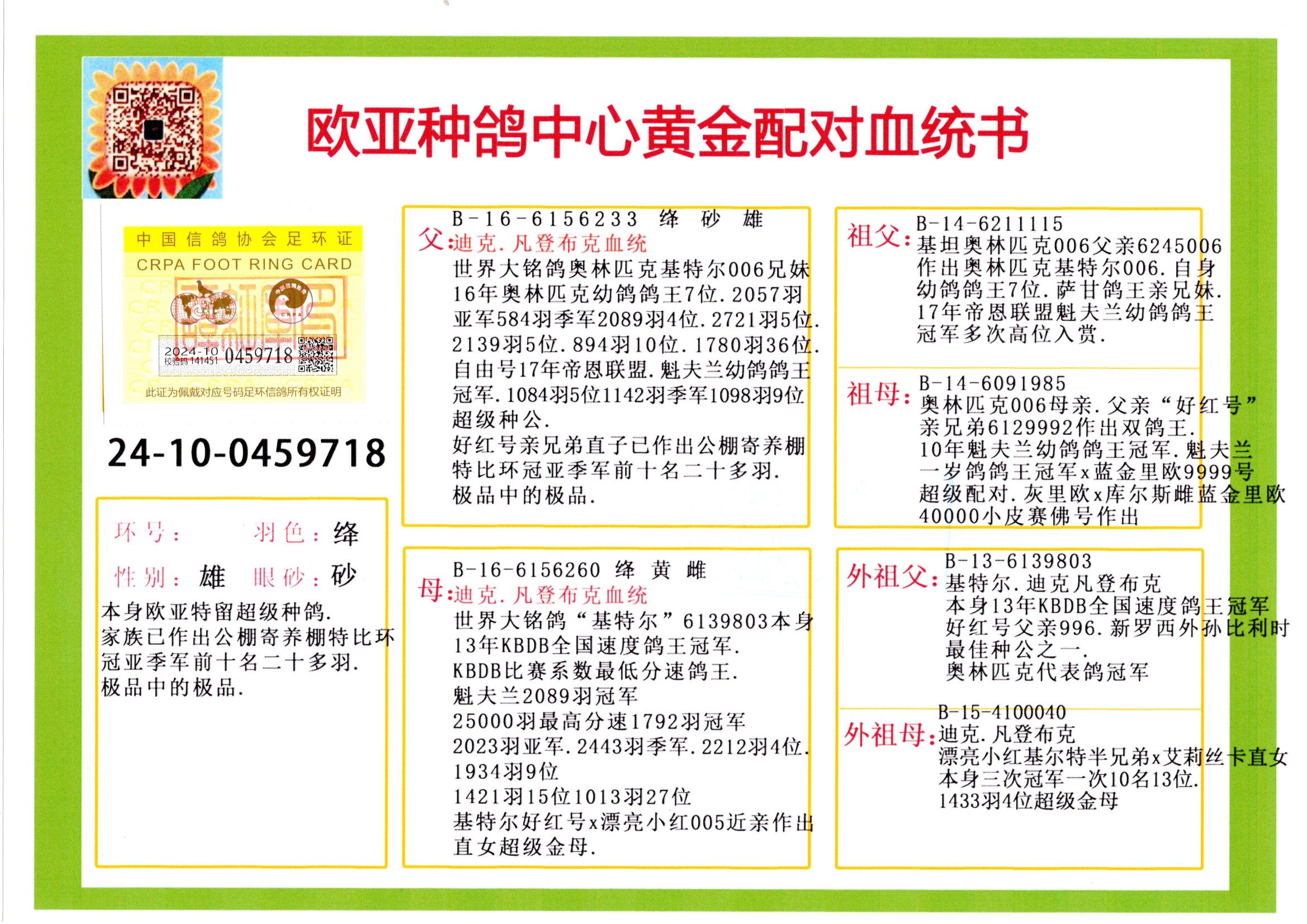 24年秋南京特比环欧亚荣获大团体冠军.小团体冠军551公里大特比13名.14名.16名.19名.20名.21名.24名.26名.27名.28名.42名.52名.54名.57名.65名.66名.68名.70名.71名.72名.74名.76名.80名.82名.83名.84名.85名.86名.90名.92名.110名.116名.121名.122名.128名.131名.158名.161名.164名.165名.166名.172名.174名.177名.182名.195名.196名.201名.205名.208名.210名.216名.253名.269名.275名.276名.294名.296名.299名,,24年秋云南天南铜都公棚决赛415名.天南铜都小棚决赛409名.云南玉活公棚决赛102名.490名.团体32名上笼二羽进二羽,天南铜都大棚506公里决赛445名。热烈祝贺河北省巨鹿县李兰生老师用欧亚泰山号血系连续十一年夺冠军,河北省国家赛冠军.全国季军等多次前十名高位,扬州王军王总用欧亚利奥24年春季获山东翔宇公棚决赛33名盖比53名。南京刘正龙刘总用欧亚盖比获得24年秋山东潍坊国际公棚决赛42名.精英赛30名.三关鸽王71名.决赛86名.加站赛16名.南京市特比环A组鸽王9名.B组鸽王5名.6名.C组鸽王5名.精英赛冠军4名.技能赛A组冠军4名.5名.秦淮区特比环荣获15名.46名.48名.87名。四川西昌徐亮徐总用欧亚利奥获得凉山州聚友决赛177名.第二关亚军双关鸽王19名.三关鸽王105名.云南豪庭公棚决赛603名。热烈祝贺24年四川重庆翔园鸽舍用欧亚泰山号荣获春季400公里冠军.秋季500公里冠军,河北王总用詹森X利奥获得千羽千翔公棚400公里冠军,广东蔡楷焕荣获24年秋爱好者 赛鸽俱乐部三关鸽王季军.一关420公里99名.二关450公里11名.三关520公里32名.单关季军.7名.12名,江西李卫兴荣获贵州红枫公棚8名.共翔俱乐部寄养棚四关综合鸽王30名.一关400公里78名.二关500公里55名.三关520公里37名.四关500公里57名.同父母获公棚18名.雷鸣获得武汉黄浦育翔中心冠军,四川陈文获得四川明鸿俱乐部300公里梦幻2名.3名.4名.9名.10名.13名.14名.15名.31名.34名.40名.41名.42名.43名.69名.71名.72名.73名.74名.94名.95名.97名.98名.99名.419公里决赛荣获总冠军7名.总共归巢9羽,四川徐亮获豪庭决赛603名,山西郑勇获得山西泰鑫公棚决赛255名詹森红狐,热烈祝贺马总获得开尔(飞跃队)决赛9名获奖金1310000万元.第一关52名,天津津福资赛180公里96名.获奖金429543万元,欧亚支持全国鸽友24年秋多人报喜 祝大家取得更好成绩,给欧亚报喜鸽友欧亚决定给每人赠送一羽超级种鸽。欧亚俱乐部特比环多关鸽王成绩:15年秋淮安特比环黑色星期一全会上笼9700多羽,当天无鸽归巢,第二天全会归巢357羽,本舍归巢158羽.前十名八羽.前一百名归巢57羽,16年春季获五关鸽王总冠军,总亚军四名.六名.七名.九名.十名.晶艺俱乐部520公里冠亚季军5名.6名.7名.9名.11名等,火车头冠军.季军6名.8名.9名.10名,16年秋晶艺俱乐部特比环520公里亚军.季军4名.6名.7名.9名,15年春南京白下特比环冠军.亚军.季军6名.7名.8名.9名.10名.指定鸽A B组获得冠军.亚军.季军4名.5名.,17年淮安特比环亚军.4名.5名.7名.8名.10名.六关鸽王总冠军.4名.6名.9名.10名,寄养棚宿迁刘总20羽特比环获冠军.季军.4名.7名.8名.9名等。18年荣获万羽特比环六关鸽王总冠军.总亚军.总季军.6名.8名.十名.单关四羽冠军.二羽亚军.四羽季军.前十名27羽。19年秋万羽特比环六关鸽王总亚军.总季军.5名.8名等,单关二羽冠军.三羽亚军.一羽季军前十名31羽。20年秋淮安市鸽会四关特比环大赛风雨无阻鸽王亚军.鸽王六名,金品俱乐部万羽特比环六关鸽王总冠军,总亚军.四名.五名.六名.七名.八名.十名.前二百名鸽王35羽,单关冠亚季军前十名四十多羽,火车头五关鸽王季军.六名.八名.前二百名鸽王十七羽。20年春荣获淮安五区一市四关鸽王总冠军.亚军.四名.八名.九名。21年秋荣获金品万羽特比环大赛六关鸽王总亚军.总季军.四名.七名.九名.十名.单关冠亚军季军前十名三十多羽。火车头协会鸽王六名.七名.十名.单关前十名十七羽。22年秋荣获鸽王总冠军.总亚军.5名.7名.8名.9名.11名.单关冠亚季军前十名三十多羽,第一关单关前二百名四十多羽,第二关前二百名三十多羽,第三关前二百名四十多羽,第四关前二百名四十多羽,第五关前一百名53羽。23年秋荣获鸽王季军.五名.八名.十名.13名.17名.20名.27名等多羽鸽王.单关前十名二十多羽。公棚.寄养棚部分成绩:16年秋宁夏黄河公棚总冠军电脑戈马力指定通炮冠军,17年送八羽参赛获得鸽王八名进奖四名,支持韩总荣获八名。支持鸽友荣获宁夏中卫公棚决赛总冠军.精英赛冠军,支持18年宁夏黄河公棚决赛冠军詹森X泰山。安徽鼎博寄养棚院内外四关鸽王总冠军.鸽王十七名.三十七名同窝,鸽王39名.42名.58名.67名。18年山东公棚预赛冠军.决赛65名.送八羽进奖五羽.指定获奔驰汽车一辆。支持鸽友获得云南蓝云公棚冠军.盖比X佛卡门。支持鸽友荣获云南银集公棚决赛冠军 詹森427X520血系 速度赛6700羽冠军。17年荣获金马俱乐部寄养棚四关鸽王总冠军.季军.六名.八名.第一关冠军.亚军.季军四名.七名.十一名.金牌教练奖。支持鸽友18年北京费翔公棚预赛九名电脑X桑杰士,支持鸽友荣获陕西威力公棚决赛11名.内蒙古临河寄养棚四关鸽王六名.詹森配泰山,支持河北王总用欧亚詹森427配胡本喜获20年秋开尔青年棚季军。云南东荣公棚16年预赛冠军.决赛77名.17年决赛12名.詹森红狐X泰山,17年平安公棚决赛4名 詹森427。欧亚获得21年金母寄养棚第一关四名.第二关5名.第三关5名.6名.7名.10名.三关鸽王总冠军,四关鸽王14名.十羽鸽王。支持河