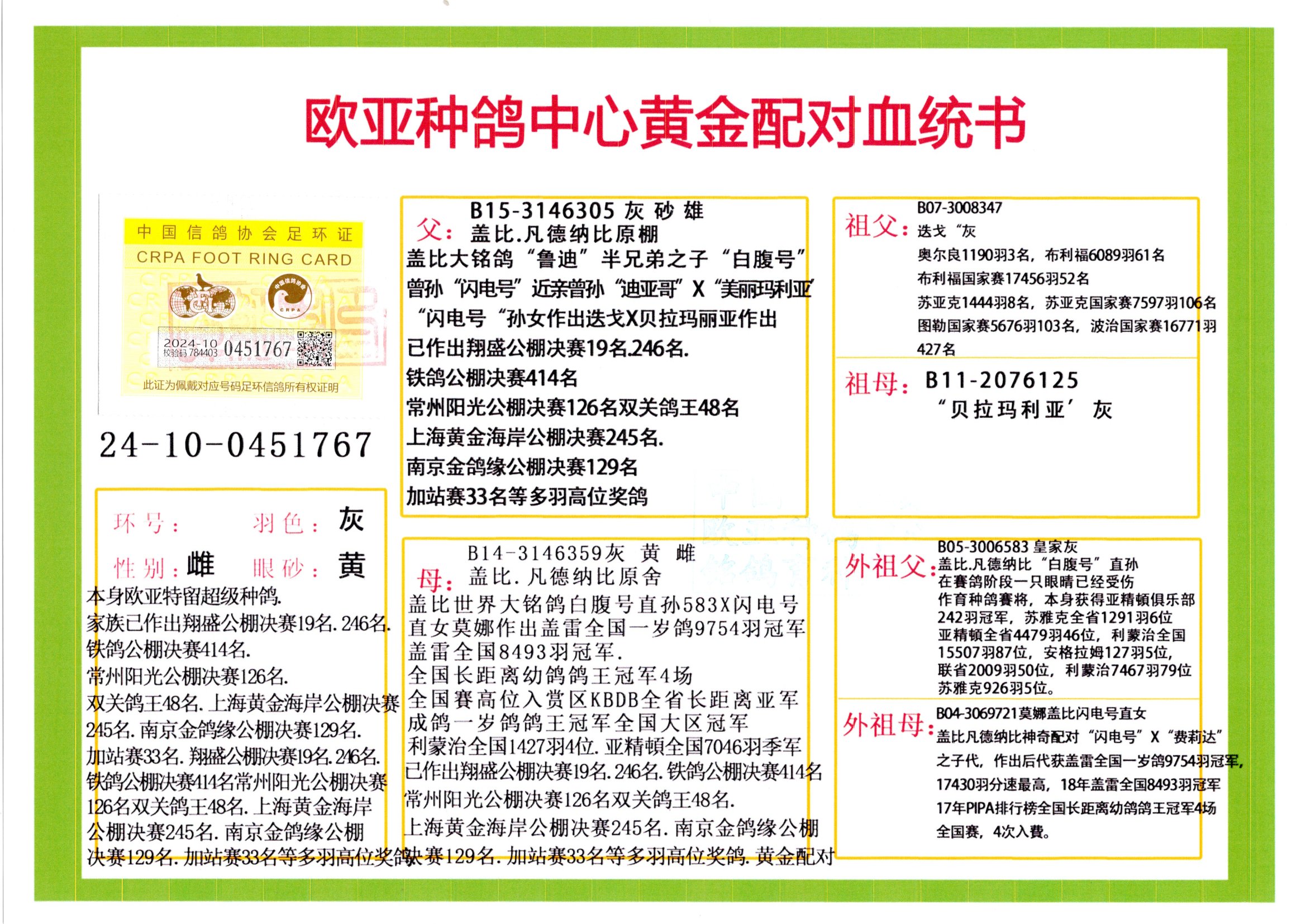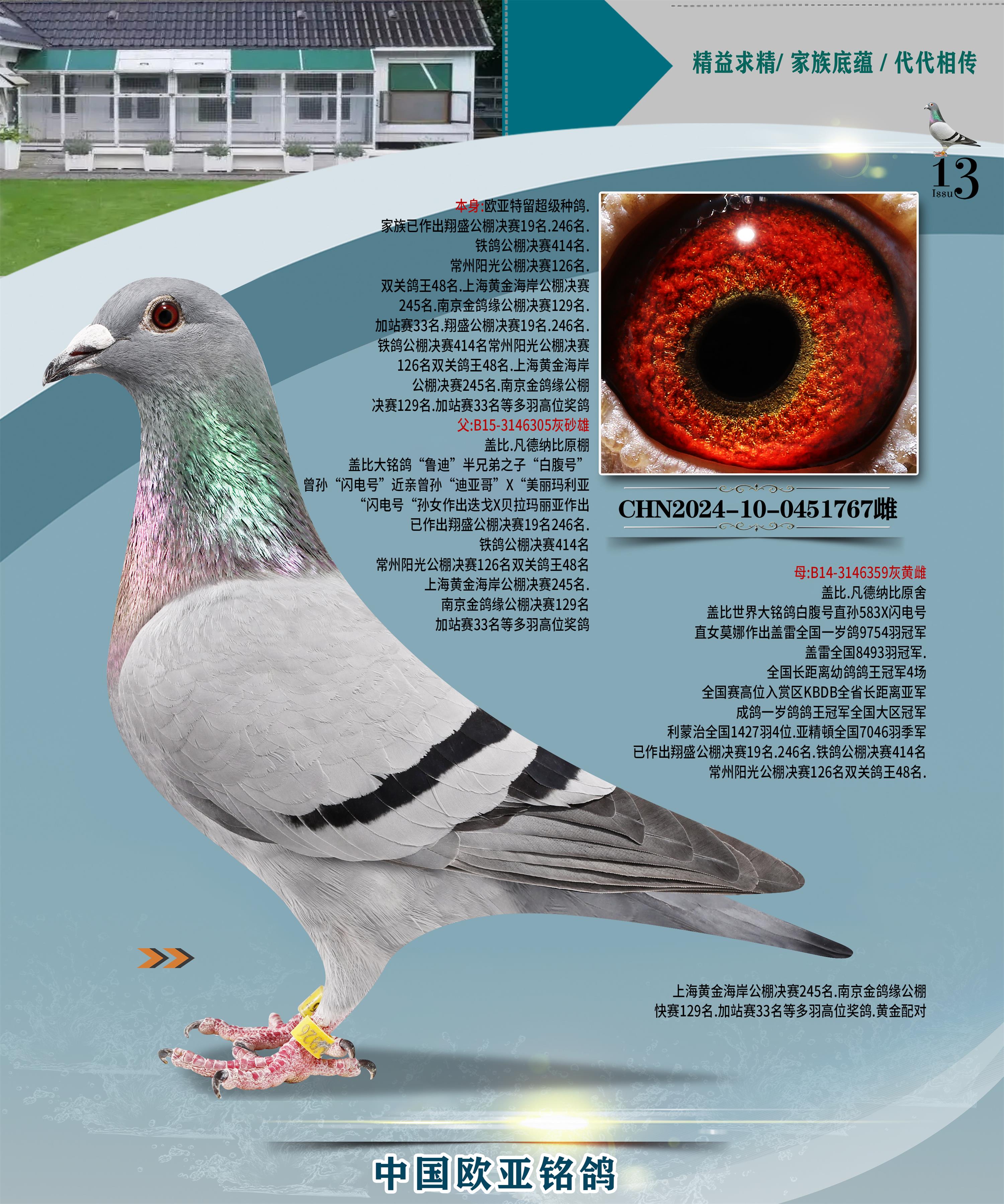 24年秋南京特比环欧亚荣获大团体冠军.小团体冠军551公里大特比13名.14名.16名.19名.20名.21名.24名.26名.27名.28名.42名.52名.54名.57名.65名.66名.68名.70名.71名.72名.74名.76名.80名.82名.83名.84名.85名.86名.90名.92名.110名.116名.121名.122名.128名.131名.158名.161名.164名.165名.166名.172名.174名.177名.182名.195名.196名.201名.205名.208名.210名.216名.253名.269名.275名.276名.294名.296名.299名,,24年秋云南天南铜都公棚决赛415名.天南铜都小棚决赛409名.云南玉活公棚决赛102名.490名.团体32名上笼二羽进二羽,天南铜都大棚506公里决赛445名。热烈祝贺河北省巨鹿县李兰生老师用欧亚泰山号血系连续十一年夺冠军,河北省国家赛冠军.全国季军等多次前十名高位,扬州王军王总用欧亚利奥24年春季获山东翔宇公棚决赛33名盖比53名。南京刘正龙刘总用欧亚盖比获得24年秋山东潍坊国际公棚决赛42名.精英赛30名.三关鸽王71名.决赛86名.加站赛16名.南京市特比环A组鸽王9名.B组鸽王5名.6名.C组鸽王5名.精英赛冠军4名.技能赛A组冠军4名.5名.秦淮区特比环荣获15名.46名.48名.87名。四川西昌徐亮徐总用欧亚利奥获得凉山州聚友决赛177名.第二关亚军双关鸽王19名.三关鸽王105名.云南豪庭公棚决赛603名。热烈祝贺24年四川重庆翔园鸽舍用欧亚泰山号荣获春季400公里冠军.秋季500公里冠军,河北王总用詹森X利奥获得千羽千翔公棚400公里冠军,广东蔡楷焕荣获24年秋爱好者 赛鸽俱乐部三关鸽王季军.一关420公里99名.二关450公里11名.三关520公里32名.单关季军.7名.12名,江西李卫兴荣获贵州红枫公棚8名.共翔俱乐部寄养棚四关综合鸽王30名.一关400公里78名.二关500公里55名.三关520公里37名.四关500公里57名.同父母获公棚18名.雷鸣获得武汉黄浦育翔中心冠军,四川陈文获得四川明鸿俱乐部300公里梦幻2名.3名.4名.9名.10名.13名.14名.15名.31名.34名.40名.41名.42名.43名.69名.71名.72名.73名.74名.94名.95名.97名.98名.99名.419公里决赛荣获总冠军7名.总共归巢9羽,四川徐亮获豪庭决赛603名,山西郑勇获得山西泰鑫公棚决赛255名詹森红狐,热烈祝贺马总获得开尔(飞跃队)决赛9名获奖金1310000万元.第一关52名,天津津福资赛180公里96名.获奖金429543万元,欧亚支持全国鸽友24年秋多人报喜 祝大家取得更好成绩,给欧亚报喜鸽友欧亚决定给每人赠送一羽超级种鸽。欧亚俱乐部特比环多关鸽王成绩:15年秋淮安特比环黑色星期一全会上笼9700多羽,当天无鸽归巢,第二天全会归巢357羽,本舍归巢158羽.前十名八羽.前一百名归巢57羽,16年春季获五关鸽王总冠军,总亚军四名.六名.七名.九名.十名.晶艺俱乐部520公里冠亚季军5名.6名.7名.9名.11名等,火车头冠军.季军6名.8名.9名.10名,16年秋晶艺俱乐部特比环520公里亚军.季军4名.6名.7名.9名,15年春南京白下特比环冠军.亚军.季军6名.7名.8名.9名.10名.指定鸽A B组获得冠军.亚军.季军4名.5名.,17年淮安特比环亚军.4名.5名.7名.8名.10名.六关鸽王总冠军.4名.6名.9名.10名,寄养棚宿迁刘总20羽特比环获冠军.季军.4名.7名.8名.9名等。18年荣获万羽特比环六关鸽王总冠军.总亚军.总季军.6名.8名.十名.单关四羽冠军.二羽亚军.四羽季军.前十名27羽。19年秋万羽特比环六关鸽王总亚军.总季军.5名.8名等,单关二羽冠军.三羽亚军.一羽季军前十名31羽。20年秋淮安市鸽会四关特比环大赛风雨无阻鸽王亚军.鸽王六名,金品俱乐部万羽特比环六关鸽王总冠军,总亚军.四名.五名.六名.七名.八名.十名.前二百名鸽王35羽,单关冠亚季军前十名四十多羽,火车头五关鸽王季军.六名.八名.前二百名鸽王十七羽。20年春荣获淮安五区一市四关鸽王总冠军.亚军.四名.八名.九名。21年秋荣获金品万羽特比环大赛六关鸽王总亚军.总季军.四名.七名.九名.十名.单关冠亚军季军前十名三十多羽。火车头协会鸽王六名.七名.十名.单关前十名十七羽。22年秋荣获鸽王总冠军.总亚军.5名.7名.8名.9名.11名.单关冠亚季军前十名三十多羽,第一关单关前二百名四十多羽,第二关前二百名三十多羽,第三关前二百名四十多羽,第四关前二百名四十多羽,第五关前一百名53羽。23年秋荣获鸽王季军.五名.八名.十名.13名.17名.20名.27名等多羽鸽王.单关前十名二十多羽。公棚.寄养棚部分成绩:16年秋宁夏黄河公棚总冠军电脑戈马力指定通炮冠军,17年送八羽参赛获得鸽王八名进奖四名,支持韩总荣获八名。支持鸽友荣获宁夏中卫公棚决赛总冠军.精英赛冠军,支持18年宁夏黄河公棚决赛冠军詹森X泰山。安徽鼎博寄养棚院内外四关鸽王总冠军.鸽王十七名.三十七名同窝,鸽王39名.42名.58名.67名。18年山东公棚预赛冠军.决赛65名.送八羽进奖五羽.指定获奔驰汽车一辆。支持鸽友获得云南蓝云公棚冠军.盖比X佛卡门。支持鸽友荣获云南银集公棚决赛冠军 詹森427X520血系 速度赛6700羽冠军。17年荣获金马俱乐部寄养棚四关鸽王总冠军.季军.六名.八名.第一关冠军.亚军.季军四名.七名.十一名.金牌教练奖。支持鸽友18年北京费翔公棚预赛九名电脑X桑杰士,支持鸽友荣获陕西威力公棚决赛11名.内蒙古临河寄养棚四关鸽王六名.詹森配泰山,支持河北王总用欧亚詹森427配胡本喜获20年秋开尔青年棚季军。云南东荣公棚16年预赛冠军.决赛77名.17年决赛12名.詹森红狐X泰山,17年平安公棚决赛4名 詹森427。欧亚获得21年金母寄养棚第一关四名.第二关5名.第三关5名.6名.7名.10名.三关鸽王总冠军,四关鸽王14名.十羽鸽王。支持河