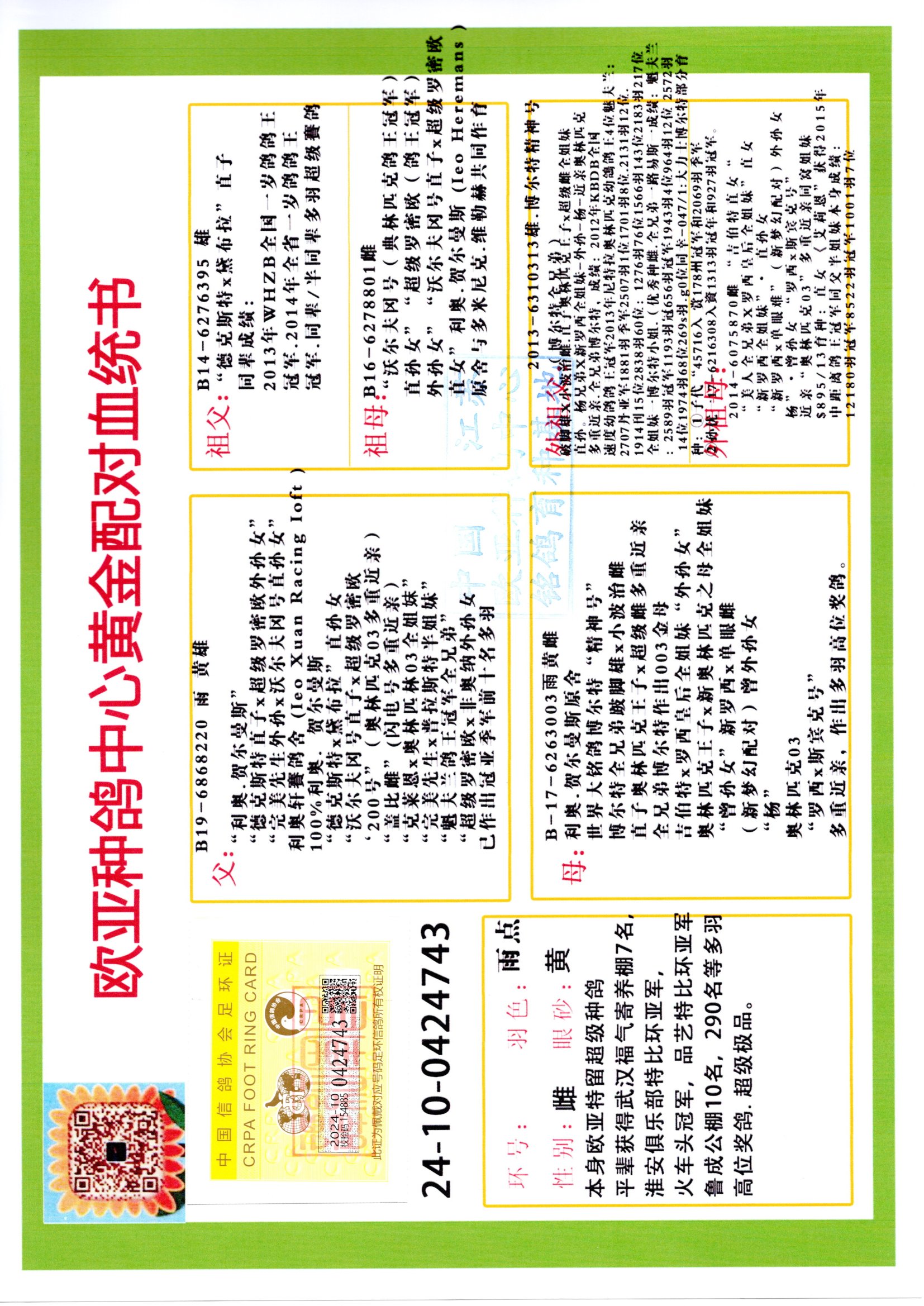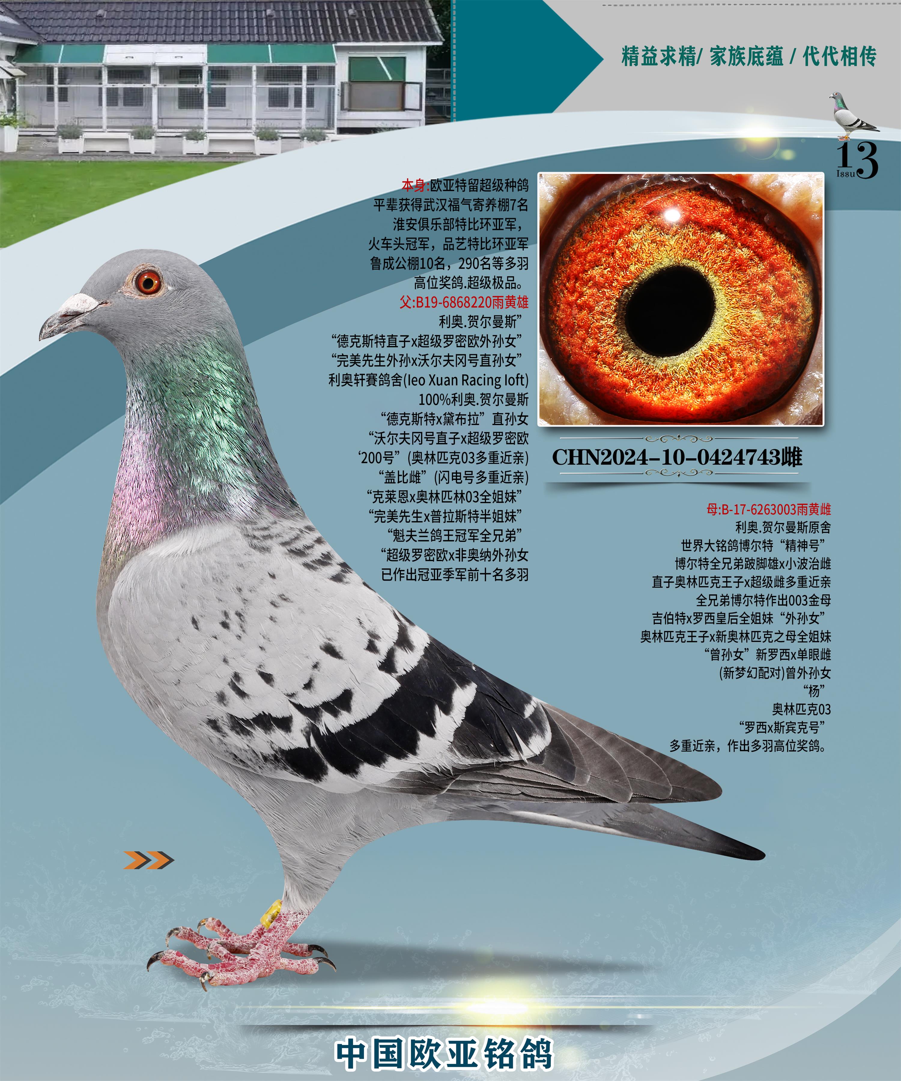 24年秋南京特比环欧亚荣获大团体冠军.小团体冠军551公里大特比13名.14名.16名.19名.20名.21名.24名.26名.27名.28名.42名.52名.54名.57名.65名.66名.68名.70名.71名.72名.74名.76名.80名.82名.83名.84名.85名.86名.90名.92名.110名.116名.121名.122名.128名.131名.158名.161名.164名.165名.166名.172名.174名.177名.182名.195名.196名.201名.205名.208名.210名.216名.253名.269名.275名.276名.294名.296名.299名,,24年秋云南天南铜都公棚决赛415名.天南铜都小棚决赛409名.云南玉活公棚决赛102名.490名.团体32名上笼二羽进二羽,天南铜都大棚506公里决赛445名。热烈祝贺河北省巨鹿县李兰生老师用欧亚泰山号血系连续十一年夺冠军,河北省国家赛冠军.全国季军等多次前十名高位,扬州王军王总用欧亚利奥24年春季获山东翔宇公棚决赛33名盖比53名。南京刘正龙刘总用欧亚盖比获得24年秋山东潍坊国际公棚决赛42名.精英赛30名.三关鸽王71名.决赛86名.加站赛16名.南京市特比环A组鸽王9名.B组鸽王5名.6名.C组鸽王5名.精英赛冠军4名.技能赛A组冠军4名.5名.秦淮区特比环荣获15名.46名.48名.87名。四川西昌徐亮徐总用欧亚利奥获得凉山州聚友决赛177名.第二关亚军双关鸽王19名.三关鸽王105名.云南豪庭公棚决赛603名。热烈祝贺24年四川重庆翔园鸽舍用欧亚泰山号荣获春季400公里冠军.秋季500公里冠军,河北王总用詹森X利奥获得千羽千翔公棚400公里冠军,广东蔡楷焕荣获24年秋爱好者 赛鸽俱乐部三关鸽王季军.一关420公里99名.二关450公里11名.三关520公里32名.单关季军.7名.12名,江西李卫兴荣获贵州红枫公棚8名.共翔俱乐部寄养棚四关综合鸽王30名.一关400公里78名.二关500公里55名.三关520公里37名.四关500公里57名.同父母获公棚18名.雷鸣获得武汉黄浦育翔中心冠军,四川陈文获得四川明鸿俱乐部300公里梦幻2名.3名.4名.9名.10名.13名.14名.15名.31名.34名.40名.41名.42名.43名.69名.71名.72名.73名.74名.94名.95名.97名.98名.99名.419公里决赛荣获总冠军7名.总共归巢9羽,四川徐亮获豪庭决赛603名,山西郑勇获得山西泰鑫公棚决赛255名詹森红狐,热烈祝贺马总获得开尔(飞跃队)决赛9名获奖金1310000万元.第一关52名,天津津福资赛180公里96名.获奖金429543万元,欧亚支持全国鸽友24年秋多人报喜 祝大家取得更好成绩,给欧亚报喜鸽友欧亚决定给每人赠送一羽超级种鸽。欧亚俱乐部特比环多关鸽王成绩:15年秋淮安特比环黑色星期一全会上笼9700多羽,当天无鸽归巢,第二天全会归巢357羽,本舍归巢158羽.前十名八羽.前一百名归巢57羽,16年春季获五关鸽王总冠军,总亚军四名.六名.七名.九名.十名.晶艺俱乐部520公里冠亚季军5名.6名.7名.9名.11名等,火车头冠军.季军6名.8名.9名.10名,16年秋晶艺俱乐部特比环520公里亚军.季军4名.6名.7名.9名,15年春南京白下特比环冠军.亚军.季军6名.7名.8名.9名.10名.指定鸽A B组获得冠军.亚军.季军4名.5名.,17年淮安特比环亚军.4名.5名.7名.8名.10名.六关鸽王总冠军.4名.6名.9名.10名,寄养棚宿迁刘总20羽特比环获冠军.季军.4名.7名.8名.9名等。18年荣获万羽特比环六关鸽王总冠军.总亚军.总季军.6名.8名.十名.单关四羽冠军.二羽亚军.四羽季军.前十名27羽。19年秋万羽特比环六关鸽王总亚军.总季军.5名.8名等,单关二羽冠军.三羽亚军.一羽季军前十名31羽。20年秋淮安市鸽会四关特比环大赛风雨无阻鸽王亚军.鸽王六名,金品俱乐部万羽特比环六关鸽王总冠军,总亚军.四名.五名.六名.七名.八名.十名.前二百名鸽王35羽,单关冠亚季军前十名四十多羽,火车头五关鸽王季军.六名.八名.前二百名鸽王十七羽。20年春荣获淮安五区一市四关鸽王总冠军.亚军.四名.八名.九名。21年秋荣获金品万羽特比环大赛六关鸽王总亚军.总季军.四名.七名.九名.十名.单关冠亚军季军前十名三十多羽。火车头协会鸽王六名.七名.十名.单关前十名十七羽。22年秋荣获鸽王总冠军.总亚军.5名.7名.8名.9名.11名.单关冠亚季军前十名三十多羽,第一关单关前二百名四十多羽,第二关前二百名三十多羽,第三关前二百名四十多羽,第四关前二百名四十多羽,第五关前一百名53羽。23年秋荣获鸽王季军.五名.八名.十名.13名.17名.20名.27名等多羽鸽王.单关前十名二十多羽。公棚.寄养棚部分成绩:16年秋宁夏黄河公棚总冠军电脑戈马力指定通炮冠军,17年送八羽参赛获得鸽王八名进奖四名,支持韩总荣获八名。支持鸽友荣获宁夏中卫公棚决赛总冠军.精英赛冠军,支持18年宁夏黄河公棚决赛冠军詹森X泰山。安徽鼎博寄养棚院内外四关鸽王总冠军.鸽王十七名.三十七名同窝,鸽王39名.42名.58名.67名。18年山东公棚预赛冠军.决赛65名.送八羽进奖五羽.指定获奔驰汽车一辆。支持鸽友获得云南蓝云公棚冠军.盖比X佛卡门。支持鸽友荣获云南银集公棚决赛冠军 詹森427X520血系 速度赛6700羽冠军。17年荣获金马俱乐部寄养棚四关鸽王总冠军.季军.六名.八名.第一关冠军.亚军.季军四名.七名.十一名.金牌教练奖。支持鸽友18年北京费翔公棚预赛九名电脑X桑杰士,支持鸽友荣获陕西威力公棚决赛11名.内蒙古临河寄养棚四关鸽王六名.詹森配泰山,支持河北王总用欧亚詹森427配胡本喜获20年秋开尔青年棚季军。云南东荣公棚16年预赛冠军.决赛77名.17年决赛12名.詹森红狐X泰山,17年平安公棚决赛4名 詹森427。欧亚获得21年金母寄养棚第一关四名.第二关5名.第三关5名.6名.7名.10名.三关鸽王总冠军,四关鸽王14名.十羽鸽王。支持河