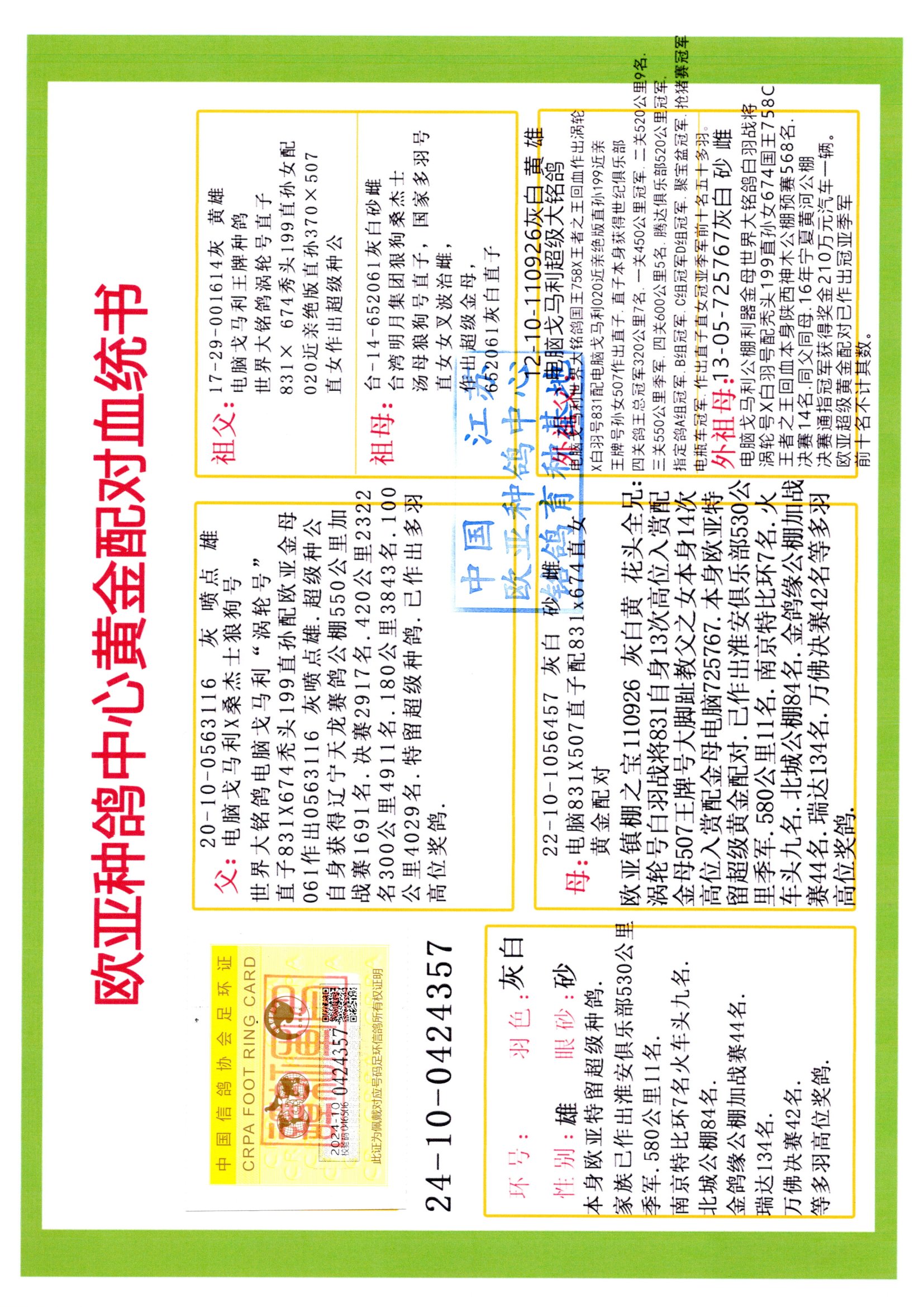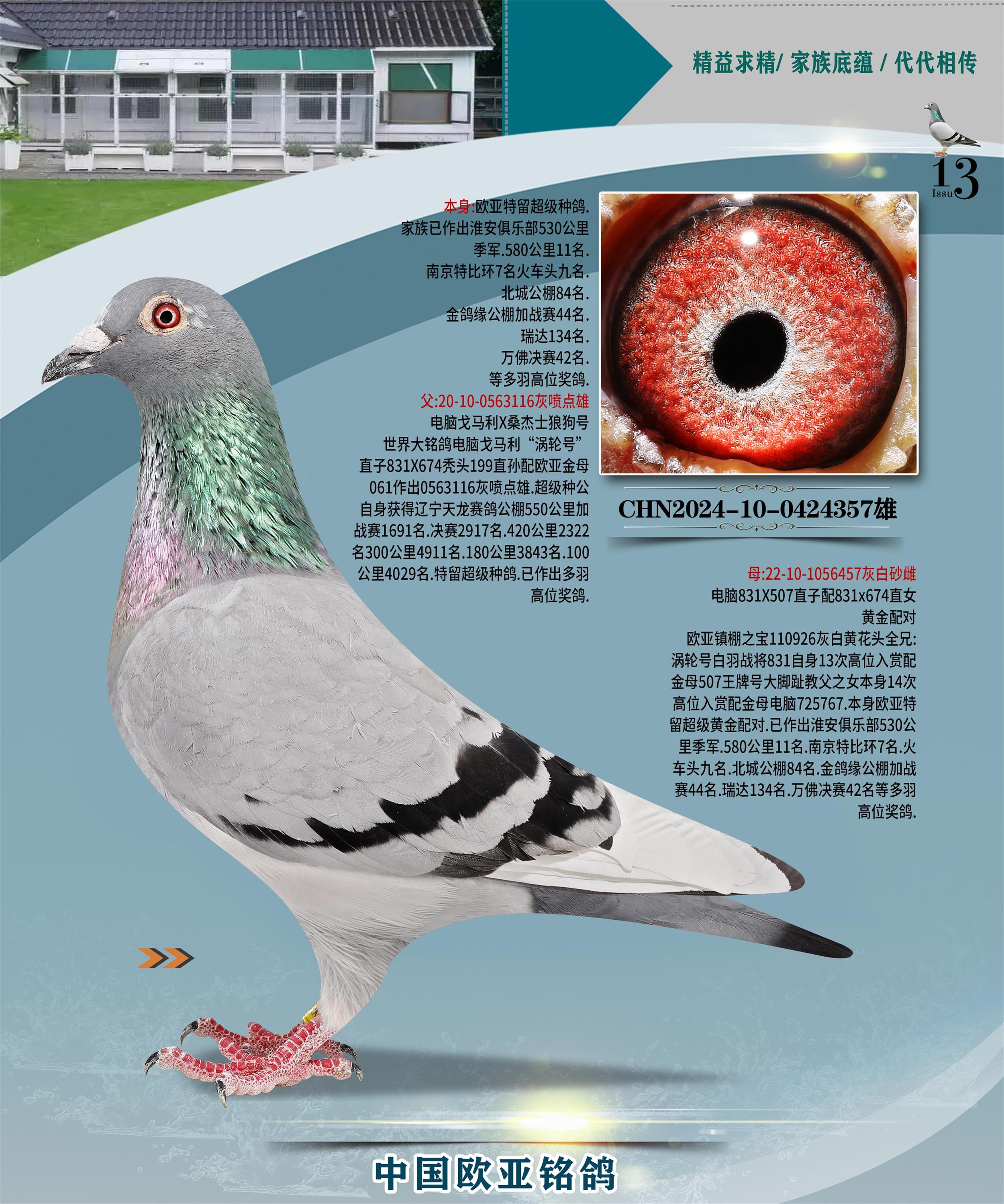 24年秋南京特比环欧亚荣获大团体冠军.小团体冠军551公里大特比13名.14名.16名.19名.20名.21名.24名.26名.27名.28名.42名.52名.54名.57名.65名.66名.68名.70名.71名.72名.74名.76名.80名.82名.83名.84名.85名.86名.90名.92名.110名.116名.121名.122名.128名.131名.158名.161名.164名.165名.166名.172名.174名.177名.182名.195名.196名.201名.205名.208名.210名.216名.253名.269名.275名.276名.294名.296名.299名,,24年秋云南天南铜都公棚决赛415名.天南铜都小棚决赛409名.云南玉活公棚决赛102名.490名.团体32名上笼二羽进二羽,天南铜都大棚506公里决赛445名。热烈祝贺河北省巨鹿县李兰生老师用欧亚泰山号血系连续十一年夺冠军,河北省国家赛冠军.全国季军等多次前十名高位,扬州王军王总用欧亚利奥24年春季获山东翔宇公棚决赛33名盖比53名。南京刘正龙刘总用欧亚盖比获得24年秋山东潍坊国际公棚决赛42名.精英赛30名.三关鸽王71名.决赛86名.加站赛16名.南京市特比环A组鸽王9名.B组鸽王5名.6名.C组鸽王5名.精英赛冠军4名.技能赛A组冠军4名.5名.秦淮区特比环荣获15名.46名.48名.87名。四川西昌徐亮徐总用欧亚利奥获得凉山州聚友决赛177名.第二关亚军双关鸽王19名.三关鸽王105名.云南豪庭公棚决赛603名。热烈祝贺24年四川重庆翔园鸽舍用欧亚泰山号荣获春季400公里冠军.秋季500公里冠军,河北王总用詹森X利奥获得千羽千翔公棚400公里冠军,广东蔡楷焕荣获24年秋爱好者 赛鸽俱乐部三关鸽王季军.一关420公里99名.二关450公里11名.三关520公里32名.单关季军.7名.12名,江西李卫兴荣获贵州红枫公棚8名.共翔俱乐部寄养棚四关综合鸽王30名.一关400公里78名.二关500公里55名.三关520公里37名.四关500公里57名.同父母获公棚18名.雷鸣获得武汉黄浦育翔中心冠军,四川陈文获得四川明鸿俱乐部300公里梦幻2名.3名.4名.9名.10名.13名.14名.15名.31名.34名.40名.41名.42名.43名.69名.71名.72名.73名.74名.94名.95名.97名.98名.99名.419公里决赛荣获总冠军7名.总共归巢9羽,四川徐亮获豪庭决赛603名,山西郑勇获得山西泰鑫公棚决赛255名詹森红狐,热烈祝贺马总获得开尔(飞跃队)决赛9名获奖金1310000万元.第一关52名,天津津福资赛180公里96名.获奖金429543万元,欧亚支持全国鸽友24年秋多人报喜 祝大家取得更好成绩,给欧亚报喜鸽友欧亚决定给每人赠送一羽超级种鸽。欧亚俱乐部特比环多关鸽王成绩:15年秋淮安特比环黑色星期一全会上笼9700多羽,当天无鸽归巢,第二天全会归巢357羽,本舍归巢158羽.前十名八羽.前一百名归巢57羽,16年春季获五关鸽王总冠军,总亚军四名.六名.七名.九名.十名.晶艺俱乐部520公里冠亚季军5名.6名.7名.9名.11名等,火车头冠军.季军6名.8名.9名.10名,16年秋晶艺俱乐部特比环520公里亚军.季军4名.6名.7名.9名,15年春南京白下特比环冠军.亚军.季军6名.7名.8名.9名.10名.指定鸽A B组获得冠军.亚军.季军4名.5名.,17年淮安特比环亚军.4名.5名.7名.8名.10名.六关鸽王总冠军.4名.6名.9名.10名,寄养棚宿迁刘总20羽特比环获冠军.季军.4名.7名.8名.9名等。18年荣获万羽特比环六关鸽王总冠军.总亚军.总季军.6名.8名.十名.单关四羽冠军.二羽亚军.四羽季军.前十名27羽。19年秋万羽特比环六关鸽王总亚军.总季军.5名.8名等,单关二羽冠军.三羽亚军.一羽季军前十名31羽。20年秋淮安市鸽会四关特比环大赛风雨无阻鸽王亚军.鸽王六名,金品俱乐部万羽特比环六关鸽王总冠军,总亚军.四名.五名.六名.七名.八名.十名.前二百名鸽王35羽,单关冠亚季军前十名四十多羽,火车头五关鸽王季军.六名.八名.前二百名鸽王十七羽。20年春荣获淮安五区一市四关鸽王总冠军.亚军.四名.八名.九名。21年秋荣获金品万羽特比环大赛六关鸽王总亚军.总季军.四名.七名.九名.十名.单关冠亚军季军前十名三十多羽。火车头协会鸽王六名.七名.十名.单关前十名十七羽。22年秋荣获鸽王总冠军.总亚军.5名.7名.8名.9名.11名.单关冠亚季军前十名三十多羽,第一关单关前二百名四十多羽,第二关前二百名三十多羽,第三关前二百名四十多羽,第四关前二百名四十多羽,第五关前一百名53羽。23年秋荣获鸽王季军.五名.八名.十名.13名.17名.20名.27名等多羽鸽王.单关前十名二十多羽。公棚.寄养棚部分成绩:16年秋宁夏黄河公棚总冠军电脑戈马力指定通炮冠军,17年送八羽参赛获得鸽王八名进奖四名,支持韩总荣获八名。支持鸽友荣获宁夏中卫公棚决赛总冠军.精英赛冠军,支持18年宁夏黄河公棚决赛冠军詹森X泰山。安徽鼎博寄养棚院内外四关鸽王总冠军.鸽王十七名.三十七名同窝,鸽王39名.42名.58名.67名。18年山东公棚预赛冠军.决赛65名.送八羽进奖五羽.指定获奔驰汽车一辆。支持鸽友获得云南蓝云公棚冠军.盖比X佛卡门。支持鸽友荣获云南银集公棚决赛冠军 詹森427X520血系 速度赛6700羽冠军。17年荣获金马俱乐部寄养棚四关鸽王总冠军.季军.六名.八名.第一关冠军.亚军.季军四名.七名.十一名.金牌教练奖。支持鸽友18年北京费翔公棚预赛九名电脑X桑杰士,支持鸽友荣获陕西威力公棚决赛11名.内蒙古临河寄养棚四关鸽王六名.詹森配泰山,支持河北王总用欧亚詹森427配胡本喜获20年秋开尔青年棚季军。云南东荣公棚16年预赛冠军.决赛77名.17年决赛12名.詹森红狐X泰山,17年平安公棚决赛4名 詹森427。欧亚获得21年金母寄养棚第一关四名.第二关5名.第三关5名.6名.7名.10名.三关鸽王总冠军,四关鸽王14名.十羽鸽王。支持河
