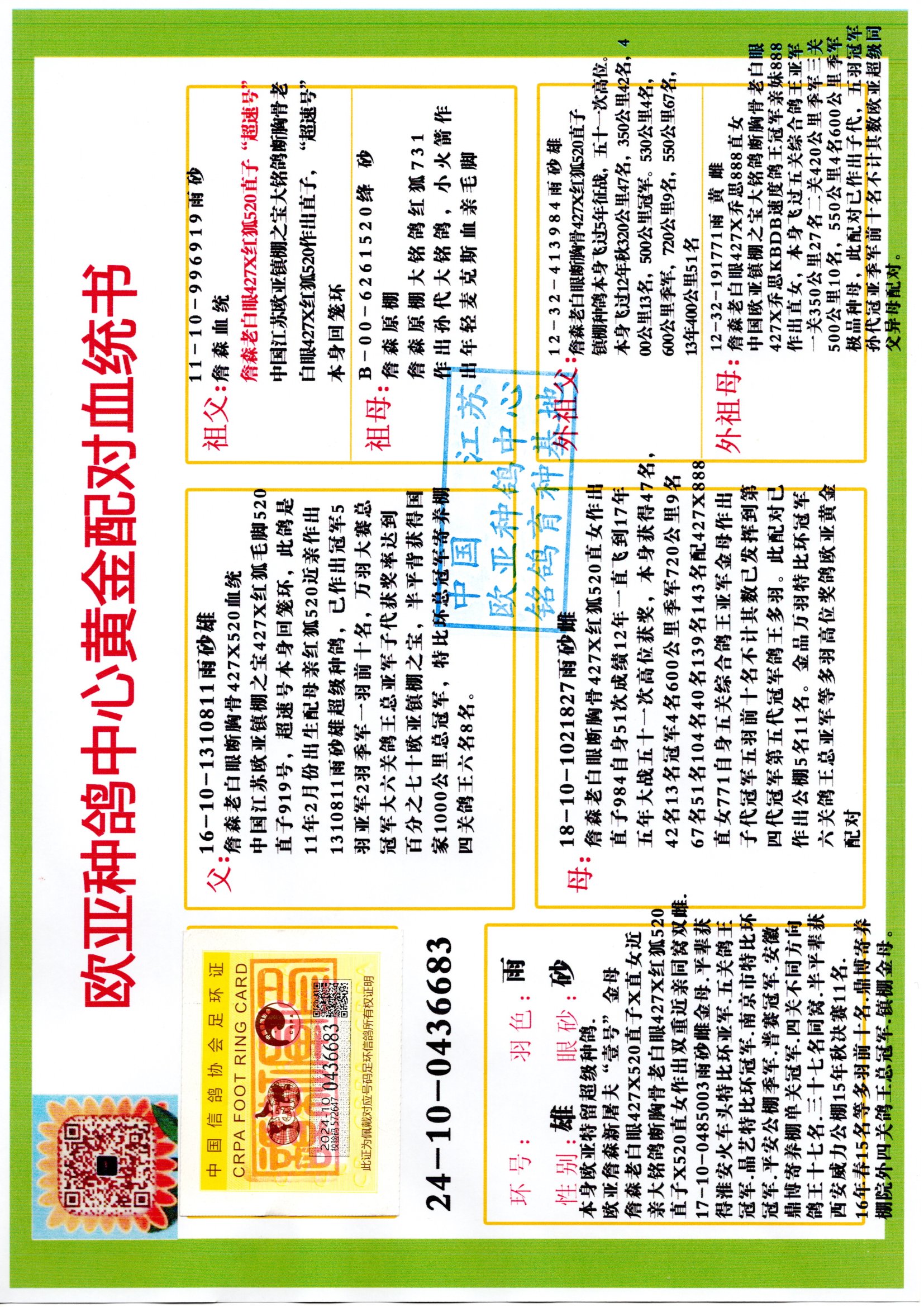 24年秋南京特比环欧亚荣获大团体冠军.小团体冠军551公里大特比13名.14名.16名.19名.20名.21名.24名.26名.27名.28名.42名.52名.54名.57名.65名.66名.68名.70名.71名.72名.74名.76名.80名.82名.83名.84名.85名.86名.90名.92名.110名.116名.121名.122名.128名.131名.158名.161名.164名.165名.166名.172名.174名.177名.182名.195名.196名.201名.205名.208名.210名.216名.253名.269名.275名.276名.294名.296名.299名,,24年秋云南天南铜都公棚决赛415名.天南铜都小棚决赛409名.云南玉活公棚决赛102名.490名.团体32名上笼二羽进二羽,天南铜都大棚506公里决赛445名。热烈祝贺河北省巨鹿县李兰生老师用欧亚泰山号血系连续十一年夺冠军,河北省国家赛冠军.全国季军等多次前十名高位,扬州王军王总用欧亚利奥24年春季获山东翔宇公棚决赛33名盖比53名。南京刘正龙刘总用欧亚盖比获得24年秋山东潍坊国际公棚决赛42名.精英赛30名.三关鸽王71名.决赛86名.加站赛16名.南京市特比环A组鸽王9名.B组鸽王5名.6名.C组鸽王5名.精英赛冠军4名.技能赛A组冠军4名.5名.秦淮区特比环荣获15名.46名.48名.87名。四川西昌徐亮徐总用欧亚利奥获得凉山州聚友决赛177名.第二关亚军双关鸽王19名.三关鸽王105名.云南豪庭公棚决赛603名。热烈祝贺24年四川重庆翔园鸽舍用欧亚泰山号荣获春季400公里冠军.秋季500公里冠军,河北王总用詹森X利奥获得千羽千翔公棚400公里冠军,广东蔡楷焕荣获24年秋爱好者 赛鸽俱乐部三关鸽王季军.一关420公里99名.二关450公里11名.三关520公里32名.单关季军.7名.12名,江西李卫兴荣获贵州红枫公棚8名.共翔俱乐部寄养棚四关综合鸽王30名.一关400公里78名.二关500公里55名.三关520公里37名.四关500公里57名.同父母获公棚18名.雷鸣获得武汉黄浦育翔中心冠军,四川陈文获得四川明鸿俱乐部300公里梦幻2名.3名.4名.9名.10名.13名.14名.15名.31名.34名.40名.41名.42名.43名.69名.71名.72名.73名.74名.94名.95名.97名.98名.99名.419公里决赛荣获总冠军7名.总共归巢9羽,四川徐亮获豪庭决赛603名,山西郑勇获得山西泰鑫公棚决赛255名詹森红狐,热烈祝贺马总获得开尔(飞跃队)决赛9名获奖金1310000万元.第一关52名,天津津福资赛180公里96名.获奖金429543万元,欧亚支持全国鸽友24年秋多人报喜 祝大家取得更好成绩,给欧亚报喜鸽友欧亚决定给每人赠送一羽超级种鸽。欧亚俱乐部特比环多关鸽王成绩:15年秋淮安特比环黑色星期一全会上笼9700多羽,当天无鸽归巢,第二天全会归巢357羽,本舍归巢158羽.前十名八羽.前一百名归巢57羽,16年春季获五关鸽王总冠军,总亚军四名.六名.七名.九名.十名.晶艺俱乐部520公里冠亚季军5名.6名.7名.9名.11名等,火车头冠军.季军6名.8名.9名.10名,16年秋晶艺俱乐部特比环520公里亚军.季军4名.6名.7名.9名,15年春南京白下特比环冠军.亚军.季军6名.7名.8名.9名.10名.指定鸽A B组获得冠军.亚军.季军4名.5名.,17年淮安特比环亚军.4名.5名.7名.8名.10名.六关鸽王总冠军.4名.6名.9名.10名,寄养棚宿迁刘总20羽特比环获冠军.季军.4名.7名.8名.9名等。18年荣获万羽特比环六关鸽王总冠军.总亚军.总季军.6名.8名.十名.单关四羽冠军.二羽亚军.四羽季军.前十名27羽。19年秋万羽特比环六关鸽王总亚军.总季军.5名.8名等,单关二羽冠军.三羽亚军.一羽季军前十名31羽。20年秋淮安市鸽会四关特比环大赛风雨无阻鸽王亚军.鸽王六名,金品俱乐部万羽特比环六关鸽王总冠军,总亚军.四名.五名.六名.七名.八名.十名.前二百名鸽王35羽,单关冠亚季军前十名四十多羽,火车头五关鸽王季军.六名.八名.前二百名鸽王十七羽。20年春荣获淮安五区一市四关鸽王总冠军.亚军.四名.八名.九名。21年秋荣获金品万羽特比环大赛六关鸽王总亚军.总季军.四名.七名.九名.十名.单关冠亚军季军前十名三十多羽。火车头协会鸽王六名.七名.十名.单关前十名十七羽。22年秋荣获鸽王总冠军.总亚军.5名.7名.8名.9名.11名.单关冠亚季军前十名三十多羽,第一关单关前二百名四十多羽,第二关前二百名三十多羽,第三关前二百名四十多羽,第四关前二百名四十多羽,第五关前一百名53羽。23年秋荣获鸽王季军.五名.八名.十名.13名.17名.20名.27名等多羽鸽王.单关前十名二十多羽。公棚.寄养棚部分成绩:16年秋宁夏黄河公棚总冠军电脑戈马力指定通炮冠军,17年送八羽参赛获得鸽王八名进奖四名,支持韩总荣获八名。支持鸽友荣获宁夏中卫公棚决赛总冠军.精英赛冠军,支持18年宁夏黄河公棚决赛冠军詹森X泰山。安徽鼎博寄养棚院内外四关鸽王总冠军.鸽王十七名.三十七名同窝,鸽王39名.42名.58名.67名。18年山东公棚预赛冠军.决赛65名.送八羽进奖五羽.指定获奔驰汽车一辆。支持鸽友获得云南蓝云公棚冠军.盖比X佛卡门。支持鸽友荣获云南银集公棚决赛冠军 詹森427X520血系 速度赛6700羽冠军。17年荣获金马俱乐部寄养棚四关鸽王总冠军.季军.六名.八名.第一关冠军.亚军.季军四名.七名.十一名.金牌教练奖。支持鸽友18年北京费翔公棚预赛九名电脑X桑杰士,支持鸽友荣获陕西威力公棚决赛11名.内蒙古临河寄养棚四关鸽王六名.詹森配泰山,支持河北王总用欧亚詹森427配胡本喜获20年秋开尔青年棚季军。云南东荣公棚16年预赛冠军.决赛77名.17年决赛12名.詹森红狐X泰山,17年平安公棚决赛4名 詹森427。欧亚获得21年金母寄养棚第一关四名.第二关5名.第三关5名.6名.7名.10名.三关鸽王总冠军,四关鸽王14名.十羽鸽王。支持河