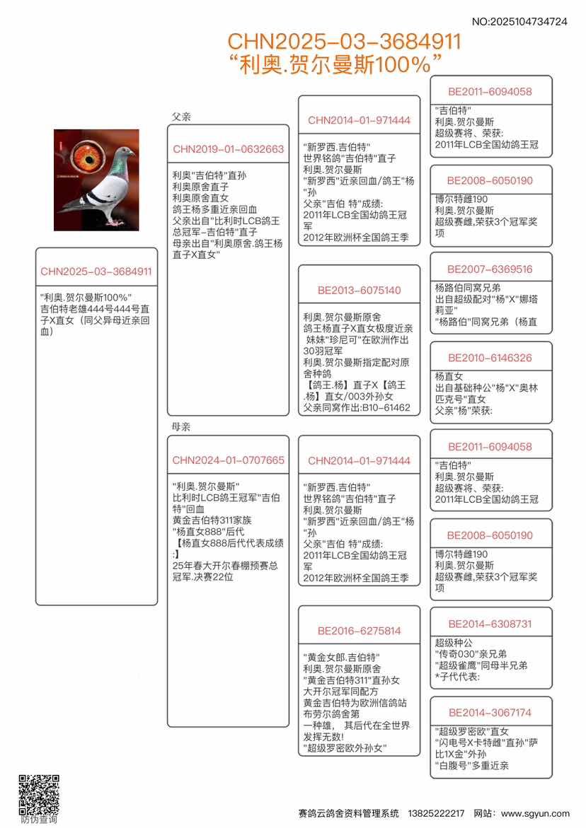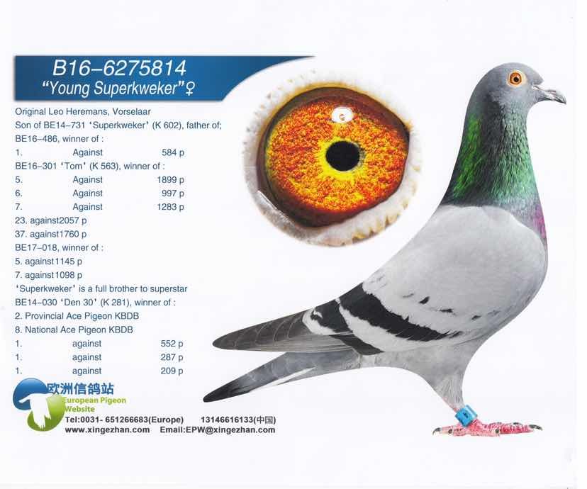 父亲: B14-6308731“超级种鸽(全省鸽王亚军全兄弟)”-超级育种:直子获魁夫兰冠军-直子获5位/6位/7位等-直子17次参赛14次入赏 -“吉伯特直孙”/“杨外孙”