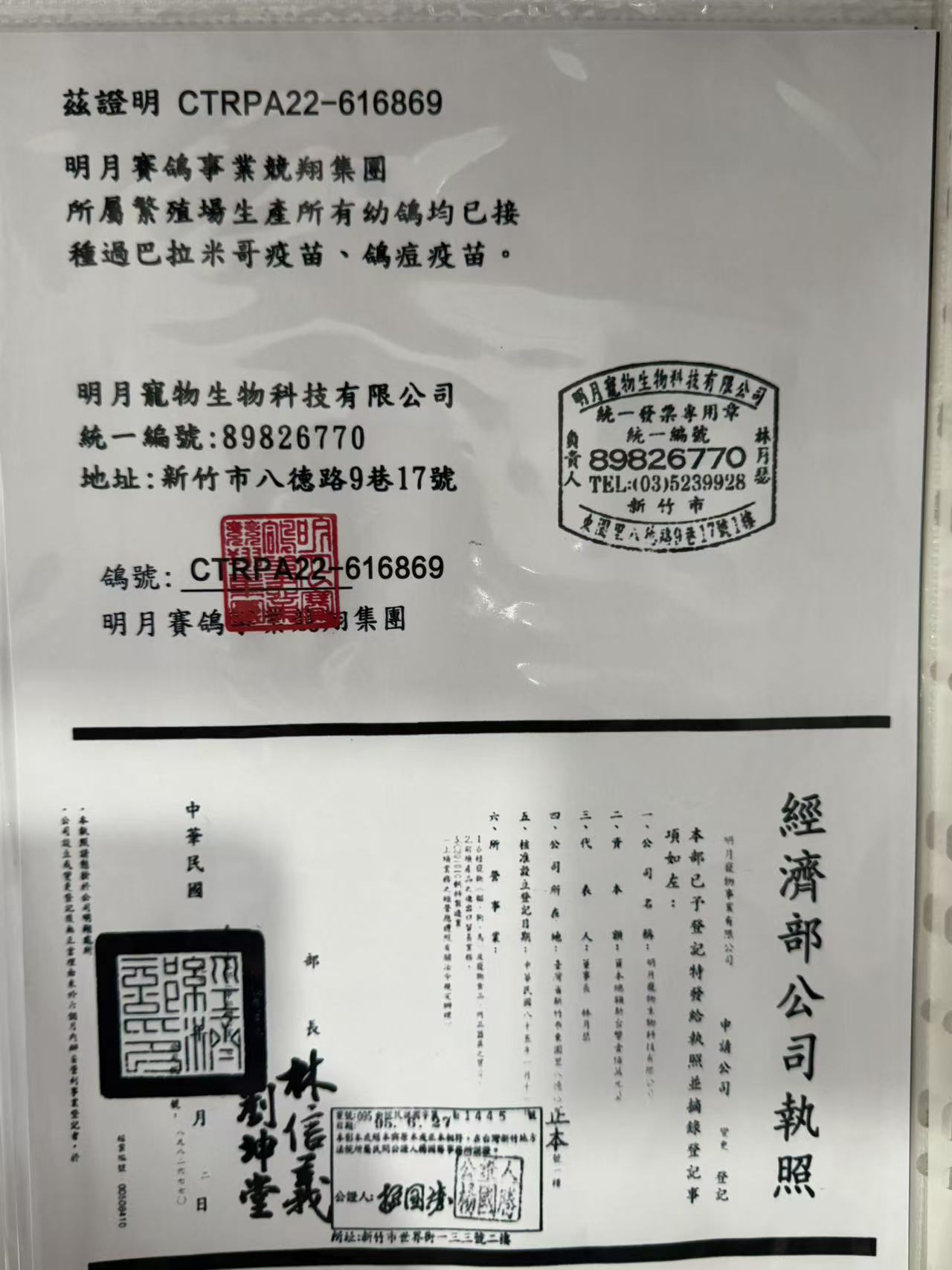 1597568 | 台湾黄肆烔作育 ”闪电桑杰士近亲“ | ¥200元 | 1次 |