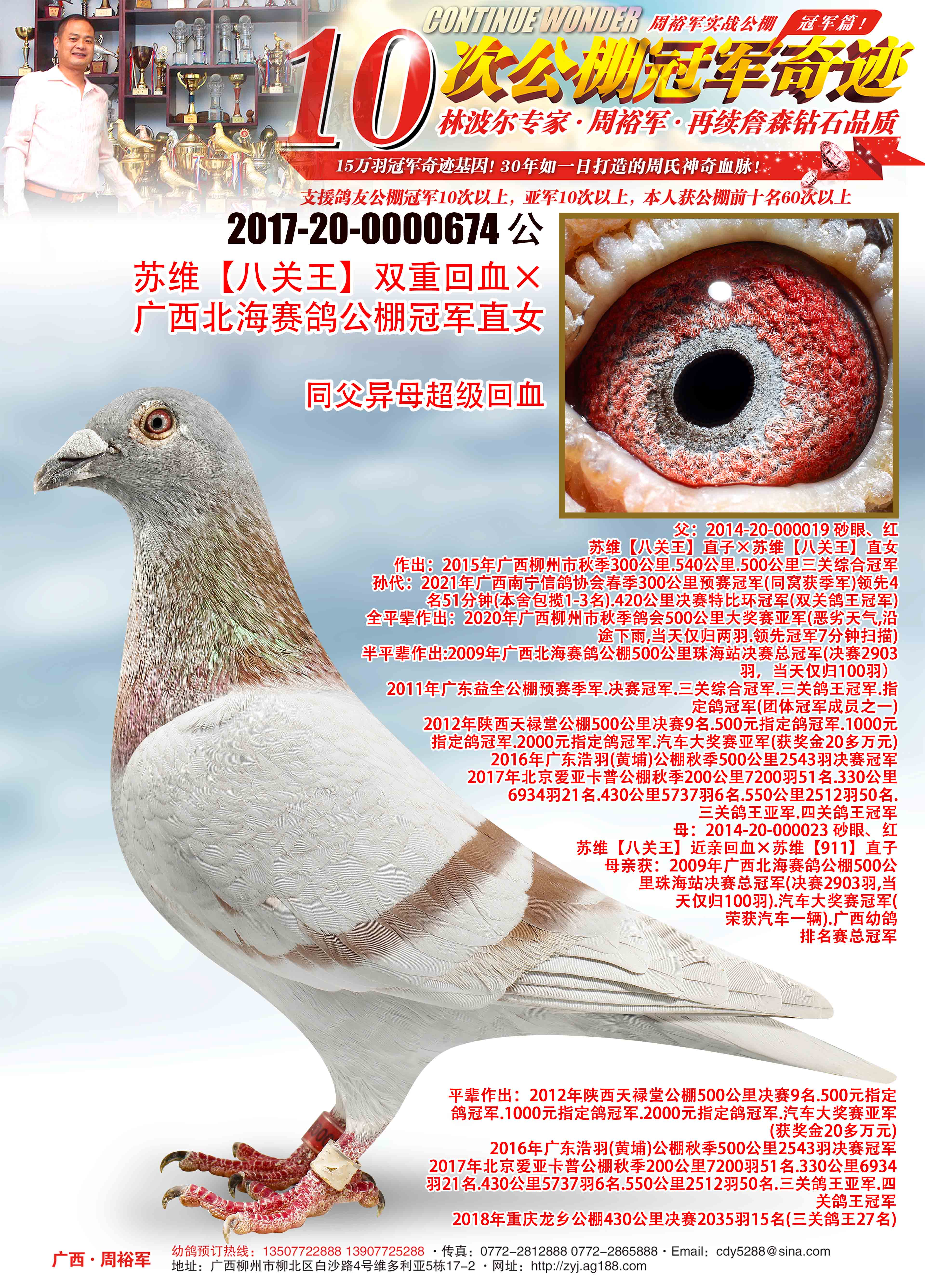 2017-20-0000674 砂眼、红 ♂ 苏维【八关王】双重回血×广西北海赛鸽公棚冠军直女