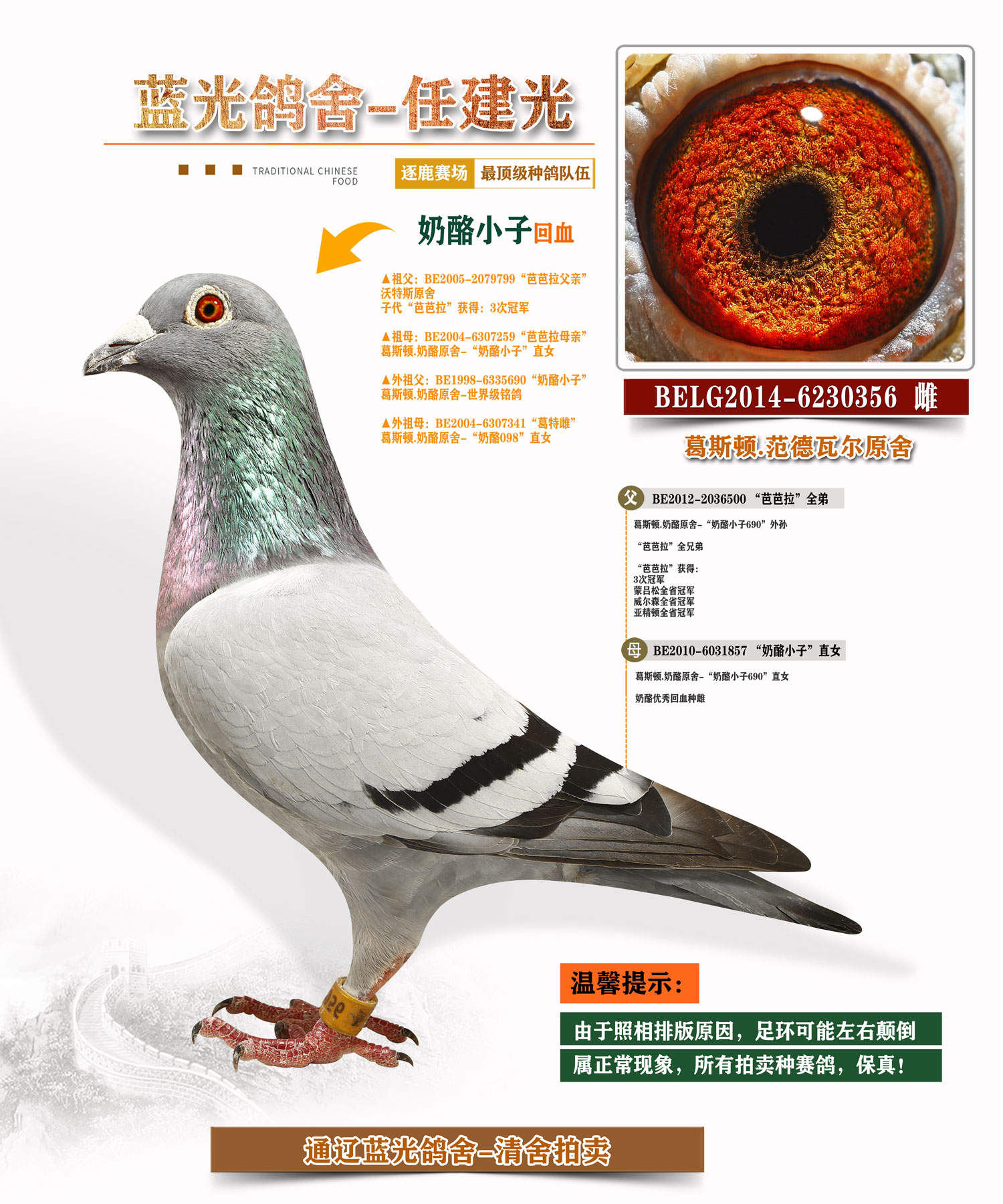 本次清舍,请各位鸽友一定不要错过,一定不要错过,种鸽阵容十分强大,国内外最顶级辈分,鸽主打了20多年比赛,常年征战各大赛场,成绩突出,真实可查,这里面都是最实站的鸽系,最优秀的种鸽,此次清舍的种鸽相信拿回去(百分之90)都能用出来,请您一定珍惜。