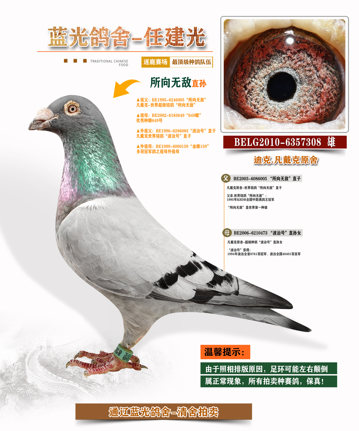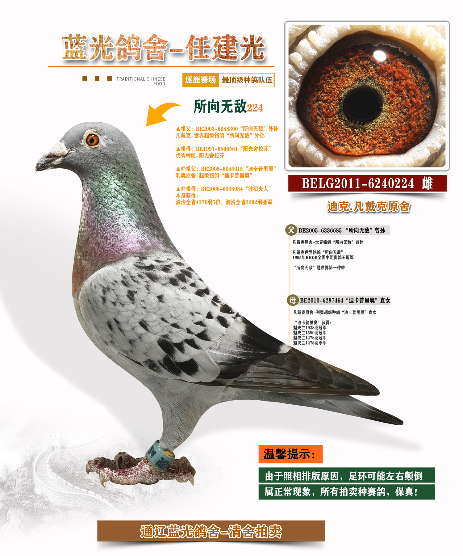 本次清舍,请各位鸽友一定不要错过,一定不要错过,种鸽阵容十分强大,国内外最顶级辈分,鸽主打了20多年比赛,常年征战各大赛场,成绩突出,真实可查,这里面都是最实站的鸽系,最优秀的种鸽,此次清舍的种鸽相信拿回去(百分之90)都能用出来,请您一定珍惜。