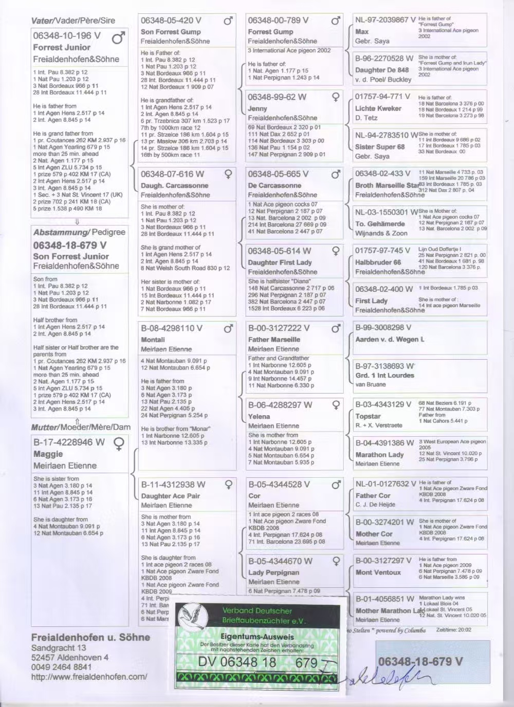 2019年圣维仙国际冠军-"成鸽组"冠军,翔距999.513 km, 创下平均分速1052.16 米/分(艾迪.福泰因)