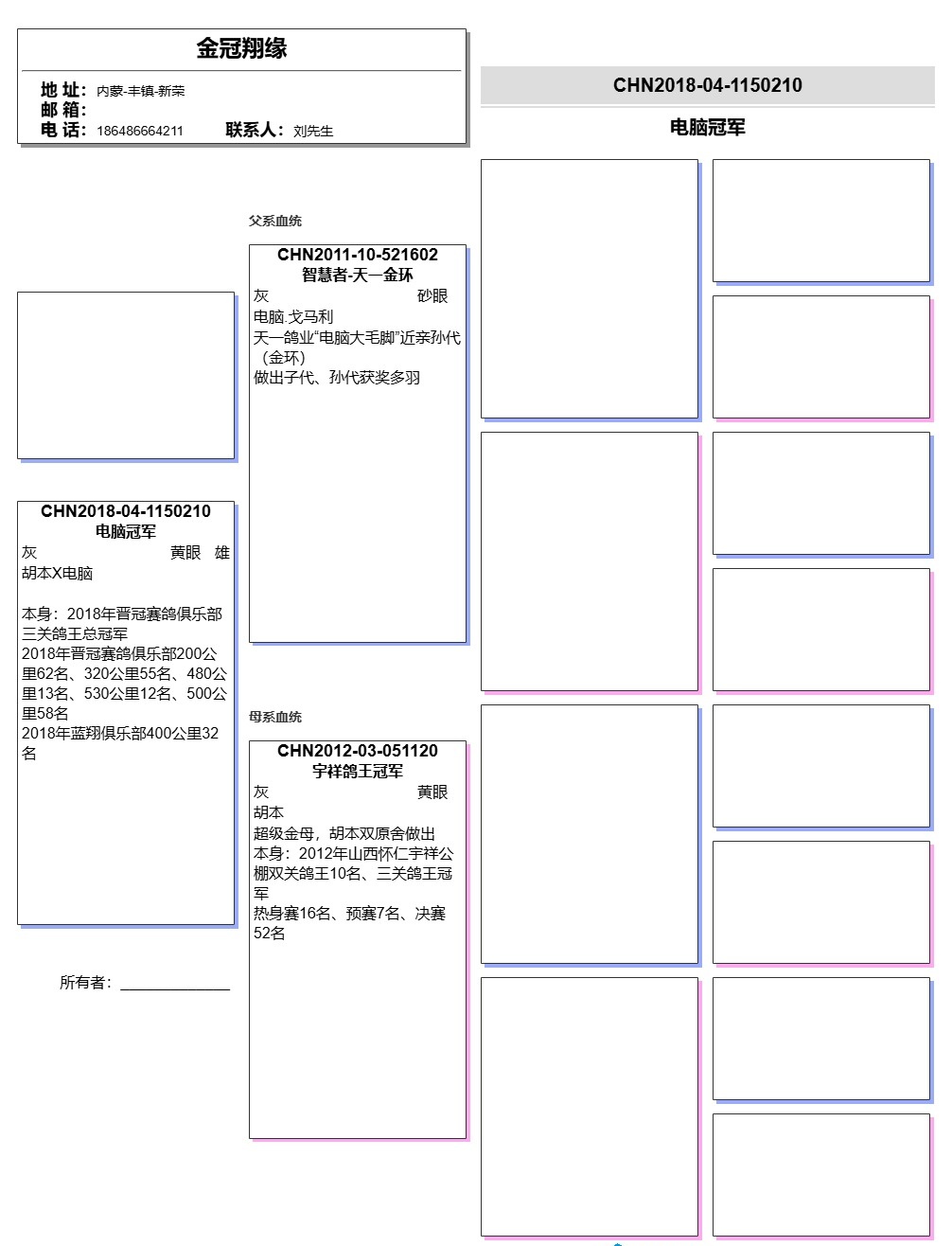4.拍卖鸽友血统书的我们会全部上传,因为有非商业实战型鸽舍没有血统书,详细介绍都在照片说明中标注,所以有血统书和照片的我们会随鸽发走,没有血统书的,我们会发A4照片一张。
