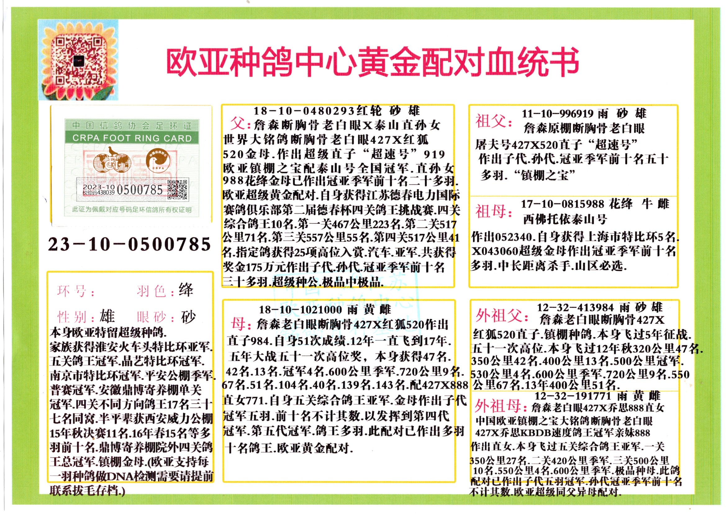 24年秋南京特比环欧亚荣获大团体冠军.小团体冠军551公里大特比13名.14名.16名.19名.20名.21名.24名.26名.27名.28名.42名.52名.54名.57名.65名.66名.68名.70名.71名.72名.74名.76名.80名.82名.83名.84名.85名.86名.90名.92名.110名.116名.121名.122名.128名.131名.158名.161名.164名.165名.166名.172名.174名.177名.182名.195名.196名.201名.205名.208名.210名.216名.253名.269名.275名.276名.294名.296名.299名,,24年秋云南天南铜都公棚决赛415名.天南铜都小棚决赛409名.云南玉活公棚决赛102名.490名.团体32名上笼二羽进二羽,天南铜都大棚506公里决赛445名。热烈祝贺河北省巨鹿县李兰生老师用欧亚泰山号血系连续十一年夺冠军,河北省国家赛冠军.全国季军等多次前十名高位,扬州王军王总用欧亚利奥24年春季获山东翔宇公棚决赛33名盖比53名。南京刘正龙刘总用欧亚盖比获得24年秋山东潍坊国际公棚决赛42名.精英赛30名.三关鸽王71名.决赛86名.加站赛16名.南京市特比环A组鸽王9名.B组鸽王5名.6名.C组鸽王5名.精英赛冠军4名.技能赛A组冠军4名.5名.秦淮区特比环荣获15名.46名.48名.87名。四川西昌徐亮徐总用欧亚利奥获得凉山州聚友决赛177名.第二关亚军双关鸽王19名.三关鸽王105名.云南豪庭公棚决赛603名。热烈祝贺24年四川重庆翔园鸽舍用欧亚泰山号荣获春季400公里冠军.秋季500公里冠军,河北王总用詹森X利奥获得千羽千翔公棚400公里冠军,广东蔡楷焕荣获24年秋爱好者 赛鸽俱乐部三关鸽王季军.一关420公里99名.二关450公里11名.三关520公里32名.单关季军.7名.12名,江西李卫兴荣获贵州红枫公棚8名.共翔俱乐部寄养棚四关综合鸽王30名.一关400公里78名.二关500公里55名.三关520公里37名.四关500公里57名.同父母获公棚18名.雷鸣获得武汉黄浦育翔中心冠军,四川陈文获得四川明鸿俱乐部300公里梦幻2名.3名.4名.9名.10名.13名.14名.15名.31名.34名.40名.41名.42名.43名.69名.71名.72名.73名.74名.94名.95名.97名.98名.99名.419公里决赛荣获总冠军7名.总共归巢9羽,四川徐亮获豪庭决赛603名,山西郑勇获得山西泰鑫公棚决赛255名詹森红狐,热烈祝贺马总获得开尔(飞跃队)决赛9名获奖金1310000万元.第一关52名,天津津福资赛180公里96名.获奖金429543万元,欧亚支持全国鸽友24年秋多人报喜 祝大家取得更好成绩,给欧亚报喜鸽友欧亚决定给每人赠送一羽超级种鸽。欧亚俱乐部特比环多关鸽王成绩:15年秋淮安特比环黑色星期一全会上笼9700多羽,当天无鸽归巢,第二天全会归巢357羽,本舍归巢158羽.前十名八羽.前一百名归巢57羽,16年春季获五关鸽王总冠军,总亚军四名.六名.七名.九名.十名.晶艺俱乐部520公里冠亚季军5名.6名.7名.9名.11名等,火车头冠军.季军6名.8名.9名.10名,16年秋晶艺俱乐部特比环520公里亚军.季军4名.6名.7名.9名,15年春南京白下特比环冠军.亚军.季军6名.7名.8名.9名.10名.指定鸽A B组获得冠军.亚军.季军4名.5名.,17年淮安特比环亚军.4名.5名.7名.8名.10名.六关鸽王总冠军.4名.6名.9名.10名,寄养棚宿迁刘总20羽特比环获冠军.季军.4名.7名.8名.9名等。18年荣获万羽特比环六关鸽王总冠军.总亚军.总季军.6名.8名.十名.单关四羽冠军.二羽亚军.四羽季军.前十名27羽。19年秋万羽特比环六关鸽王总亚军.总季军.5名.8名等,单关二羽冠军.三羽亚军.一羽季军前十名31羽。20年秋淮安市鸽会四关特比环大赛风雨无阻鸽王亚军.鸽王六名,金品俱乐部万羽特比环六关鸽王总冠军,总亚军.四名.五名.六名.七名.八名.十名.前二百名鸽王35羽,单关冠亚季军前十名四十多羽,火车头五关鸽王季军.六名.八名.前二百名鸽王十七羽。20年春荣获淮安五区一市四关鸽王总冠军.亚军.四名.八名.九名。21年秋荣获金品万羽特比环大赛六关鸽王总亚军.总季军.四名.七名.九名.十名.单关冠亚军季军前十名三十多羽。火车头协会鸽王六名.七名.十名.单关前十名十七羽。22年秋荣获鸽王总冠军.总亚军.5名.7名.8名.9名.11名.单关冠亚季军前十名三十多羽,第一关单关前二百名四十多羽,第二关前二百名三十多羽,第三关前二百名四十多羽,第四关前二百名四十多羽,第五关前一百名53羽。23年秋荣获鸽王季军.五名.八名.十名.13名.17名.20名.27名等多羽鸽王.单关前十名二十多羽。公棚.寄养棚部分成绩:16年秋宁夏黄河公棚总冠军电脑戈马力指定通炮冠军,17年送八羽参赛获得鸽王八名进奖四名,支持韩总荣获八名。支持鸽友荣获宁夏中卫公棚决赛总冠军.精英赛冠军,支持18年宁夏黄河公棚决赛冠军詹森X泰山。安徽鼎博寄养棚院内外四关鸽王总冠军.鸽王十七名.三十七名同窝,鸽王39名.42名.58名.67名。18年山东公棚预赛冠军.决赛65名.送八羽进奖五羽.指定获奔驰汽车一辆。支持鸽友获得云南蓝云公棚冠军.盖比X佛卡门。支持鸽友荣获云南银集公棚决赛冠军 詹森427X520血系 速度赛6700羽冠军。17年荣获金马俱乐部寄养棚四关鸽王总冠军.季军.六名.八名.第一关冠军.亚军.季军四名.七名.十一名.金牌教练奖。支持鸽友18年北京费翔公棚预赛九名电脑X桑杰士,支持鸽友荣获陕西威力公棚决赛11名.内蒙古临河寄养棚四关鸽王六名.詹森配泰山,支持河北王总用欧亚詹森427配胡本喜获20年秋开尔青年棚季军。云南东荣公棚16年预赛冠军.决赛77名.17年决赛12名.詹森红狐X泰山,17年平安公棚决赛4名 詹森427。欧亚获得21年金母寄养棚第一关四名.第二关5名.第三关5名.6名.7名.10名.三关鸽王总冠军,四关鸽王14名.十羽鸽王。支持河