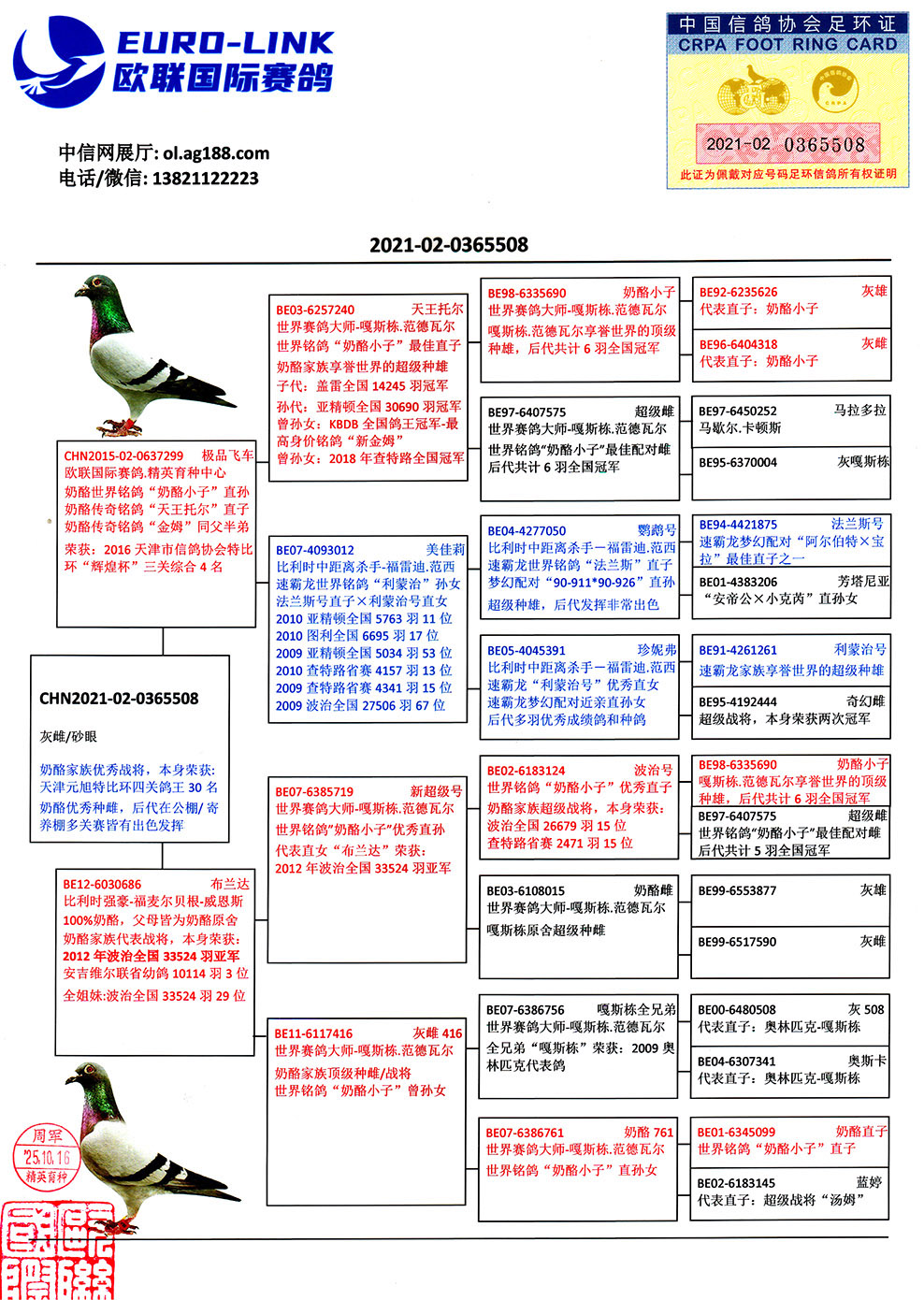 1599100 | 世界铭鸽“最佳基特尔”最高代近亲 | ¥6000元 | 9次 |