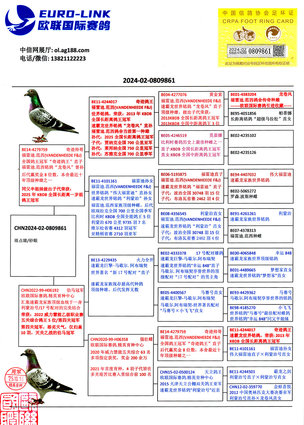 1599100 | 世界铭鸽“最佳基特尔”最高代近亲 | ¥6000元 | 9次 |