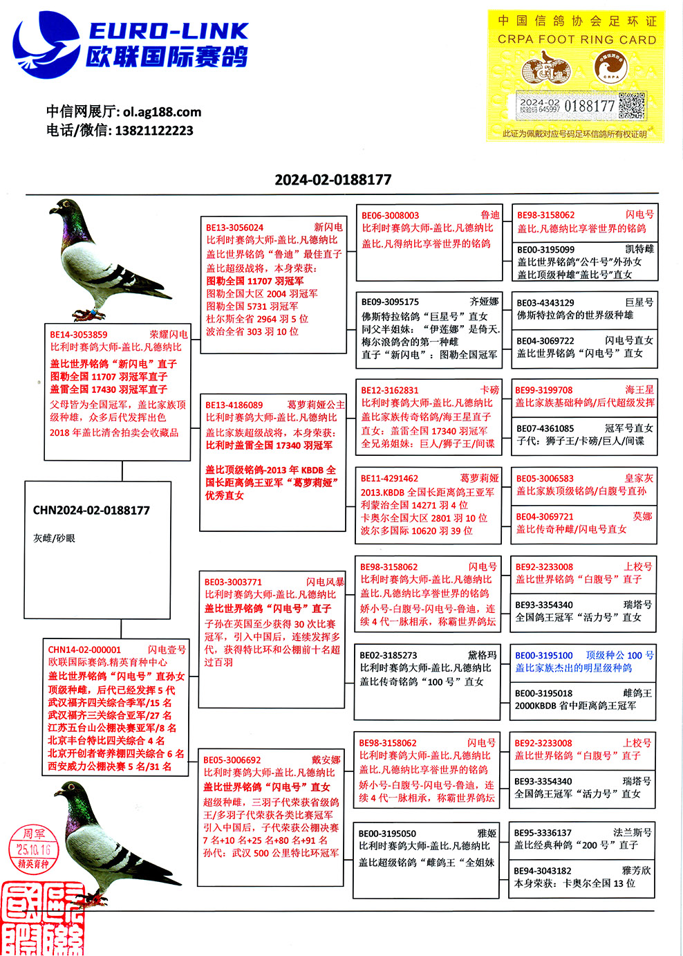 1599100 | 世界铭鸽“最佳基特尔”最高代近亲 | ¥6000元 | 9次 |