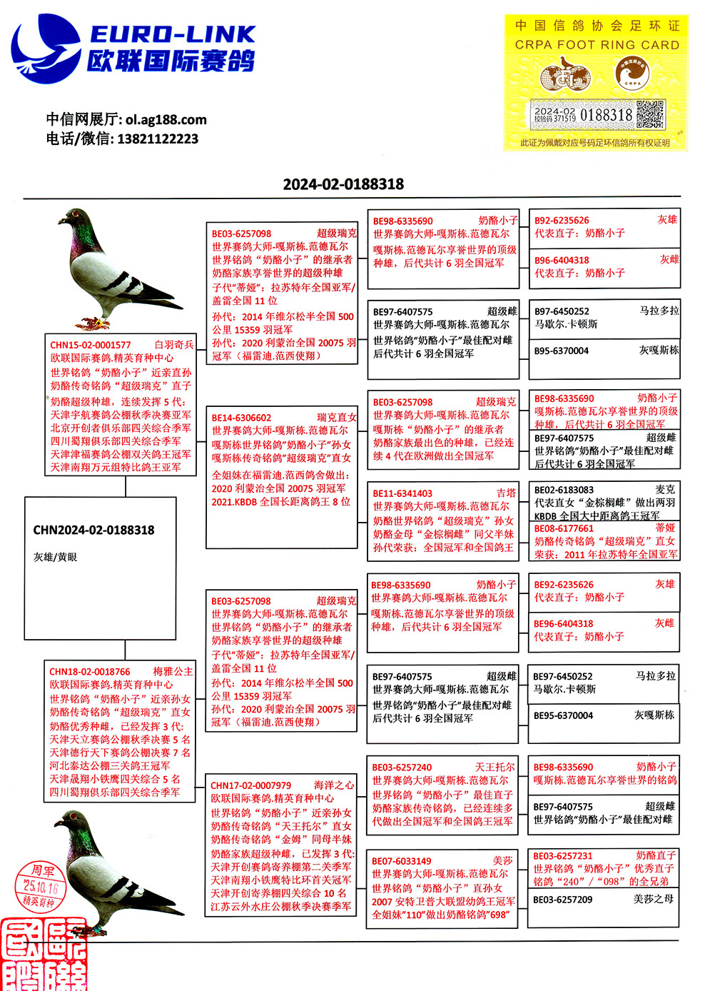 1599100 | 世界铭鸽“最佳基特尔”最高代近亲 | ¥6000元 | 9次 |
