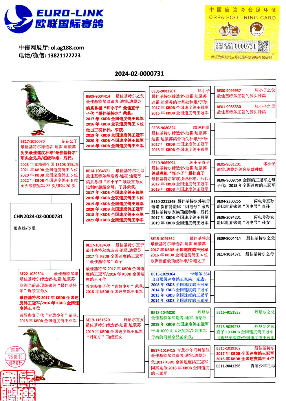 - 当前查看拍卖鸽:世界铭鸽“最佳基特尔”最高代近亲