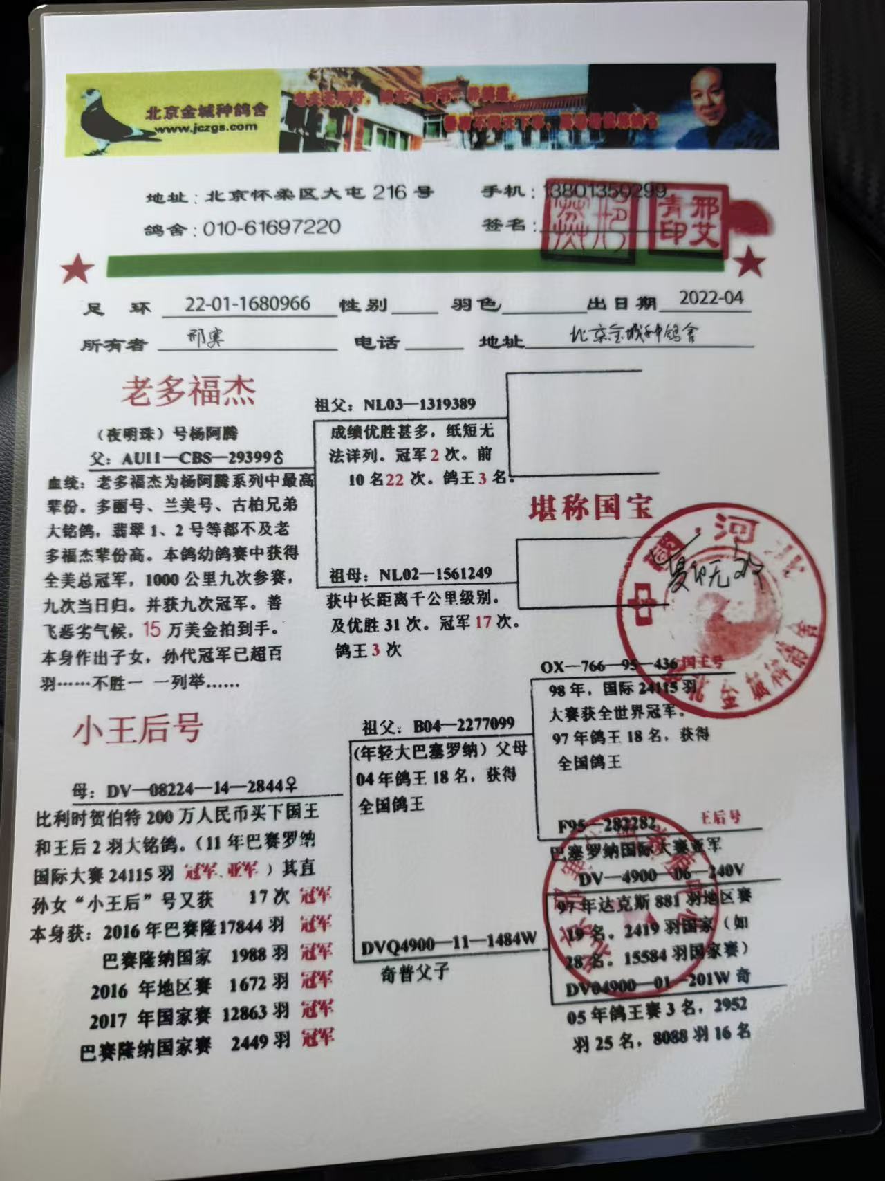 - 当前查看拍卖鸽:北京金城种鸽舍“老多福杰”夜明珠号