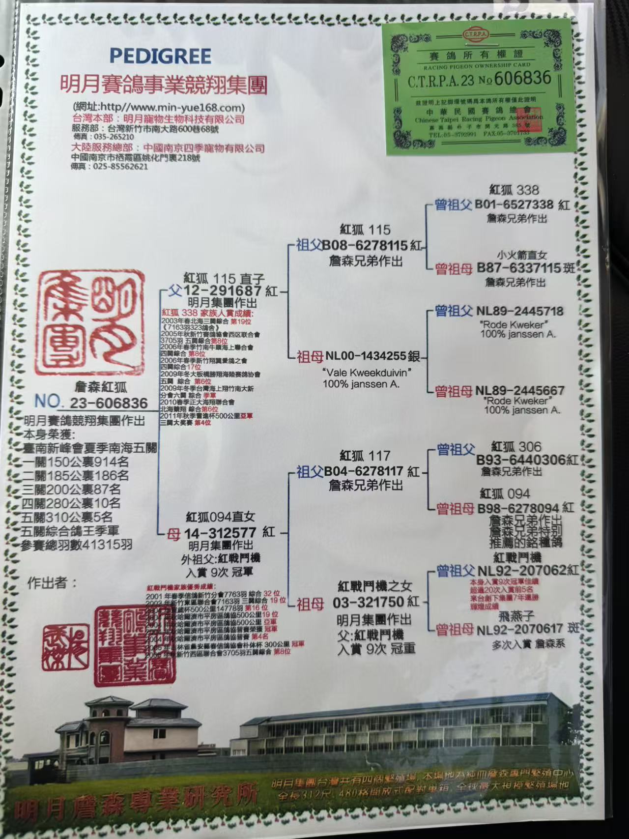 台湾明月赛鸽集团作出”詹森红狐“ 本身五关鸽王季军![]()