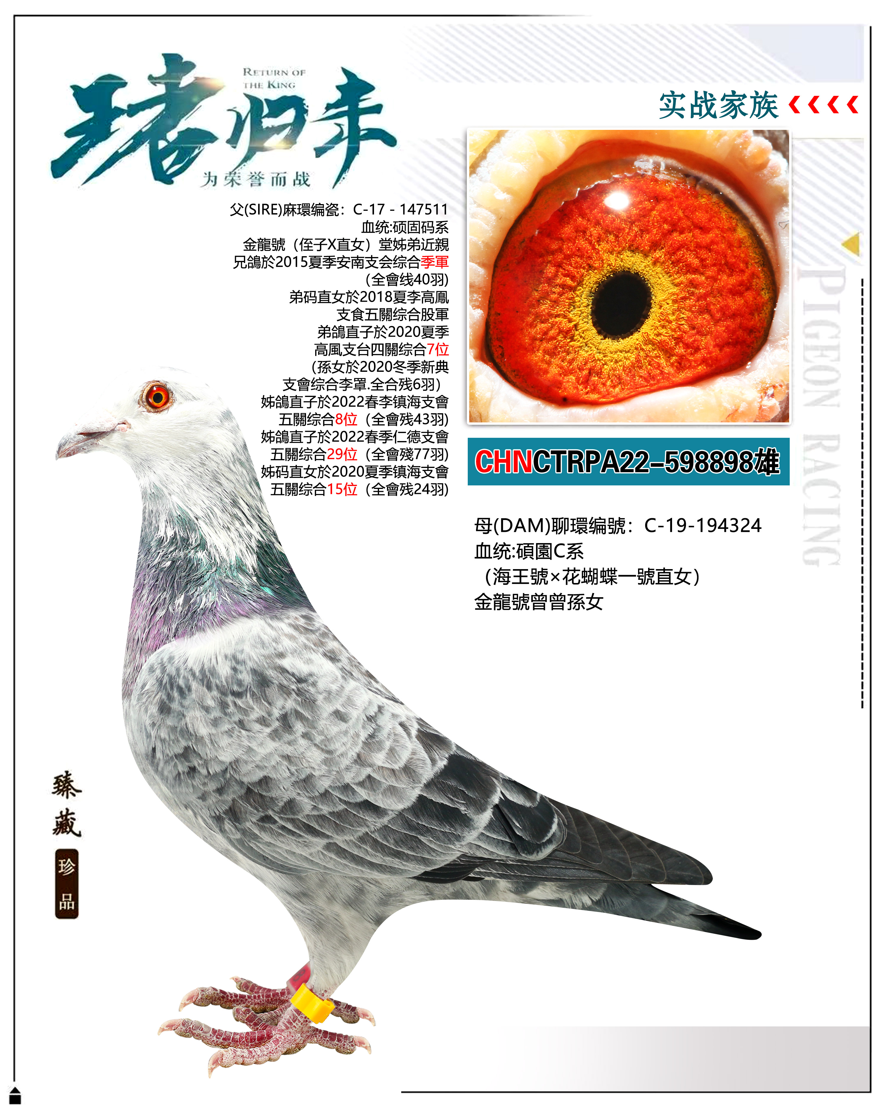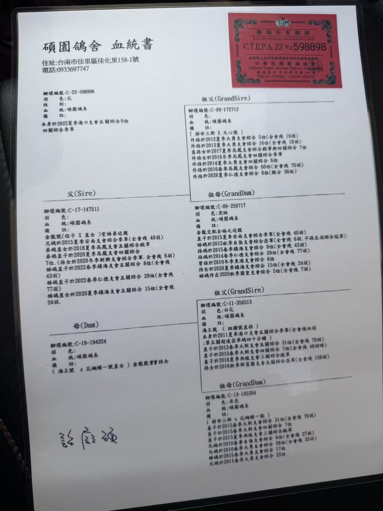 - 当前查看拍卖鸽:台湾硕园鸽舍 本身成绩五关综合9名 四