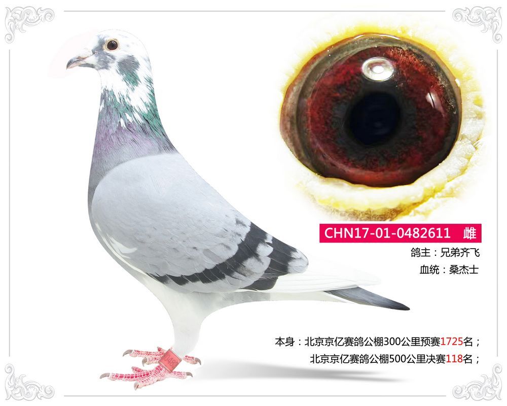 CHN17-01-0482611 雌 本身:北京京亿赛鸽公棚300公里预赛1725名;北京京亿赛鸽公棚500公里决赛118名;鸽主:兄弟齐飞 咨询电话: 13601192027 白宇 (微信同号)运输方式:快递60/羽【新疆西藏包括】、长途车100元【不论羽数】、飞机400元"