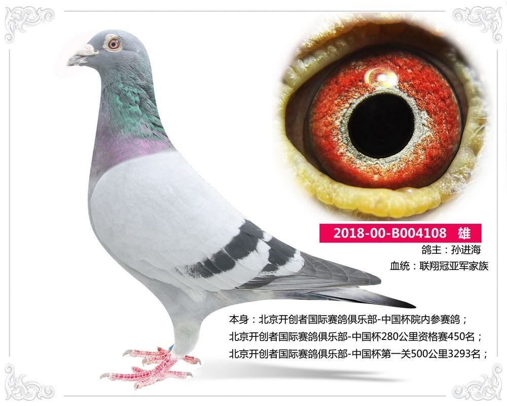 2018-00-B004108 雄 本身:北京开创者国际赛鸽俱乐部-中国杯院内参赛鸽;北京开创者国际赛鸽俱乐部-中国杯280公里资格赛450名;北京开创者国际赛鸽俱乐部-中国杯第一关500公里3293名;鸽主:孙进海 咨询电话: 13601192027 白宇 (微信同号)运输方式:快递60/羽【新疆西藏包括】、长途车100元【不论羽数】、飞机400元"