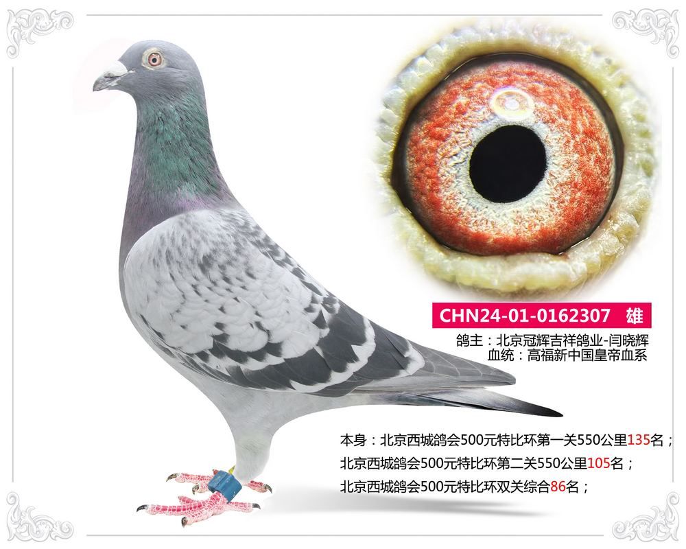 CHN24-01-0162307 雄 本身:北京西城鸽会500元特比环第一关550公里135名;北京西城鸽会500元特比环第二关550公里105名;北京西城鸽会500元特比环双关综合86名;鸽主:北京冠辉吉祥鸽业-闫晓辉 咨询电话: 13601192027 白宇 (微信同号)运输方式:快递60/羽【新疆西藏包括】、长途车100元【不论羽数】、飞机400元"