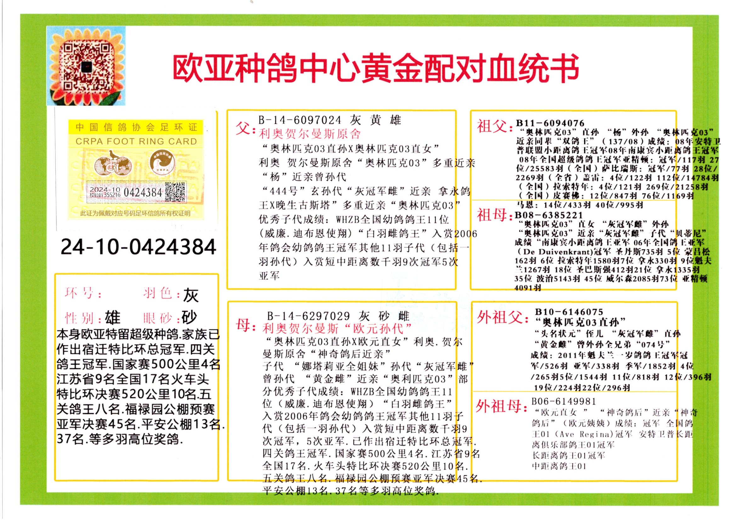24年秋南京特比环欧亚荣获大团体冠军.小团体冠军551公里大特比13名.14名.16名.19名.20名.21名.24名.26名.27名.28名.42名.52名.54名.57名.65名.66名.68名.70名.71名.72名.74名.76名.80名.82名.83名.84名.85名.86名.90名.92名.110名.116名.121名.122名.128名.131名.158名.161名.164名.165名.166名.172名.174名.177名.182名.195名.196名.201名.205名.208名.210名.216名.253名.269名.275名.276名.294名.296名.299名,,24年秋云南天南铜都公棚决赛415名.天南铜都小棚决赛409名.云南玉活公棚决赛102名.490名.团体32名上笼二羽进二羽,天南铜都大棚506公里决赛445名。热烈祝贺河北省巨鹿县李兰生老师用欧亚泰山号血系连续十一年夺冠军,河北省国家赛冠军.全国季军等多次前十名高位,扬州王军王总用欧亚利奥24年春季获山东翔宇公棚决赛33名盖比53名。南京刘正龙刘总用欧亚盖比获得24年秋山东潍坊国际公棚决赛42名.精英赛30名.三关鸽王71名.决赛86名.加站赛16名.南京市特比环A组鸽王9名.B组鸽王5名.6名.C组鸽王5名.精英赛冠军4名.技能赛A组冠军4名.5名.秦淮区特比环荣获15名.46名.48名.87名。四川西昌徐亮徐总用欧亚利奥获得凉山州聚友决赛177名.第二关亚军双关鸽王19名.三关鸽王105名.云南豪庭公棚决赛603名。热烈祝贺24年四川重庆翔园鸽舍用欧亚泰山号荣获春季400公里冠军.秋季500公里冠军,河北王总用詹森X利奥获得千羽千翔公棚400公里冠军,广东蔡楷焕荣获24年秋爱好者 赛鸽俱乐部三关鸽王季军.一关420公里99名.二关450公里11名.三关520公里32名.单关季军.7名.12名,江西李卫兴荣获贵州红枫公棚8名.共翔俱乐部寄养棚四关综合鸽王30名.一关400公里78名.二关500公里55名.三关520公里37名.四关500公里57名.同父母获公棚18名.雷鸣获得武汉黄浦育翔中心冠军,四川陈文获得四川明鸿俱乐部300公里梦幻2名.3名.4名.9名.10名.13名.14名.15名.31名.34名.40名.41名.42名.43名.69名.71名.72名.73名.74名.94名.95名.97名.98名.99名.419公里决赛荣获总冠军7名.总共归巢9羽,四川徐亮获豪庭决赛603名,山西郑勇获得山西泰鑫公棚决赛255名詹森红狐,热烈祝贺马总获得开尔(飞跃队)决赛9名获奖金1310000万元.第一关52名,天津津福资赛180公里96名.获奖金429543万元,欧亚支持全国鸽友24年秋多人报喜 祝大家取得更好成绩,给欧亚报喜鸽友欧亚决定给每人赠送一羽超级种鸽。欧亚俱乐部特比环多关鸽王成绩:15年秋淮安特比环黑色星期一全会上笼9700多羽,当天无鸽归巢,第二天全会归巢357羽,本舍归巢158羽.前十名八羽.前一百名归巢57羽,16年春季获五关鸽王总冠军,总亚军四名.六名.七名.九名.十名.晶艺俱乐部520公里冠亚季军5名.6名.7名.9名.11名等,火车头冠军.季军6名.8名.9名.10名,16年秋晶艺俱乐部特比环520公里亚军.季军4名.6名.7名.9名,15年春南京白下特比环冠军.亚军.季军6名.7名.8名.9名.10名.指定鸽A B组获得冠军.亚军.季军4名.5名.,17年淮安特比环亚军.4名.5名.7名.8名.10名.六关鸽王总冠军.4名.6名.9名.10名,寄养棚宿迁刘总20羽特比环获冠军.季军.4名.7名.8名.9名等。18年荣获万羽特比环六关鸽王总冠军.总亚军.总季军.6名.8名.十名.单关四羽冠军.二羽亚军.四羽季军.前十名27羽。19年秋万羽特比环六关鸽王总亚军.总季军.5名.8名等,单关二羽冠军.三羽亚军.一羽季军前十名31羽。20年秋淮安市鸽会四关特比环大赛风雨无阻鸽王亚军.鸽王六名,金品俱乐部万羽特比环六关鸽王总冠军,总亚军.四名.五名.六名.七名.八名.十名.前二百名鸽王35羽,单关冠亚季军前十名四十多羽,火车头五关鸽王季军.六名.八名.前二百名鸽王十七羽。20年春荣获淮安五区一市四关鸽王总冠军.亚军.四名.八名.九名。21年秋荣获金品万羽特比环大赛六关鸽王总亚军.总季军.四名.七名.九名.十名.单关冠亚军季军前十名三十多羽。火车头协会鸽王六名.七名.十名.单关前十名十七羽。22年秋荣获鸽王总冠军.总亚军.5名.7名.8名.9名.11名.单关冠亚季军前十名三十多羽,第一关单关前二百名四十多羽,第二关前二百名三十多羽,第三关前二百名四十多羽,第四关前二百名四十多羽,第五关前一百名53羽。23年秋荣获鸽王季军.五名.八名.十名.13名.17名.20名.27名等多羽鸽王.单关前十名二十多羽。公棚.寄养棚部分成绩:16年秋宁夏黄河公棚总冠军电脑戈马力指定通炮冠军,17年送八羽参赛获得鸽王八名进奖四名,支持韩总荣获八名。支持鸽友荣获宁夏中卫公棚决赛总冠军.精英赛冠军,支持18年宁夏黄河公棚决赛冠军詹森X泰山。安徽鼎博寄养棚院内外四关鸽王总冠军.鸽王十七名.三十七名同窝,鸽王39名.42名.58名.67名。18年山东公棚预赛冠军.决赛65名.送八羽进奖五羽.指定获奔驰汽车一辆。支持鸽友获得云南蓝云公棚冠军.盖比X佛卡门。支持鸽友荣获云南银集公棚决赛冠军 詹森427X520血系 速度赛6700羽冠军。17年荣获金马俱乐部寄养棚四关鸽王总冠军.季军.六名.八名.第一关冠军.亚军.季军四名.七名.十一名.金牌教练奖。支持鸽友18年北京费翔公棚预赛九名电脑X桑杰士,支持鸽友荣获陕西威力公棚决赛11名.内蒙古临河寄养棚四关鸽王六名.詹森配泰山,支持河北王总用欧亚詹森427配胡本喜获20年秋开尔青年棚季军。云南东荣公棚16年预赛冠军.决赛77名.17年决赛12名.詹森红狐X泰山,17年平安公棚决赛4名 詹森427。欧亚获得21年金母寄养棚第一关四名.第二关5名.第三关5名.6名.7名.10名.三关鸽王总冠军,四关鸽王14名.十羽鸽王。支持河