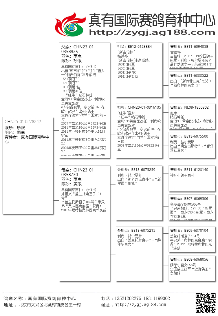 【在这三座金矿还未被世人发现之前,真有国际就第一时间把高品质的鸽子带到了国内,取得了空前的发挥。近几年大家才逐渐认识这几位大师鸽子的魅力。请记住!当任何商业鸽舍进入炒作后期的时候,他的鸽子质量与价值都会急剧下降,即便是詹森兄弟也难免于此。所以引进这家鸽舍最巅峰时期的鸽子,得以延续,才是真有国际成功的致胜法宝。】