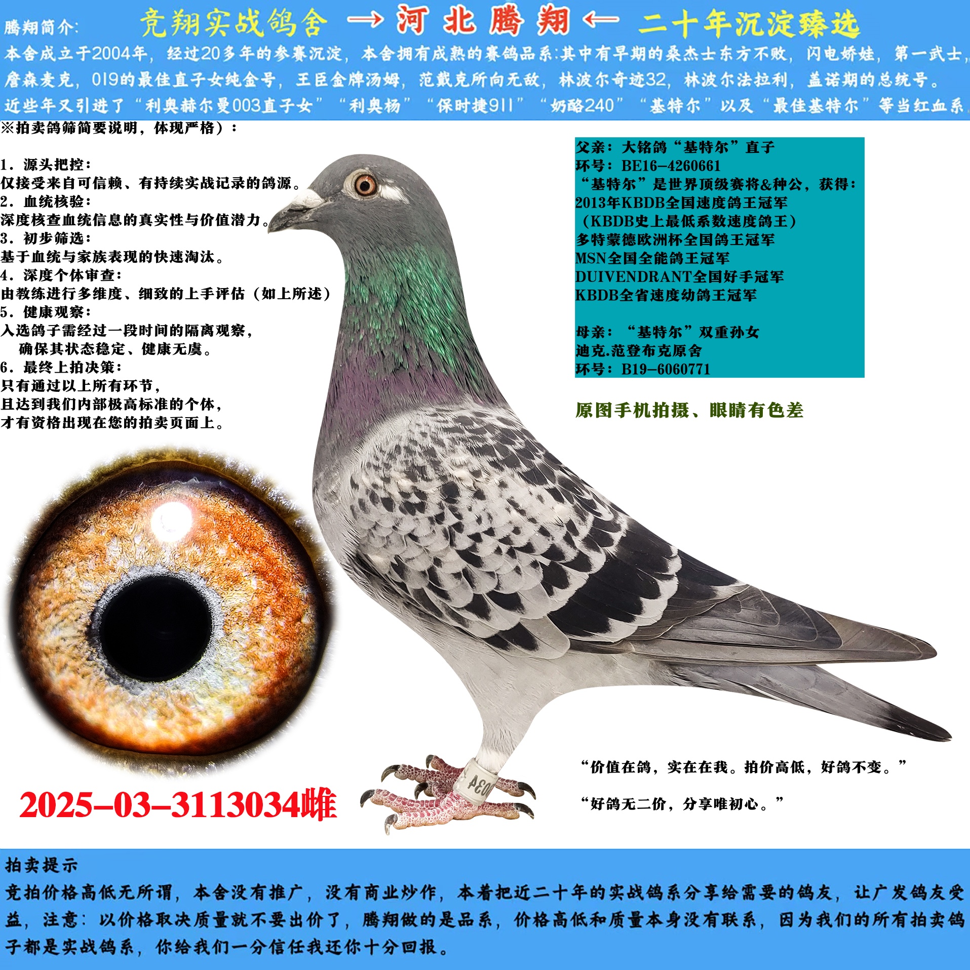 拍卖说明: 1、由于摄影师为整齐美观在后期制作图片时使用平面反转造成的画面呈现,图片平面反转会导致图片中显示的鸽子所带脚环,与实际鸽子所带脚环相反,这属于正常现象。 2、鸽子抵达时若发现严重生病状态及死亡。须立刻通知我们报备,以准备日后可能发生的补偿事宜;未及时报备病况或通知死亡状况者,我们无法做任何补偿。 3、运输时间:拍卖会结束后中标鸽友需1日内付款并支付运费100元.拍卖方2日内统一安排发货。 4.快递运输:拍卖使用快递运输,如果出现意外伤亡,请及时报备。 5.鸽子雌雄为摄影师分辨,可能有误差,雌雄错误不为退货理由。 全国一律发快递,新疆一次200、 运费一次100元、两只一箱、 手机 微信 同步:15032111164 ※拍卖鸽筛简要说明,体现严格): 本鸽要比照片完美的多,因为本舍每期拍卖的鸽子不多, 因此专业摄影师频繁拍摄不方便, 所以我们的拍卖鸽都由本舍工作人员用手机拍摄的原图来修饰, 因此造成效果不佳,眼睛色素友差异, 每一羽鸽子本身各方面都要比照片完美, 请大家把照片作为一种大致的参考吧!