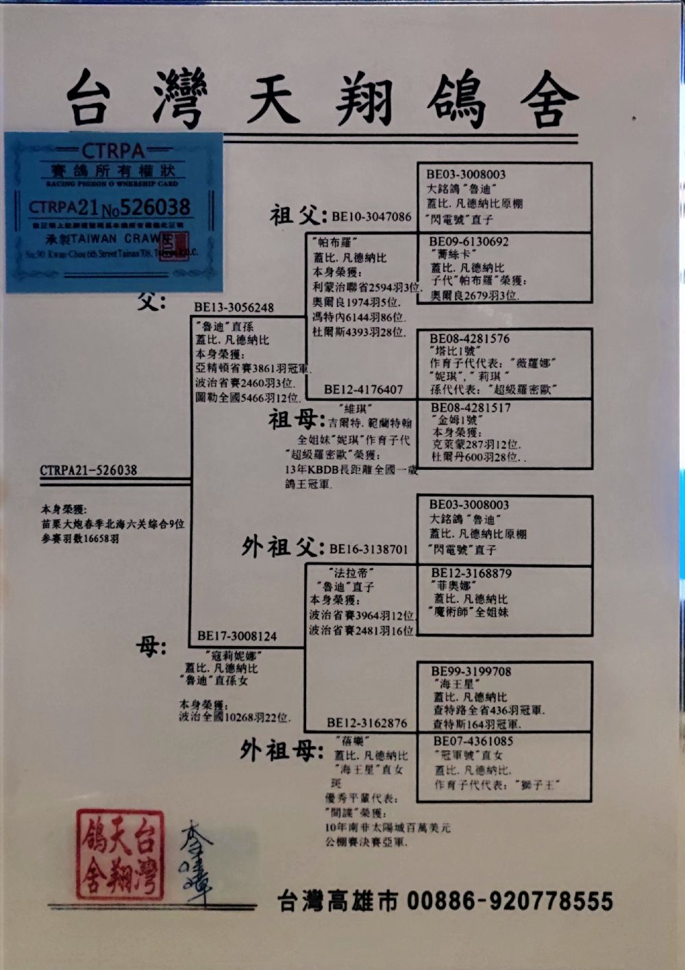 - 当前查看拍卖鸽:台湾天翔鸽舍六关综合9位