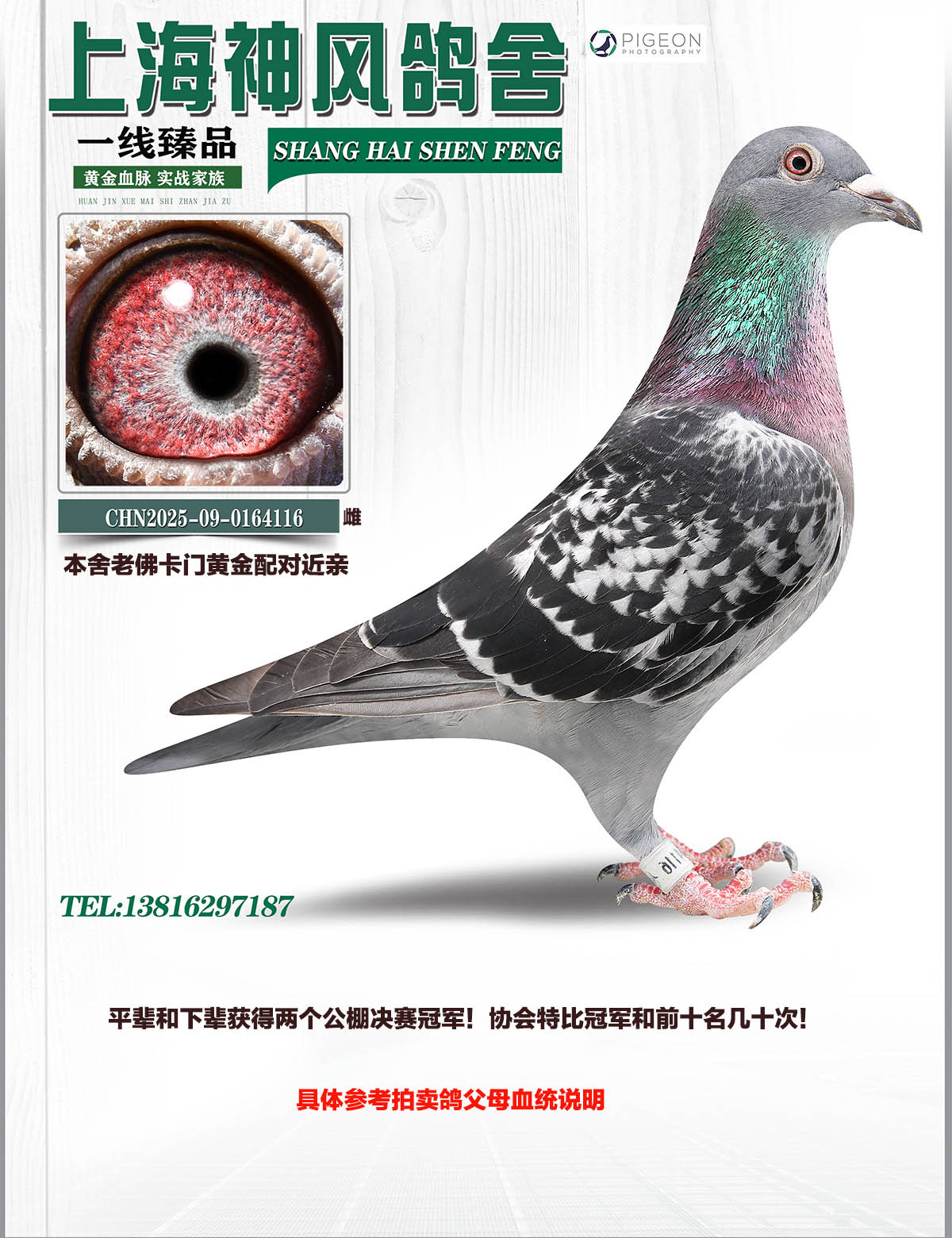 外祖母:潘特小姐。BELG-2005-6234345。雌。乔斯佛卡门原舍。大名鸽“阿诺德”作出。佛卡门顶级名鸽“派翠拉”外孙女。 "派翠拉”BELG-1995-6300210本身获得六次冠军。七次亚军。两次季军。三次四名。两次五名。三十余次前十名。直孙女,也就是本鸽平辈“玛丁娜”或8次冠军,25次前十名。老潘特号回血曾孙女。路易斯和贝利的直孙女。黑斑黄雌 超级种母! 父:阿诺德。BELG-2002-6058451本身五次前十名。老潘特潘特直孙 母:BELG-2004-608413本身357公里冠军。479公里亚军。作出多羽冠军鸽 祖父:老潘特最佳直子之一的“路易士”,作出名鸽“莱恩” 曾祖父:佛卡门超级名鸽“黑豹”波治冠军。直子女:“小黑豹”“路易士”“塞娜”“安卡”“晚生黑豹”“白金号”