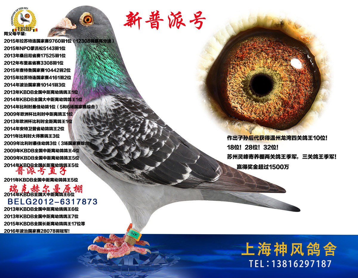 第一种雄普派号直子!所向无敌血统!作出子代获得温州龙湾四关鸽王10位!18位!28位!32位!苏州灵峰寄养棚两关鸽王季军,三关鸽王季军!公棚多关子孙后代获奖无数!获得奖金1500万以上!其兄弟作出子代北京开创者!天津开创者。北京长阳国际综合鸽王30羽以上!