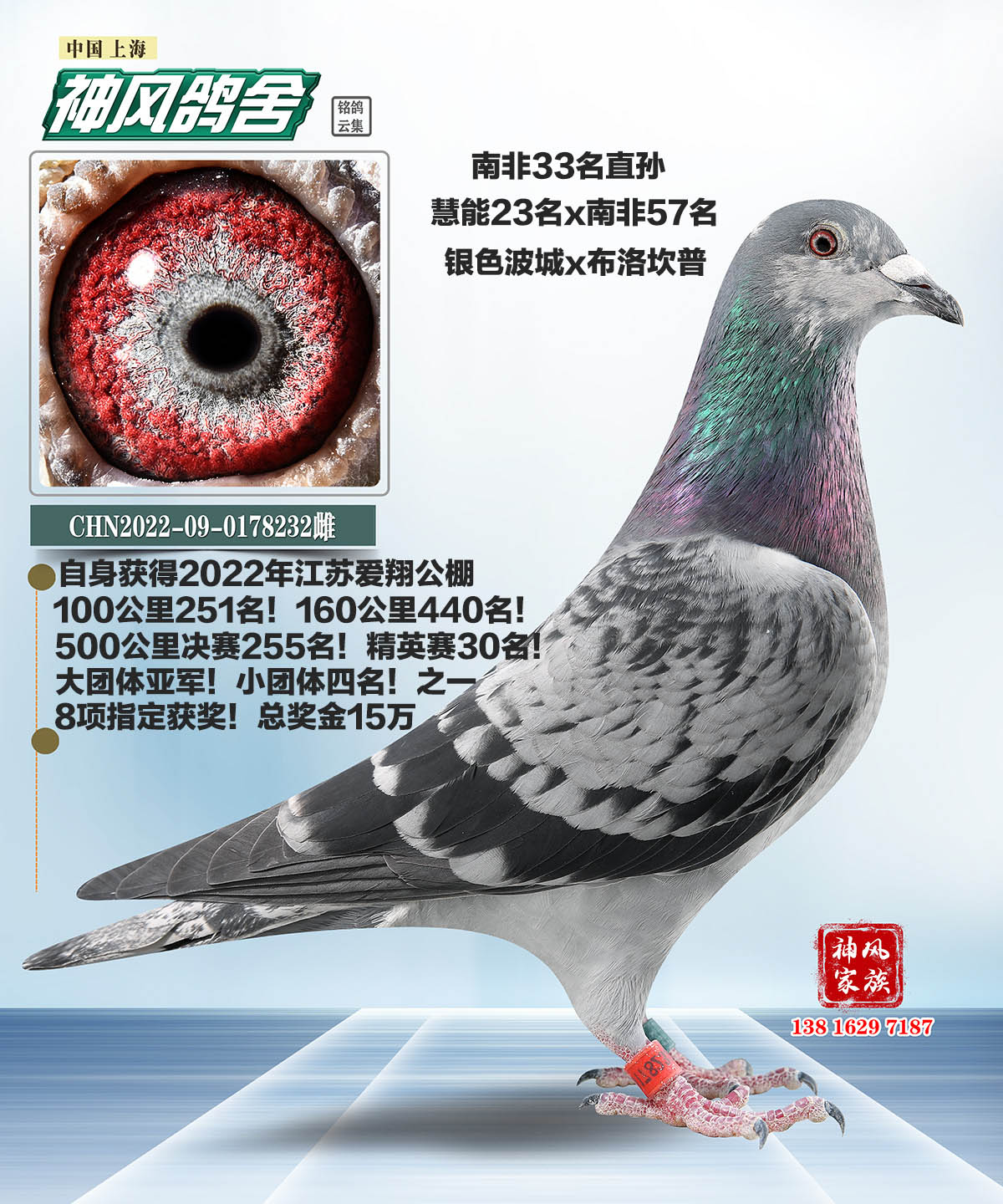 获得2022年江苏爱翔公棚400公里39名!109名!500公里决赛166名!255名!366名!897名!总共交4羽决赛全部入围!从160公里!280公里!400公里!500公里决赛!各项制定45项指定获奖!精英赛23名!30名!小团体亚军!大团体4名!赢得奖金百万!