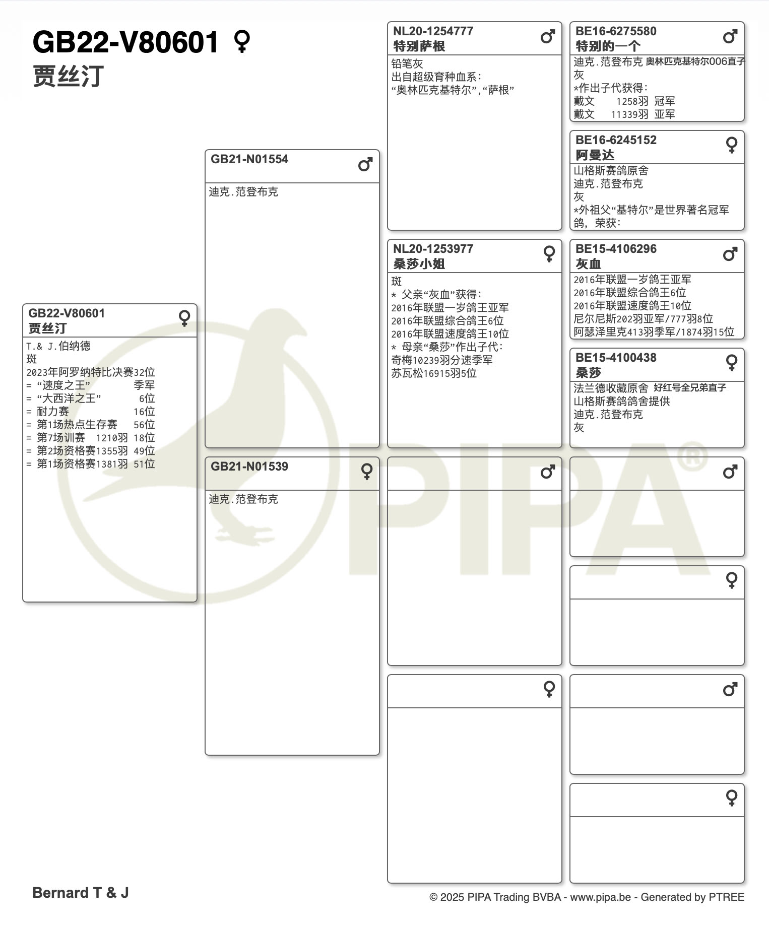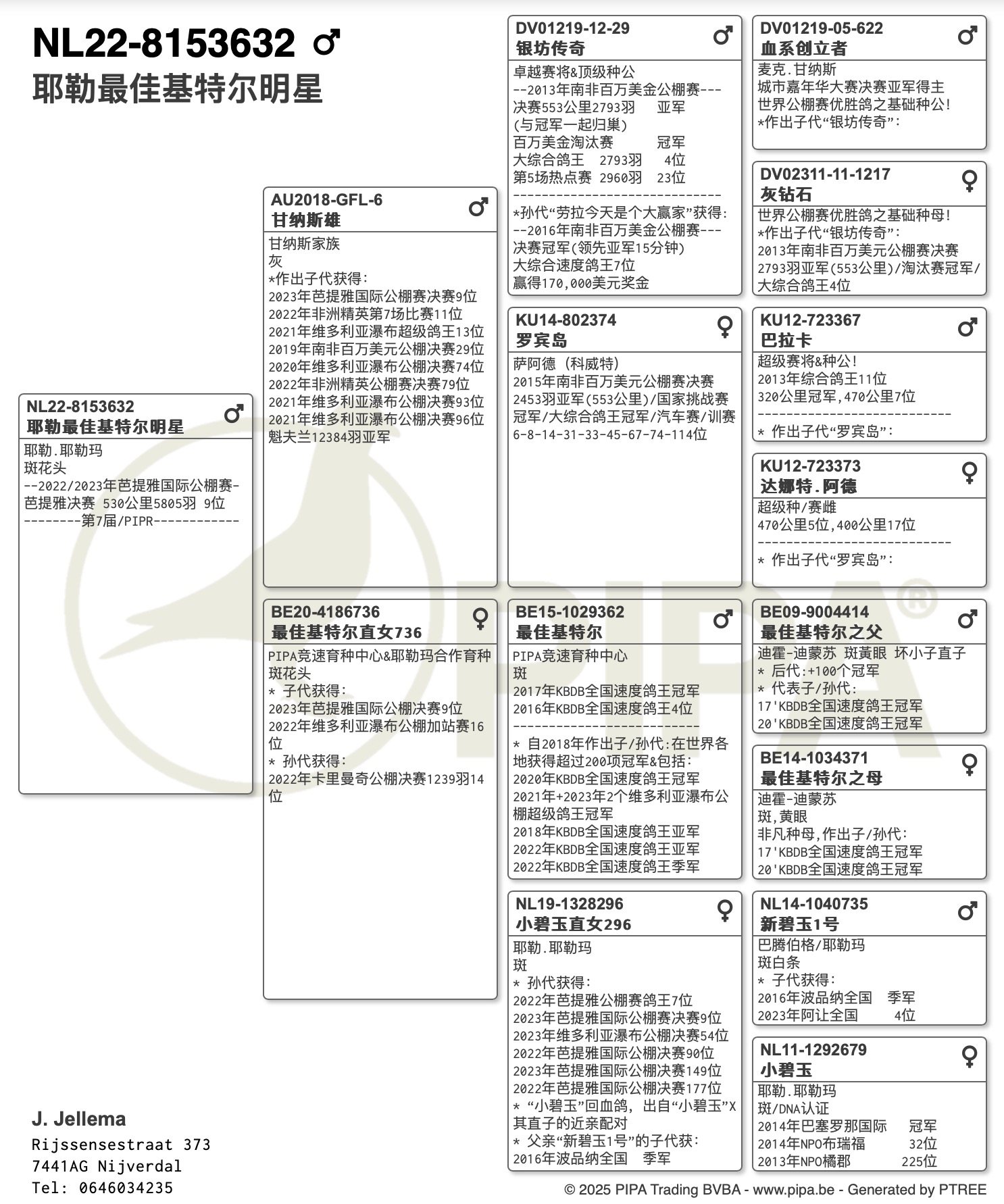 父亲:NL2022-8153632荷兰顶级名家!耶勒耶勒玛原棚!甘纳斯世界名鸽“银坊诉说”直孙!世界名鸽“最佳基特尔”外孙!