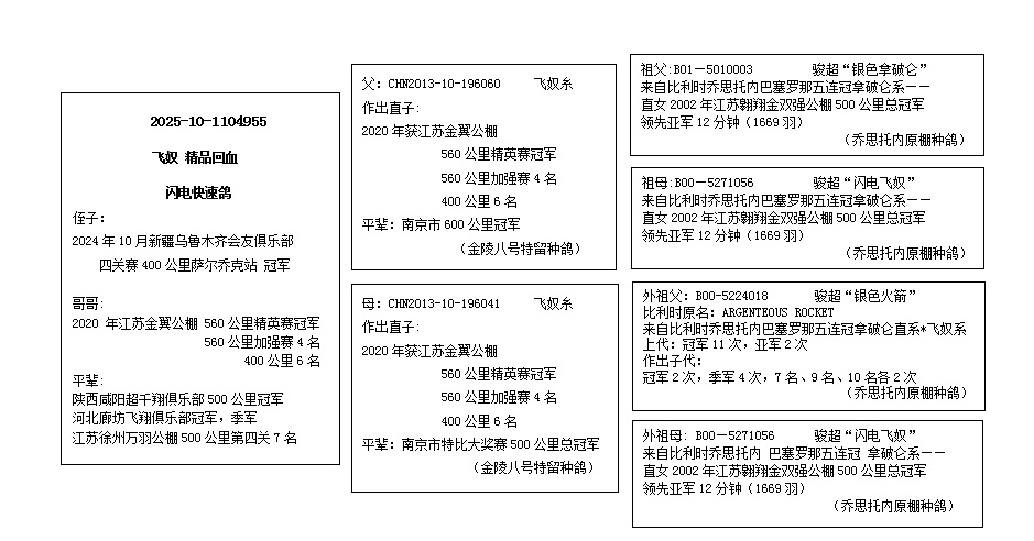 - 血统:比利时 乔思托内“飞奴精品回血” 快速鸽