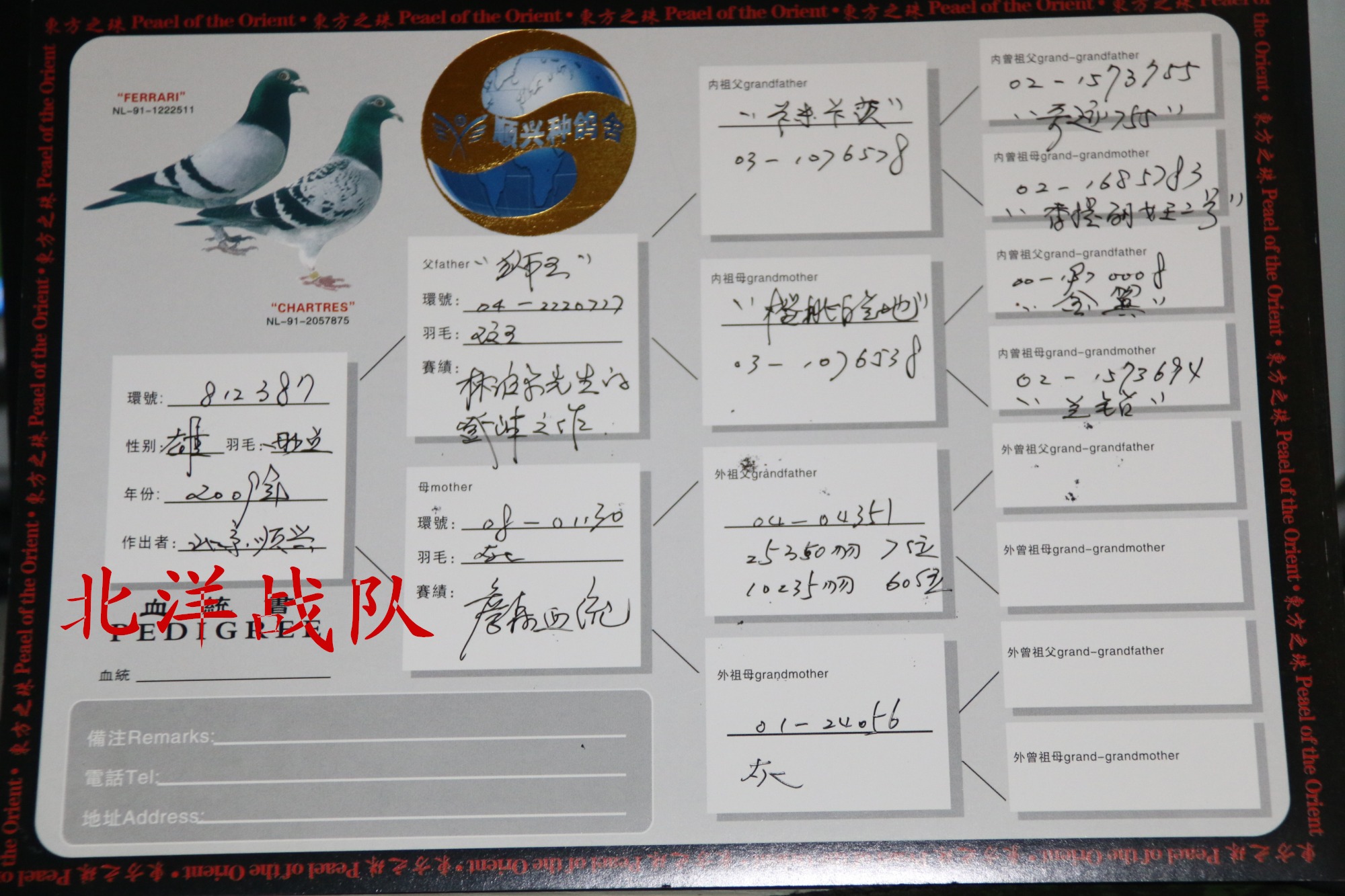 外曾祖父: 2000NL-1970008 林波尔大名鸽”金翼号”