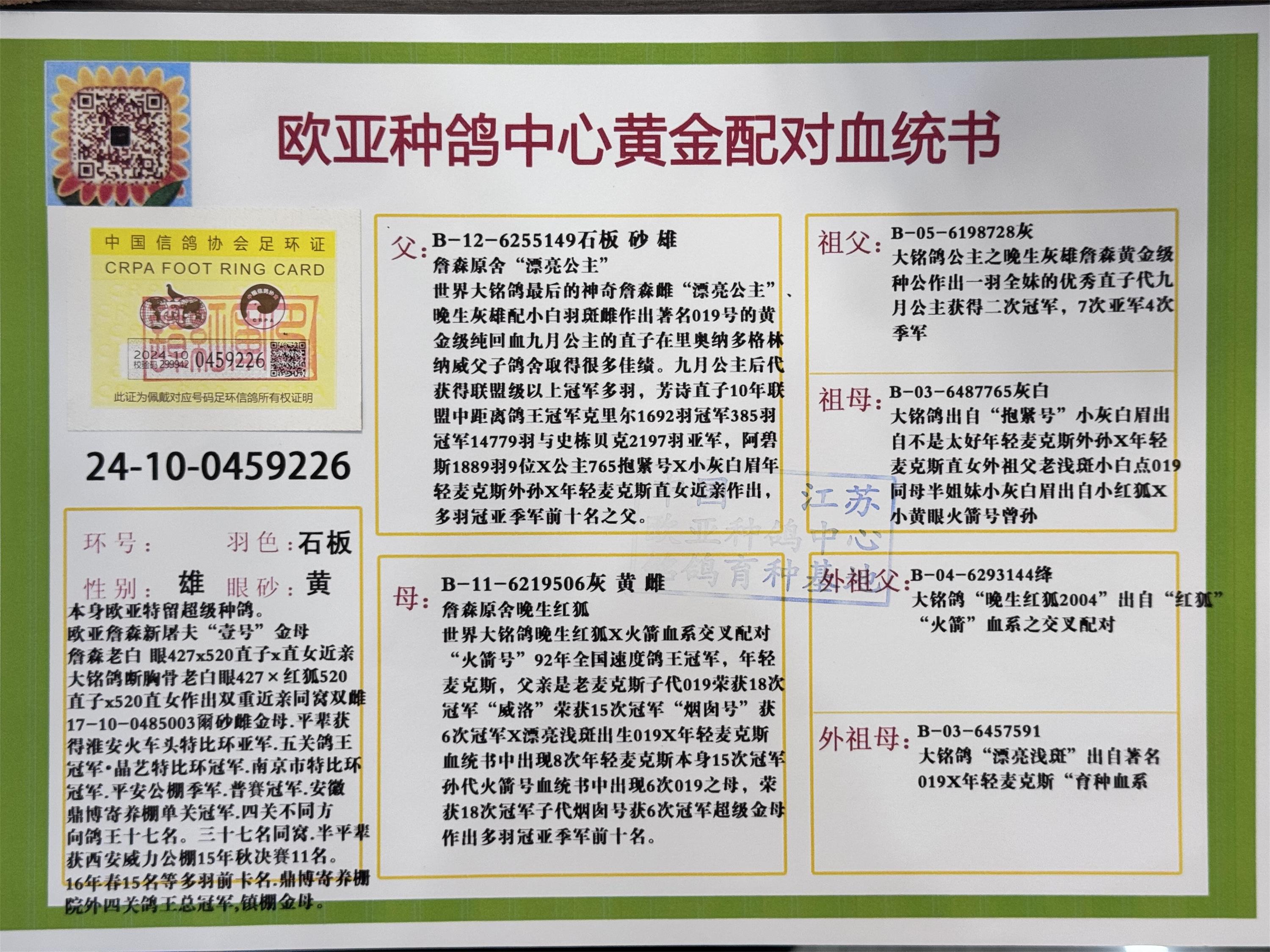 24年秋南京特比环欧亚荣获大团体冠军.小团体冠军551公里大特比13名.14名.16名.19名.20名.21名.24名.26名.27名.28名.42名.52名.54名.57名.65名.66名.68名.70名.71名.72名.74名.76名.80名.82名.83名.84名.85名.86名.90名.92名.110名.116名.121名.122名.128名.131名.158名.161名.164名.165名.166名.172名.174名.177名.182名.195名.196名.201名.205名.208名.210名.216名.253名.269名.275名.276名.294名.296名.299名,,24年秋云南天南铜都公棚决赛415名.天南铜都小棚决赛409名.云南玉活公棚决赛102名.490名.团体32名上笼二羽进二羽,天南铜都大棚506公里决赛445名。热烈祝贺河北省巨鹿县李兰生老师用欧亚泰山号血系连续十一年夺冠军,河北省国家赛冠军.全国季军等多次前十名高位,扬州王军王总用欧亚利奥24年春季获山东翔宇公棚决赛33名盖比53名。南京刘正龙刘总用欧亚盖比获得24年秋山东潍坊国际公棚决赛42名.精英赛30名.三关鸽王71名.决赛86名.加站赛16名.南京市特比环A组鸽王9名.B组鸽王5名.6名.C组鸽王5名.精英赛冠军4名.技能赛A组冠军4名.5名.秦淮区特比环荣获15名.46名.48名.87名。四川西昌徐亮徐总用欧亚利奥获得凉山州聚友决赛177名.第二关亚军双关鸽王19名.三关鸽王105名.云南豪庭公棚决赛603名。热烈祝贺24年四川重庆翔园鸽舍用欧亚泰山号荣获春季400公里冠军.秋季500公里冠军,河北王总用詹森X利奥获得千羽千翔公棚400公里冠军,广东蔡楷焕荣获24年秋爱好者 赛鸽俱乐部三关鸽王季军.一关420公里99名.二关450公里11名.三关520公里32名.单关季军.7名.12名,江西李卫兴荣获贵州红枫公棚8名.共翔俱乐部寄养棚四关综合鸽王30名.一关400公里78名.二关500公里55名.三关520公里37名.四关500公里57名.同父母获公棚18名.雷鸣获得武汉黄浦育翔中心冠军,四川陈文获得四川明鸿俱乐部300公里梦幻2名.3名.4名.9名.10名.13名.14名.15名.31名.34名.40名.41名.42名.43名.69名.71名.72名.73名.74名.94名.95名.97名.98名.99名.419公里决赛荣获总冠军7名.总共归巢9羽,四川徐亮获豪庭决赛603名,山西郑勇获得山西泰鑫公棚决赛255名詹森红狐,热烈祝贺马总获得开尔(飞跃队)决赛9名获奖金1310000万元.第一关52名,天津津福资赛180公里96名.获奖金429543万元,欧亚支持全国鸽友24年秋多人报喜 祝大家取得更好成绩,给欧亚报喜鸽友欧亚决定给每人赠送一羽超级种鸽。欧亚俱乐部特比环多关鸽王成绩:15年秋淮安特比环黑色星期一全会上笼9700多羽,当天无鸽归巢,第二天全会归巢357羽,本舍归巢158羽.前十名八羽.前一百名归巢57羽,16年春季获五关鸽王总冠军,总亚军四名.六名.七名.九名.十名.晶艺俱乐部520公里冠亚季军5名.6名.7名.9名.11名等,火车头冠军.季军6名.8名.9名.10名,16年秋晶艺俱乐部特比环520公里亚军.季军4名.6名.7名.9名,15年春南京白下特比环冠军.亚军.季军6名.7名.8名.9名.10名.指定鸽A B组获得冠军.亚军.季军4名.5名.,17年淮安特比环亚军.4名.5名.7名.8名.10名.六关鸽王总冠军.4名.6名.9名.10名,寄养棚宿迁刘总20羽特比环获冠军.季军.4名.7名.8名.9名等。18年荣获万羽特比环六关鸽王总冠军.总亚军.总季军.6名.8名.十名.单关四羽冠军.二羽亚军.四羽季军.前十名27羽。19年秋万羽特比环六关鸽王总亚军.总季军.5名.8名等,单关二羽冠军.三羽亚军.一羽季军前十名31羽。20年秋淮安市鸽会四关特比环大赛风雨无阻鸽王亚军.鸽王六名,金品俱乐部万羽特比环六关鸽王总冠军,总亚军.四名.五名.六名.七名.八名.十名.前二百名鸽王35羽,单关冠亚季军前十名四十多羽,火车头五关鸽王季军.六名.八名.前二百名鸽王十七羽。20年春荣获淮安五区一市四关鸽王总冠军.亚军.四名.八名.九名。21年秋荣获金品万羽特比环大赛六关鸽王总亚军.总季军.四名.七名.九名.十名.单关冠亚军季军前十名三十多羽。火车头协会鸽王六名.七名.十名.单关前十名十七羽。22年秋荣获鸽王总冠军.总亚军.5名.7名.8名.9名.11名.单关冠亚季军前十名三十多羽,第一关单关前二百名四十多羽,第二关前二百名三十多羽,第三关前二百名四十多羽,第四关前二百名四十多羽,第五关前一百名53羽。23年秋荣获鸽王季军.五名.八名.十名.13名.17名.20名.27名等多羽鸽王.单关前十名二十多羽。公棚.寄养棚部分成绩:16年秋宁夏黄河公棚总冠军电脑戈马力指定通炮冠军,17年送八羽参赛获得鸽王八名进奖四名,支持韩总荣获八名。支持鸽友荣获宁夏中卫公棚决赛总冠军.精英赛冠军,支持18年宁夏黄河公棚决赛冠军詹森X泰山。安徽鼎博寄养棚院内外四关鸽王总冠军.鸽王十七名.三十七名同窝,鸽王39名.42名.58名.67名。18年山东公棚预赛冠军.决赛65名.送八羽进奖五羽.指定获奔驰汽车一辆。支持鸽友获得云南蓝云公棚冠军.盖比X佛卡门。支持鸽友荣获云南银集公棚决赛冠军 詹森427X520血系 速度赛6700羽冠军。17年荣获金马俱乐部寄养棚四关鸽王总冠军.季军.六名.八名.第一关冠军.亚军.季军四名.七名.十一名.金牌教练奖。支持鸽友18年北京费翔公棚预赛九名电脑X桑杰士,支持鸽友荣获陕西威力公棚决赛11名.内蒙古临河寄养棚四关鸽王六名.詹森配泰山,支持河北王总用欧亚詹森427配胡本喜获20年秋开尔青年棚季军。云南东荣公棚16年预赛冠军.决赛77名.17年决赛12名.詹森红狐X泰山,17年平安公棚决赛4名 詹森427。欧亚获得21年金母寄养棚第一关四名.第二关5名.第三关5名.6名.7名.10名.三关鸽王总冠军,四关鸽王14名.十羽鸽王。支持河
