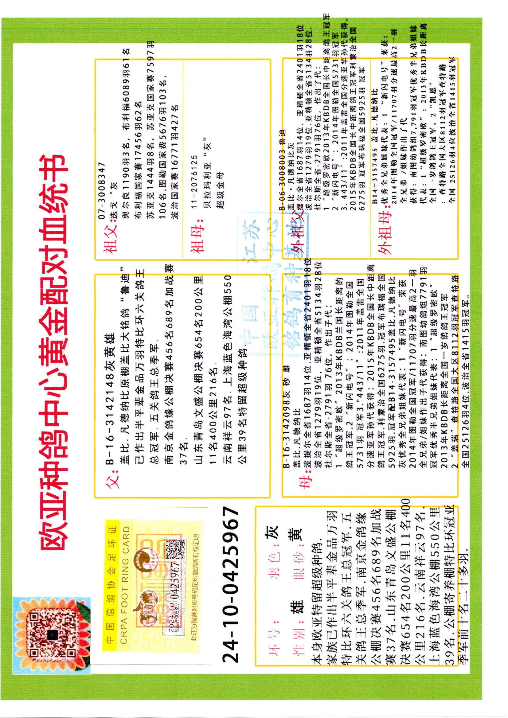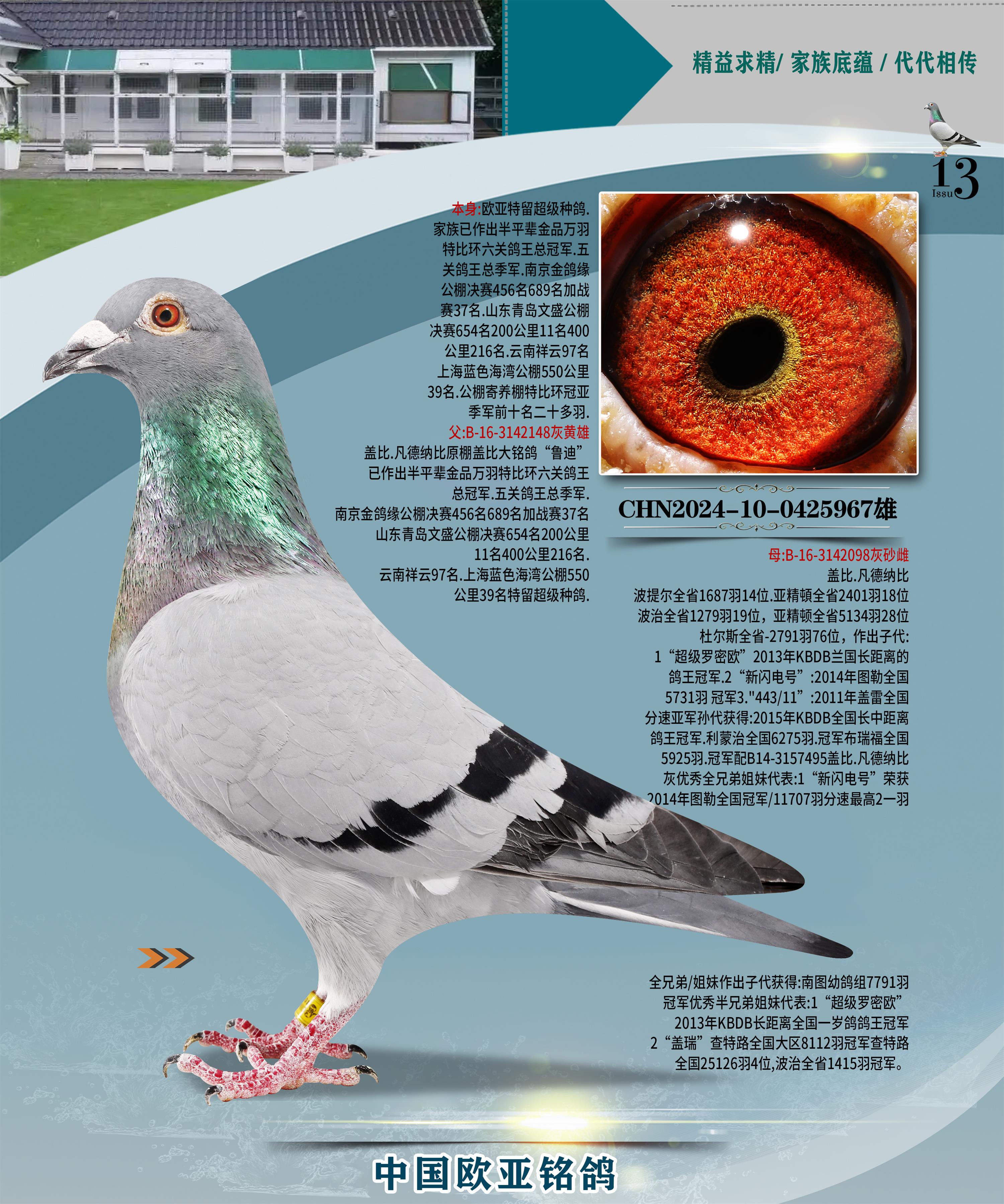 24年秋南京特比环欧亚荣获大团体冠军.小团体冠军551公里大特比13名.14名.16名.19名.20名.21名.24名.26名.27名.28名.42名.52名.54名.57名.65名.66名.68名.70名.71名.72名.74名.76名.80名.82名.83名.84名.85名.86名.90名.92名.110名.116名.121名.122名.128名.131名.158名.161名.164名.165名.166名.172名.174名.177名.182名.195名.196名.201名.205名.208名.210名.216名.253名.269名.275名.276名.294名.296名.299名,,24年秋云南天南铜都公棚决赛415名.天南铜都小棚决赛409名.云南玉活公棚决赛102名.490名.团体32名上笼二羽进二羽,天南铜都大棚506公里决赛445名。热烈祝贺河北省巨鹿县李兰生老师用欧亚泰山号血系连续十一年夺冠军,河北省国家赛冠军.全国季军等多次前十名高位,扬州王军王总用欧亚利奥24年春季获山东翔宇公棚决赛33名盖比53名。南京刘正龙刘总用欧亚盖比获得24年秋山东潍坊国际公棚决赛42名.精英赛30名.三关鸽王71名.决赛86名.加站赛16名.南京市特比环A组鸽王9名.B组鸽王5名.6名.C组鸽王5名.精英赛冠军4名.技能赛A组冠军4名.5名.秦淮区特比环荣获15名.46名.48名.87名。四川西昌徐亮徐总用欧亚利奥获得凉山州聚友决赛177名.第二关亚军双关鸽王19名.三关鸽王105名.云南豪庭公棚决赛603名。热烈祝贺24年四川重庆翔园鸽舍用欧亚泰山号荣获春季400公里冠军.秋季500公里冠军,河北王总用詹森X利奥获得千羽千翔公棚400公里冠军,广东蔡楷焕荣获24年秋爱好者 赛鸽俱乐部三关鸽王季军.一关420公里99名.二关450公里11名.三关520公里32名.单关季军.7名.12名,江西李卫兴荣获贵州红枫公棚8名.共翔俱乐部寄养棚四关综合鸽王30名.一关400公里78名.二关500公里55名.三关520公里37名.四关500公里57名.同父母获公棚18名.雷鸣获得武汉黄浦育翔中心冠军,四川陈文获得四川明鸿俱乐部300公里梦幻2名.3名.4名.9名.10名.13名.14名.15名.31名.34名.40名.41名.42名.43名.69名.71名.72名.73名.74名.94名.95名.97名.98名.99名.419公里决赛荣获总冠军7名.总共归巢9羽,四川徐亮获豪庭决赛603名,山西郑勇获得山西泰鑫公棚决赛255名詹森红狐,热烈祝贺马总获得开尔(飞跃队)决赛9名获奖金1310000万元.第一关52名,天津津福资赛180公里96名.获奖金429543万元,欧亚支持全国鸽友24年秋多人报喜 祝大家取得更好成绩,给欧亚报喜鸽友欧亚决定给每人赠送一羽超级种鸽。欧亚俱乐部特比环多关鸽王成绩:15年秋淮安特比环黑色星期一全会上笼9700多羽,当天无鸽归巢,第二天全会归巢357羽,本舍归巢158羽.前十名八羽.前一百名归巢57羽,16年春季获五关鸽王总冠军,总亚军四名.六名.七名.九名.十名.晶艺俱乐部520公里冠亚季军5名.6名.7名.9名.11名等,火车头冠军.季军6名.8名.9名.10名,16年秋晶艺俱乐部特比环520公里亚军.季军4名.6名.7名.9名,15年春南京白下特比环冠军.亚军.季军6名.7名.8名.9名.10名.指定鸽A B组获得冠军.亚军.季军4名.5名.,17年淮安特比环亚军.4名.5名.7名.8名.10名.六关鸽王总冠军.4名.6名.9名.10名,寄养棚宿迁刘总20羽特比环获冠军.季军.4名.7名.8名.9名等。18年荣获万羽特比环六关鸽王总冠军.总亚军.总季军.6名.8名.十名.单关四羽冠军.二羽亚军.四羽季军.前十名27羽。19年秋万羽特比环六关鸽王总亚军.总季军.5名.8名等,单关二羽冠军.三羽亚军.一羽季军前十名31羽。20年秋淮安市鸽会四关特比环大赛风雨无阻鸽王亚军.鸽王六名,金品俱乐部万羽特比环六关鸽王总冠军,总亚军.四名.五名.六名.七名.八名.十名.前二百名鸽王35羽,单关冠亚季军前十名四十多羽,火车头五关鸽王季军.六名.八名.前二百名鸽王十七羽。20年春荣获淮安五区一市四关鸽王总冠军.亚军.四名.八名.九名。21年秋荣获金品万羽特比环大赛六关鸽王总亚军.总季军.四名.七名.九名.十名.单关冠亚军季军前十名三十多羽。火车头协会鸽王六名.七名.十名.单关前十名十七羽。22年秋荣获鸽王总冠军.总亚军.5名.7名.8名.9名.11名.单关冠亚季军前十名三十多羽,第一关单关前二百名四十多羽,第二关前二百名三十多羽,第三关前二百名四十多羽,第四关前二百名四十多羽,第五关前一百名53羽。23年秋荣获鸽王季军.五名.八名.十名.13名.17名.20名.27名等多羽鸽王.单关前十名二十多羽。公棚.寄养棚部分成绩:16年秋宁夏黄河公棚总冠军电脑戈马力指定通炮冠军,17年送八羽参赛获得鸽王八名进奖四名,支持韩总荣获八名。支持鸽友荣获宁夏中卫公棚决赛总冠军.精英赛冠军,支持18年宁夏黄河公棚决赛冠军詹森X泰山。安徽鼎博寄养棚院内外四关鸽王总冠军.鸽王十七名.三十七名同窝,鸽王39名.42名.58名.67名。18年山东公棚预赛冠军.决赛65名.送八羽进奖五羽.指定获奔驰汽车一辆。支持鸽友获得云南蓝云公棚冠军.盖比X佛卡门。支持鸽友荣获云南银集公棚决赛冠军 詹森427X520血系 速度赛6700羽冠军。17年荣获金马俱乐部寄养棚四关鸽王总冠军.季军.六名.八名.第一关冠军.亚军.季军四名.七名.十一名.金牌教练奖。支持鸽友18年北京费翔公棚预赛九名电脑X桑杰士,支持鸽友荣获陕西威力公棚决赛11名.内蒙古临河寄养棚四关鸽王六名.詹森配泰山,支持河北王总用欧亚詹森427配胡本喜获20年秋开尔青年棚季军。云南东荣公棚16年预赛冠军.决赛77名.17年决赛12名.詹森红狐X泰山,17年平安公棚决赛4名 詹森427。欧亚获得21年金母寄养棚第一关四名.第二关5名.第三关5名.6名.7名.10名.三关鸽王总冠军,四关鸽王14名.十羽鸽王。支持河